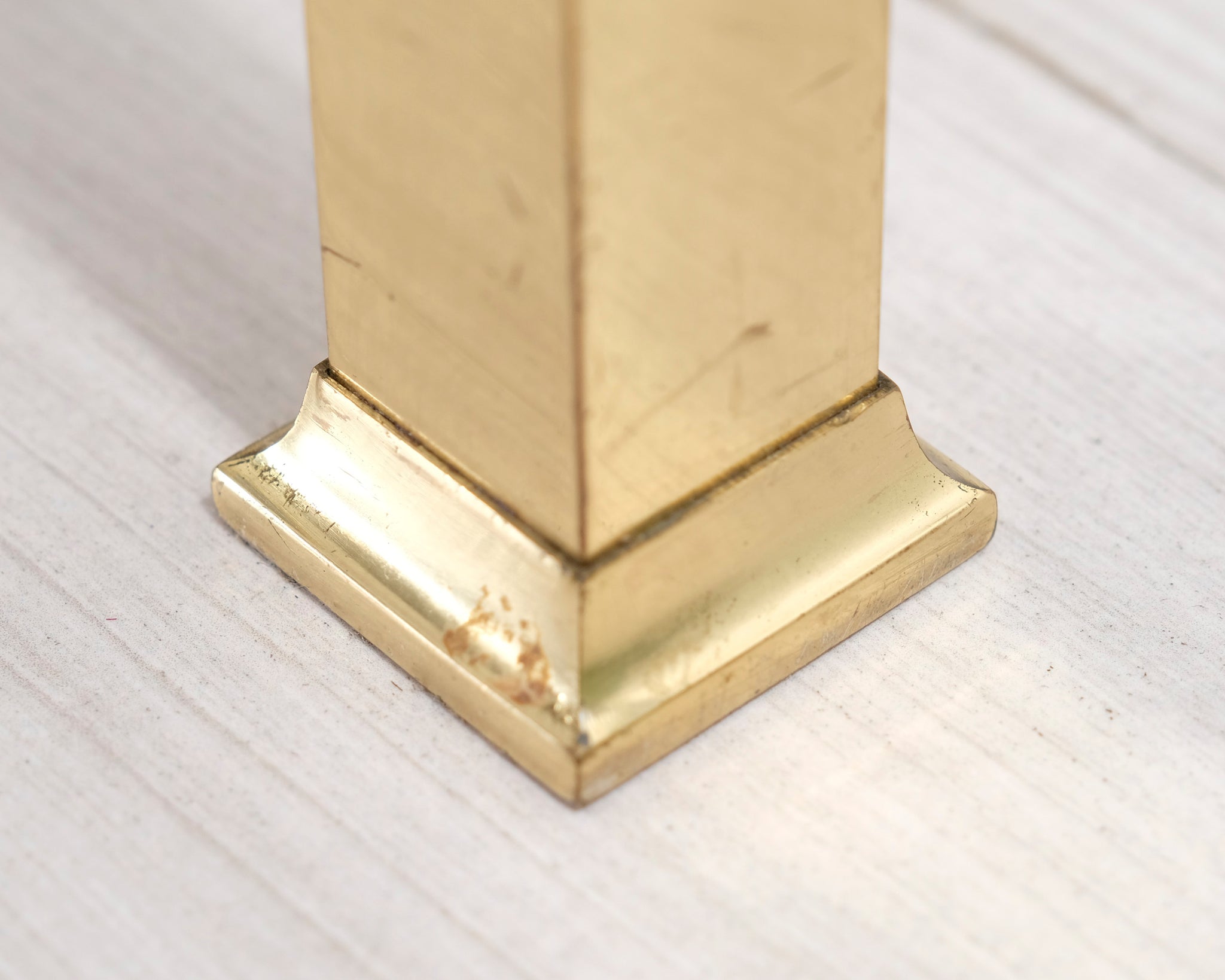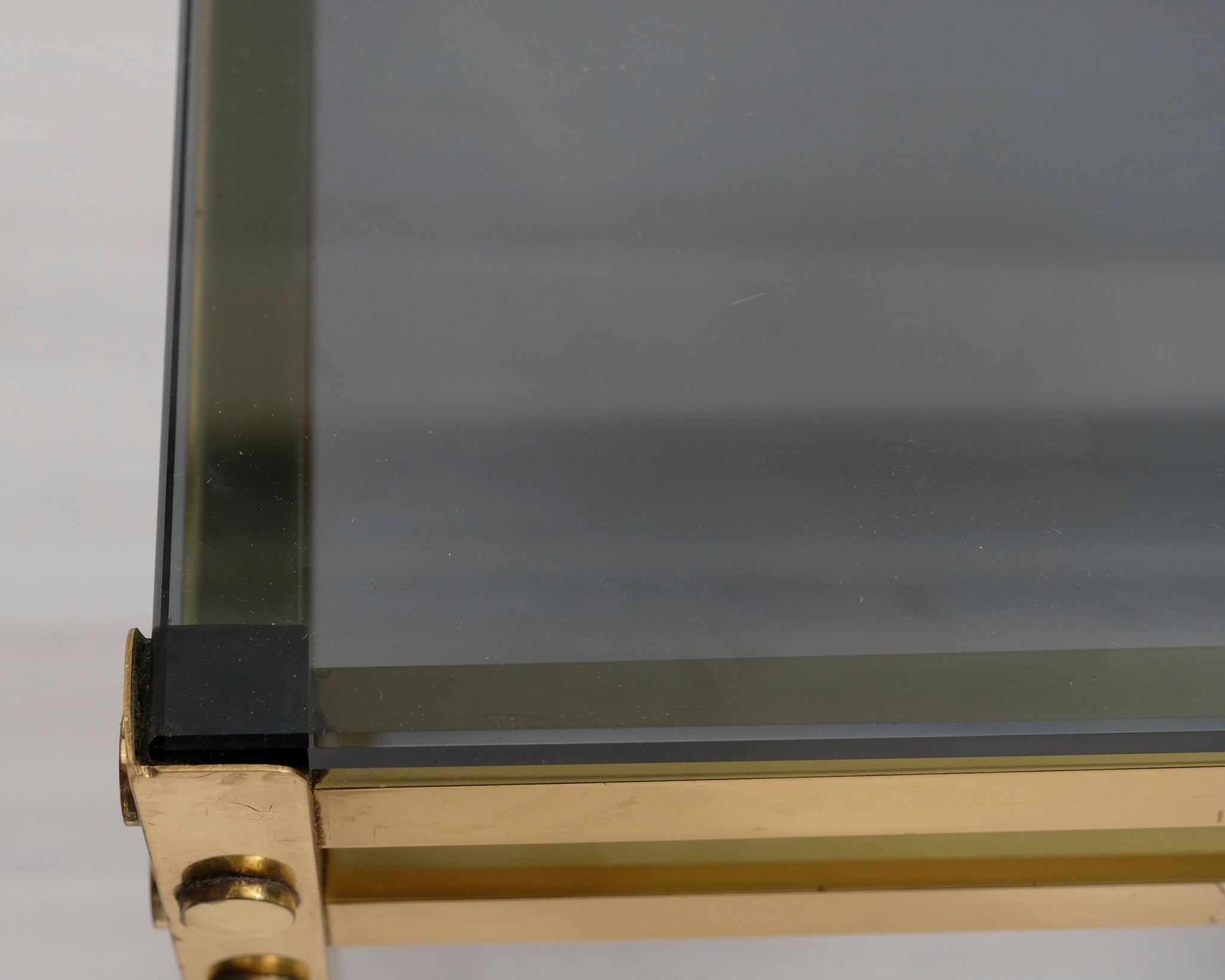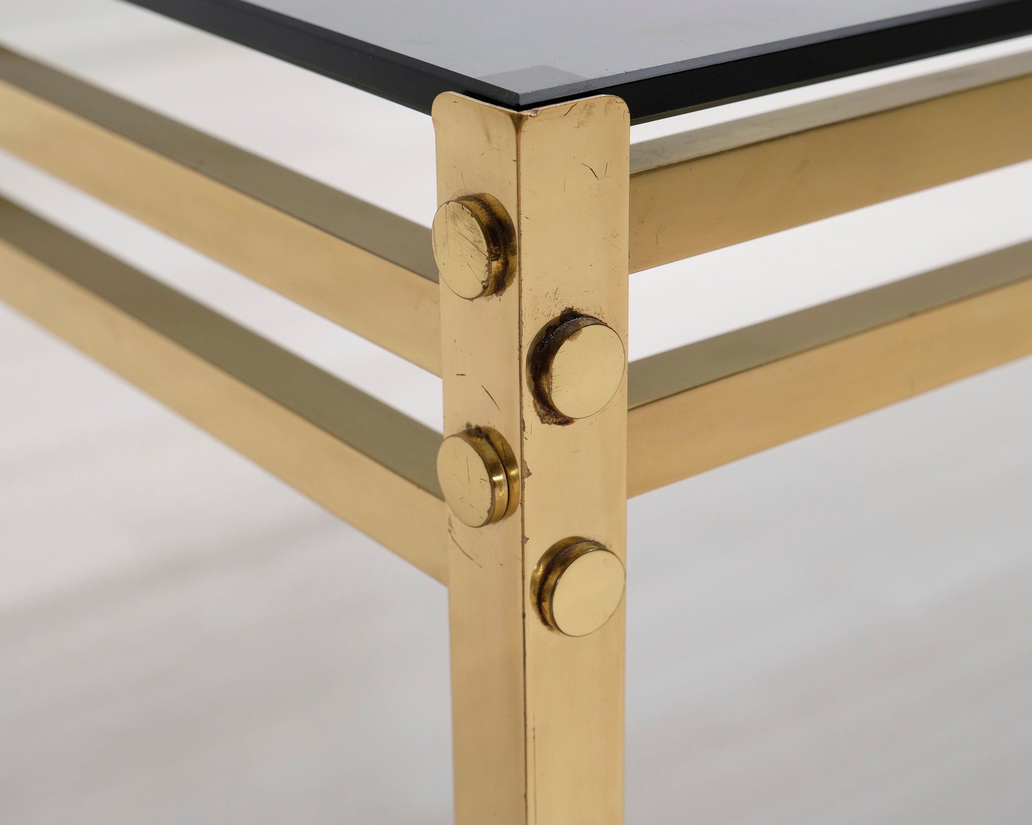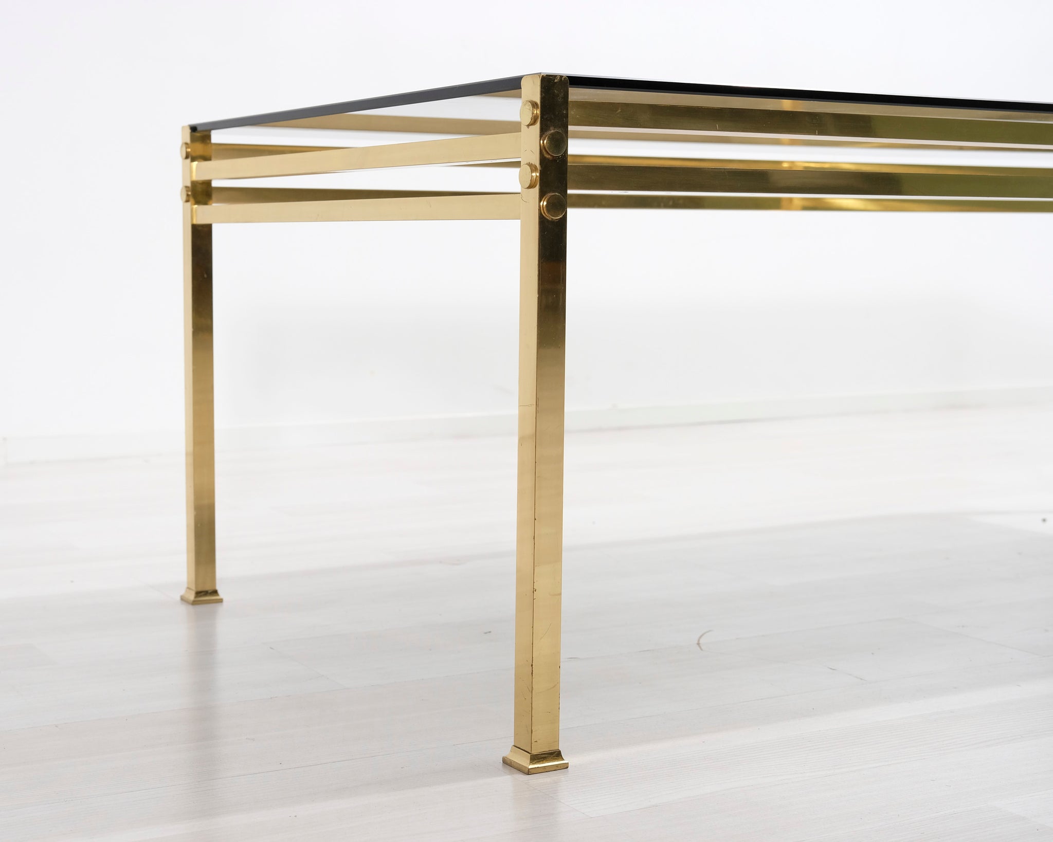 Messinkiruonkoinen sohvapöytä. Savulasista valmistettu pöytälevy. Valmistettu 1960-luvulla.