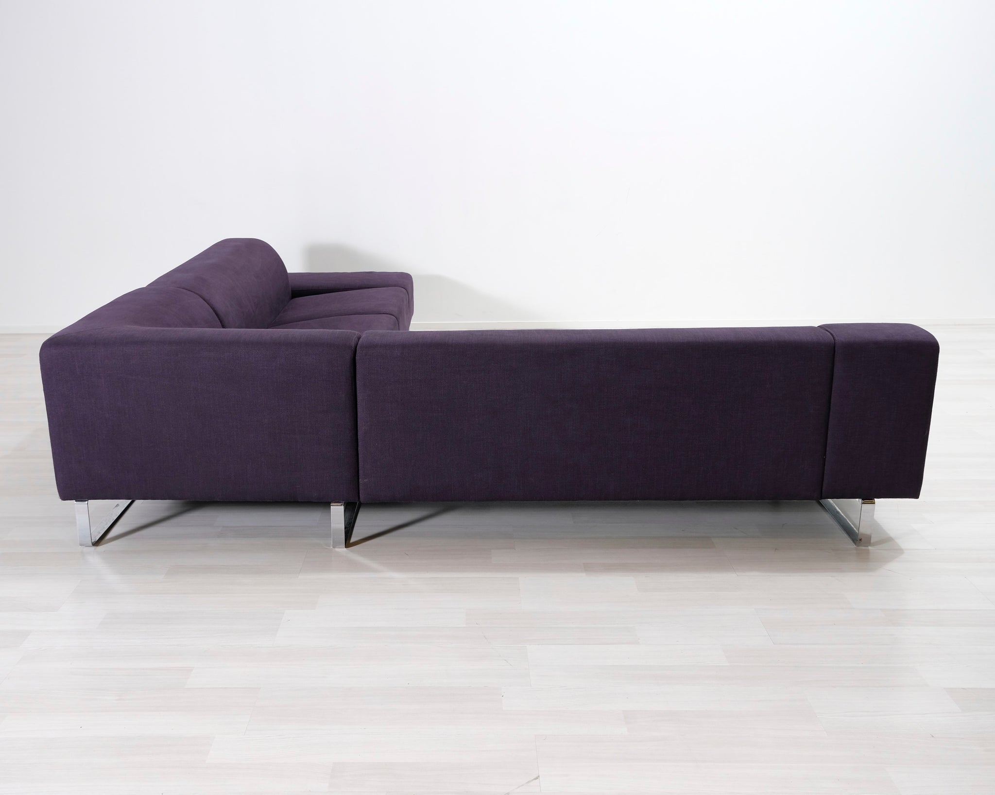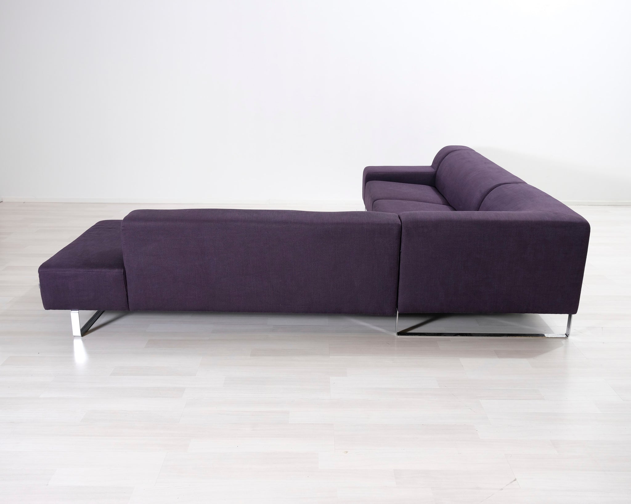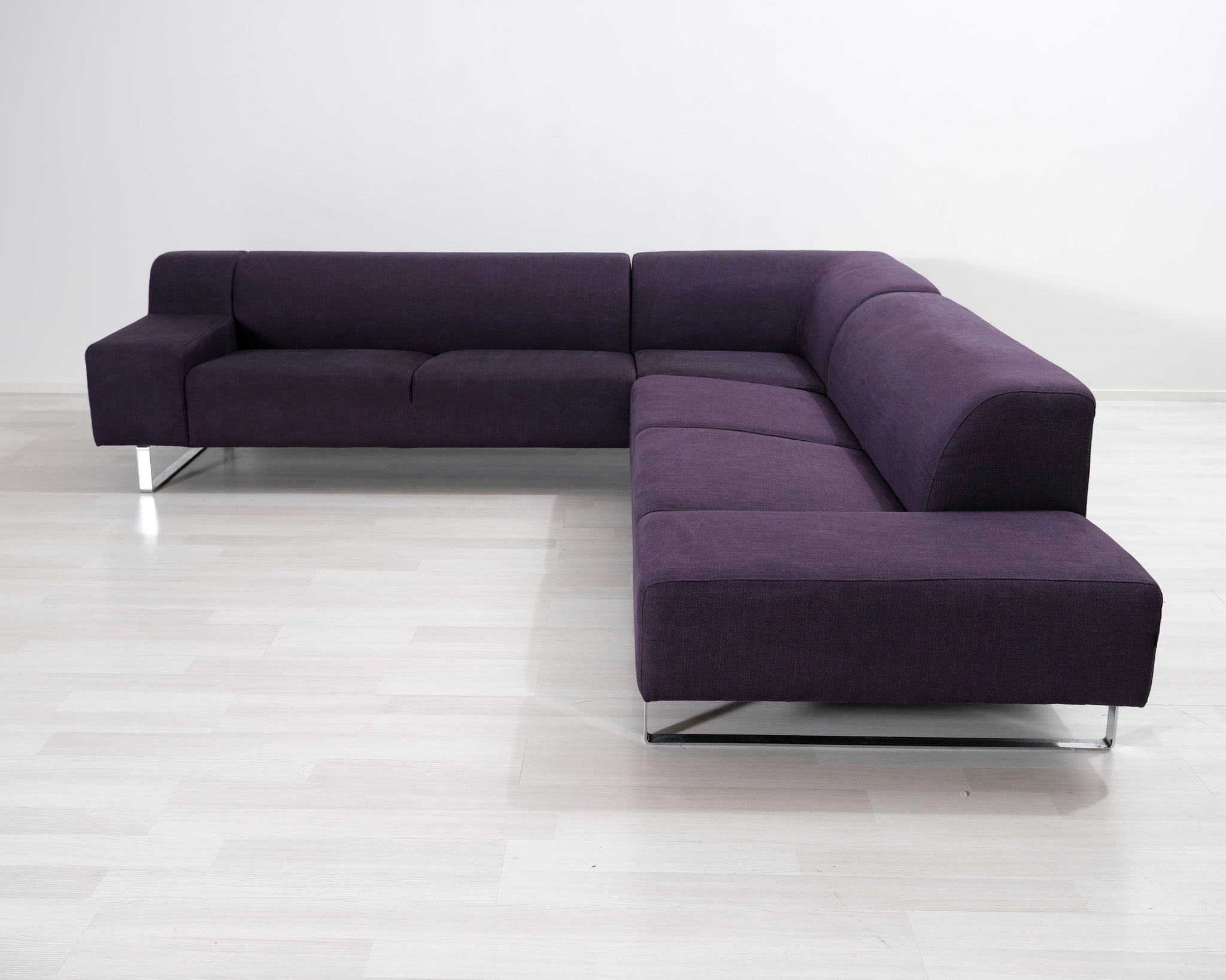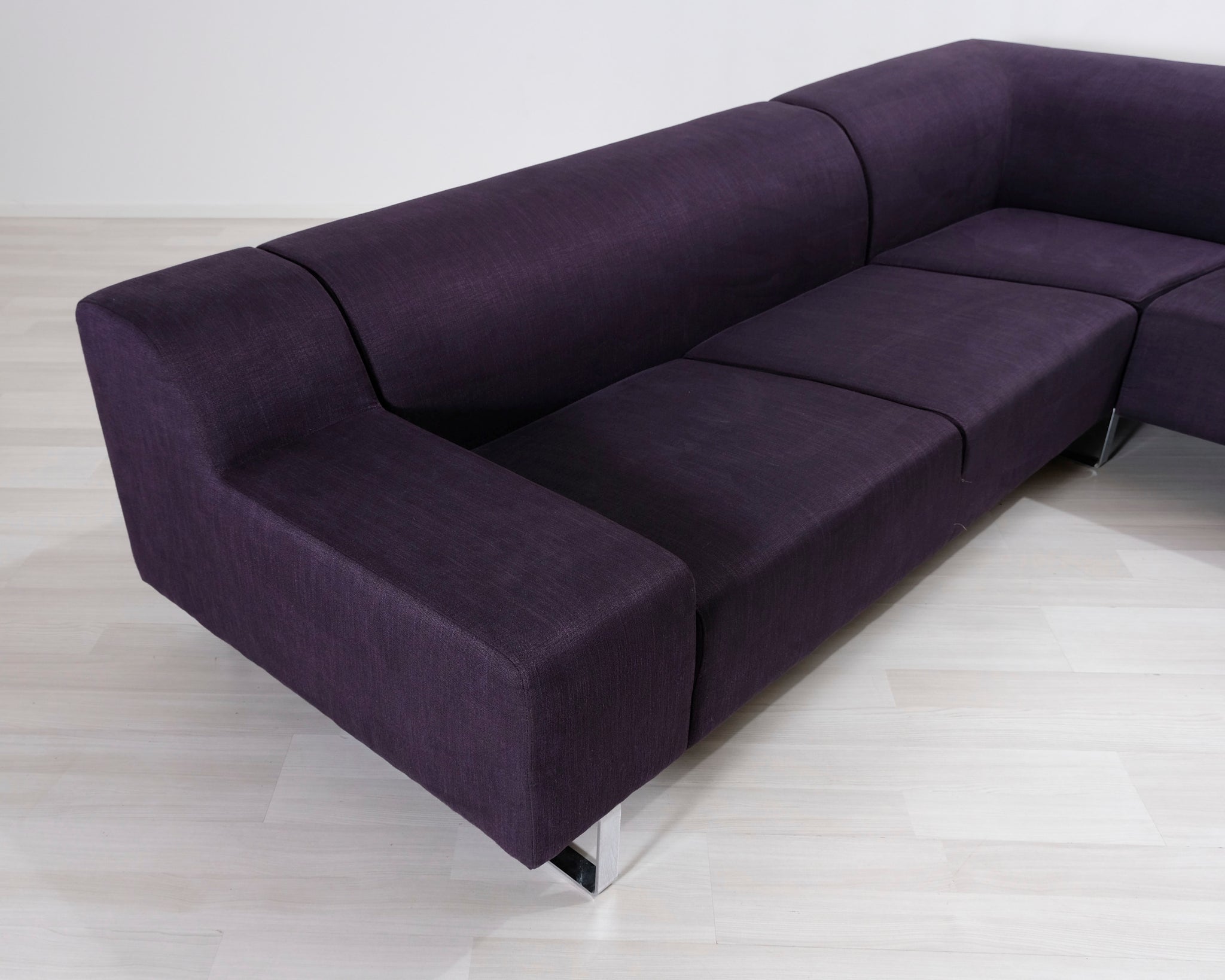 Avokulmasohva mustalla kankaalla ja metallijaloilla.