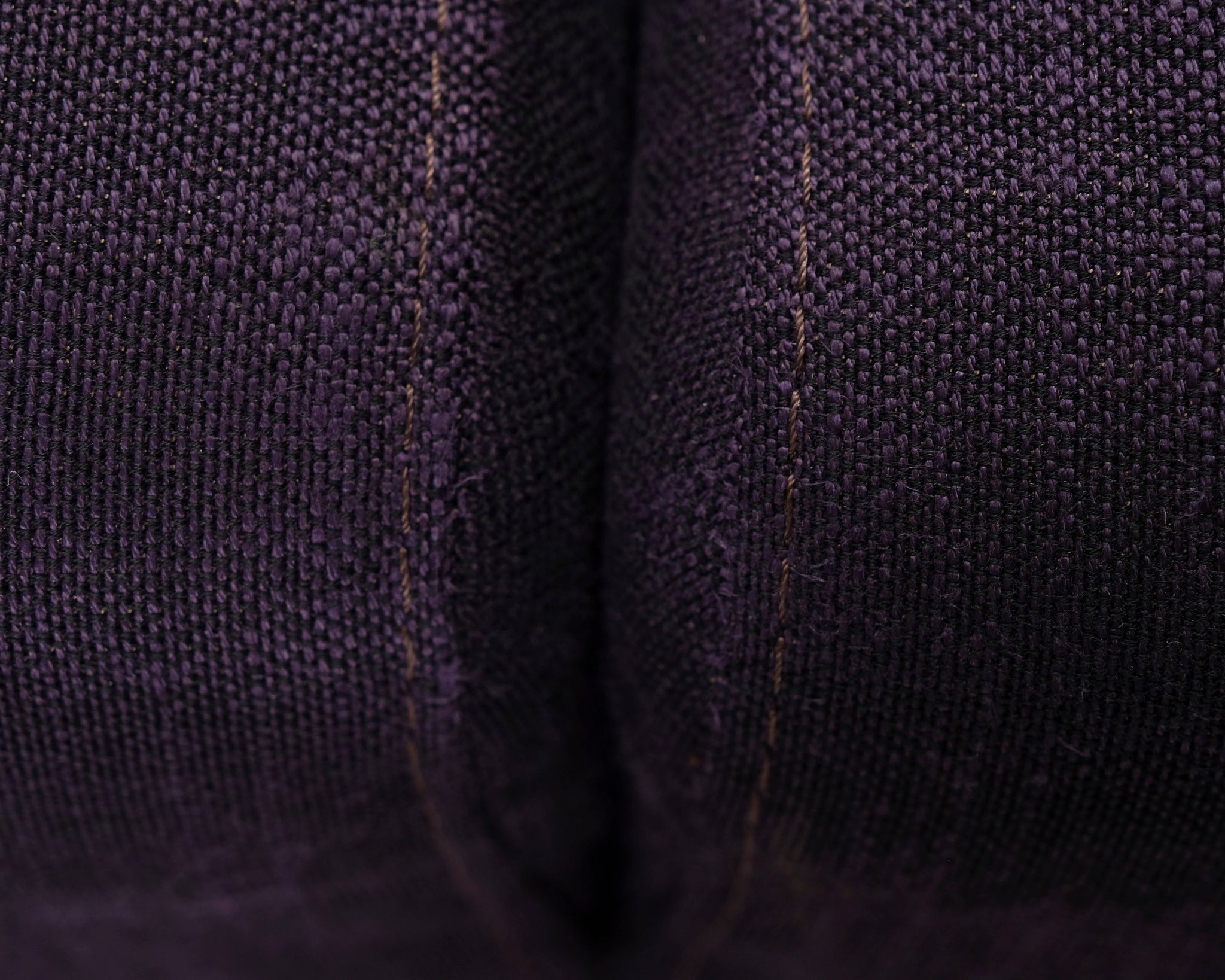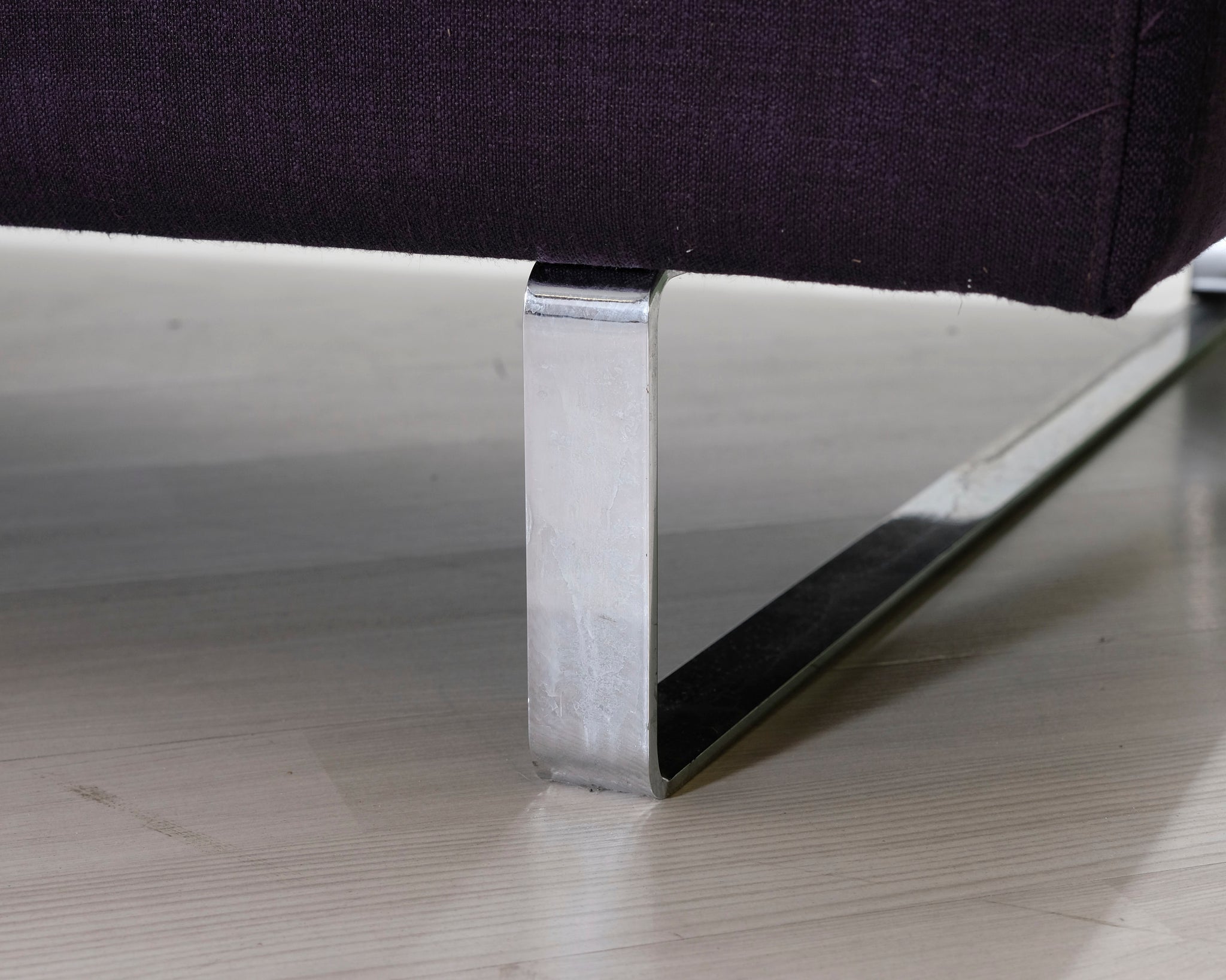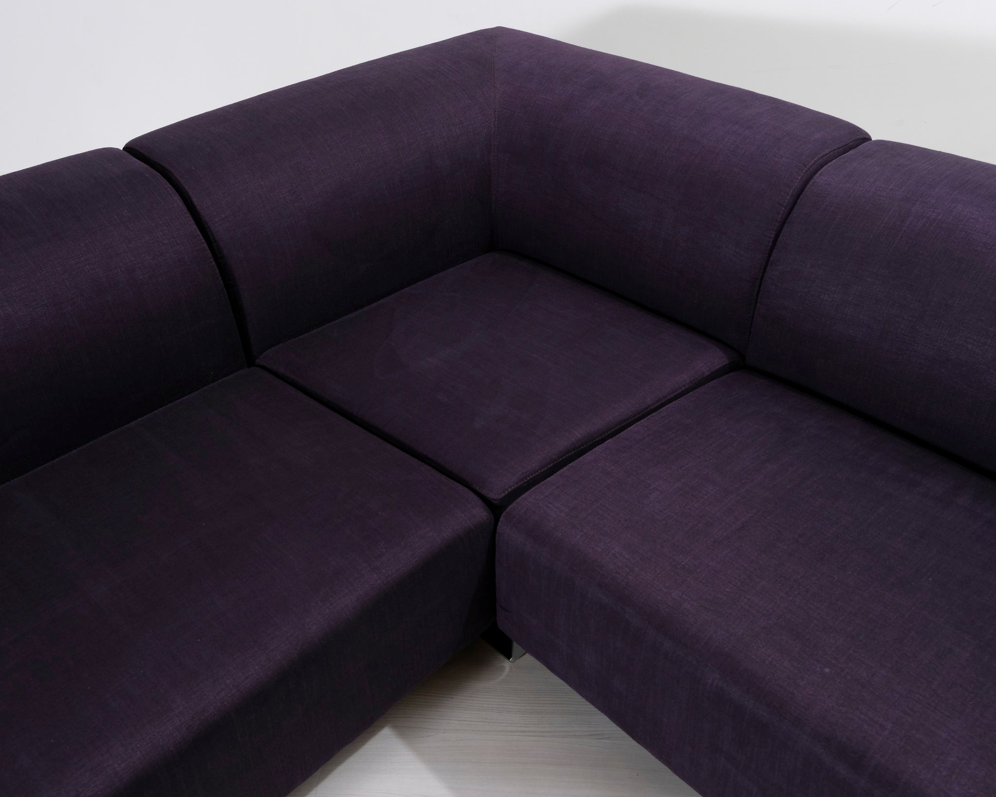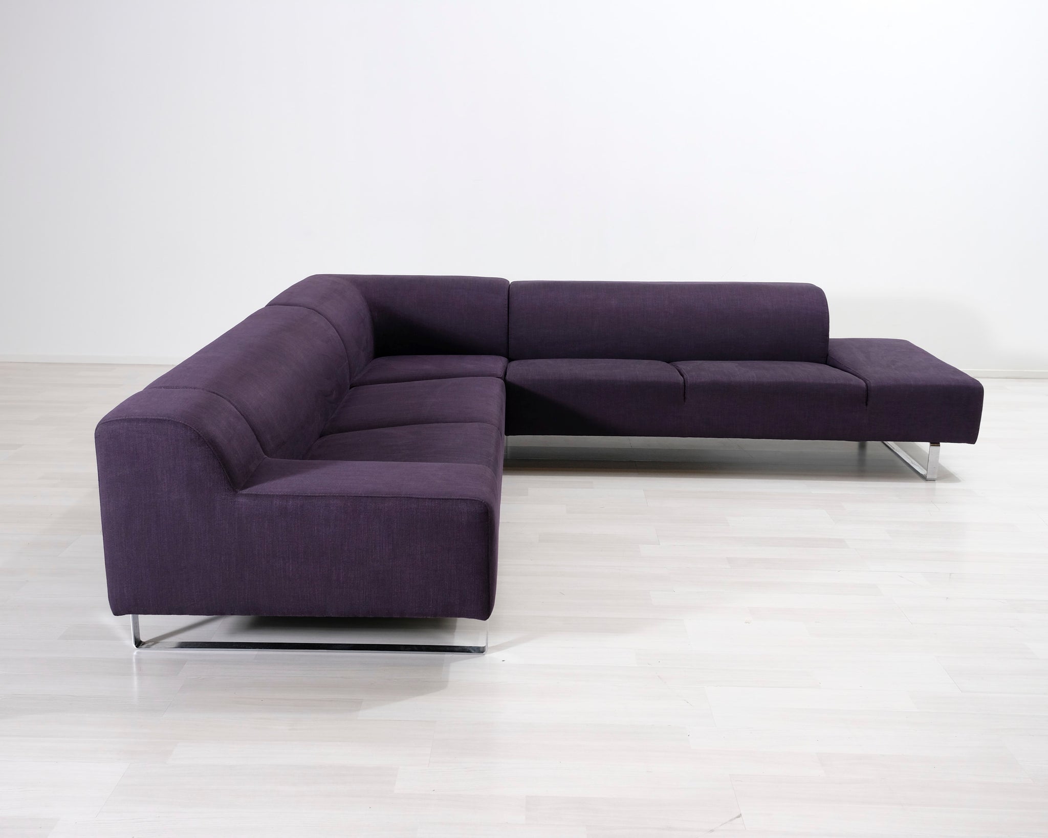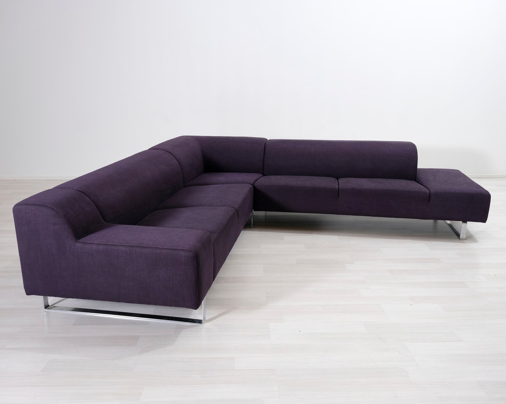 Avokulmasohva mustalla kankaalla ja metallijaloilla.