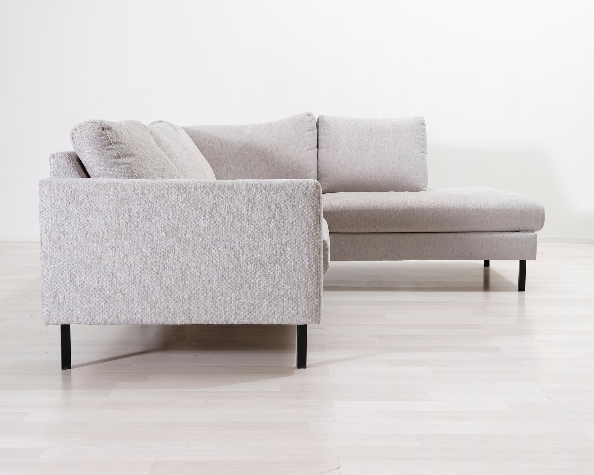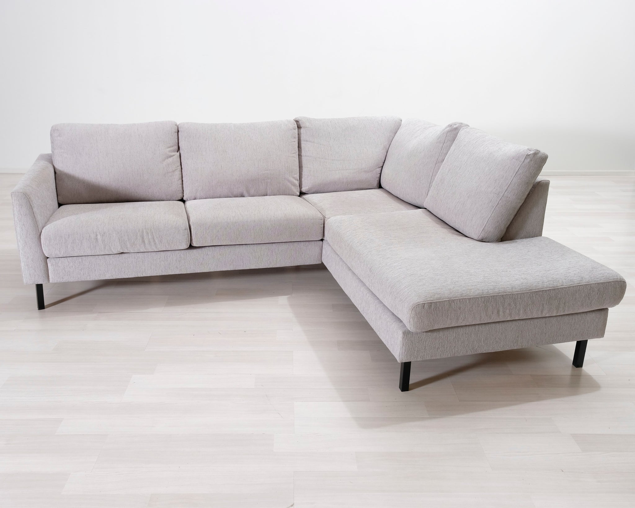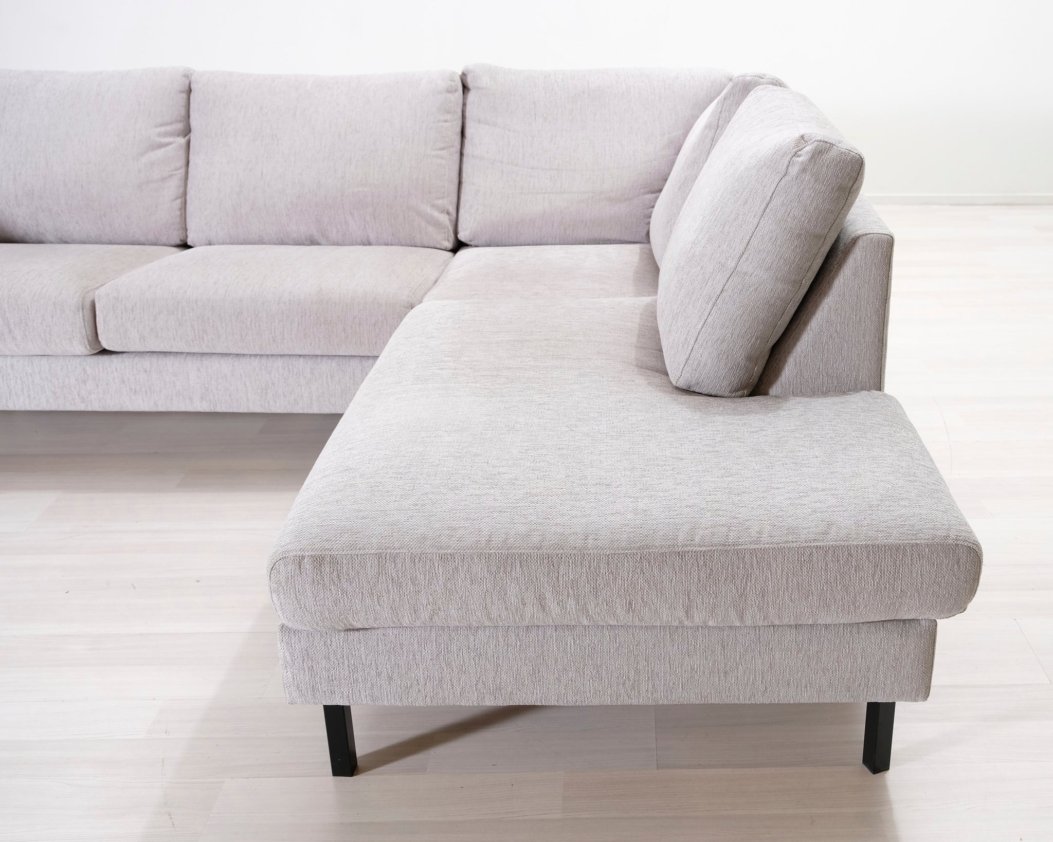 Neljän istuttava kulmasohva vaaleanharmaala kangasverhoilulla. Reilu avokulma antaa sohvalle rennon ulkomuodon. Istuin- ja selkätyynyjen päälliset ovat irrotettavat ja konepestävät.