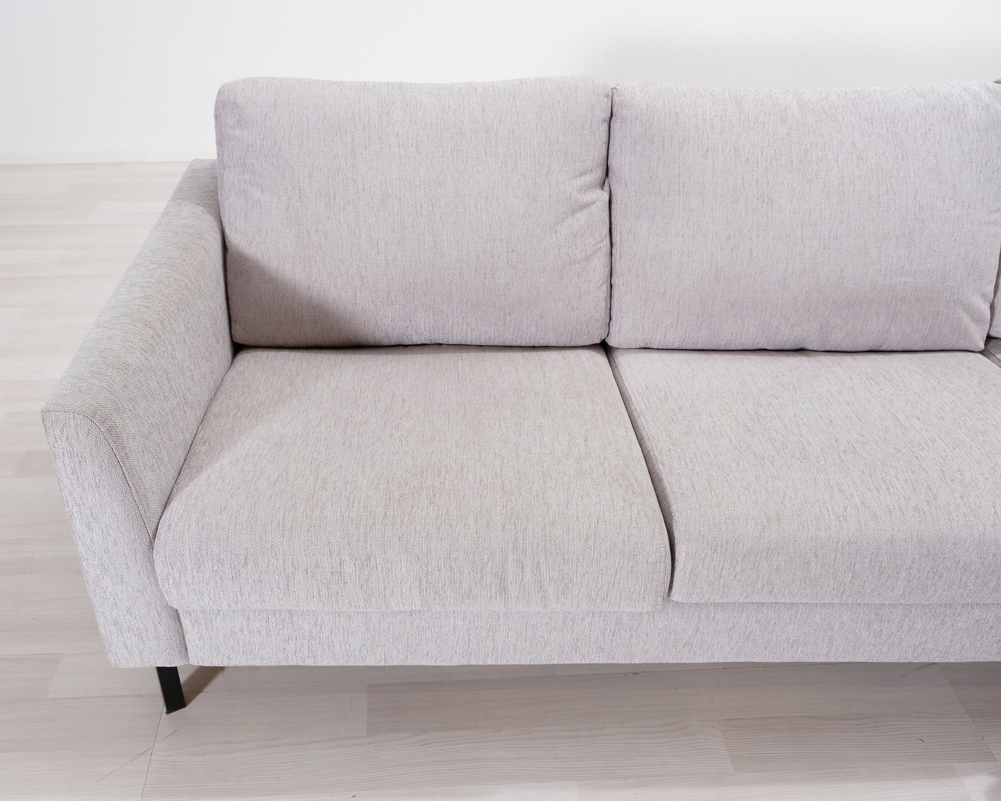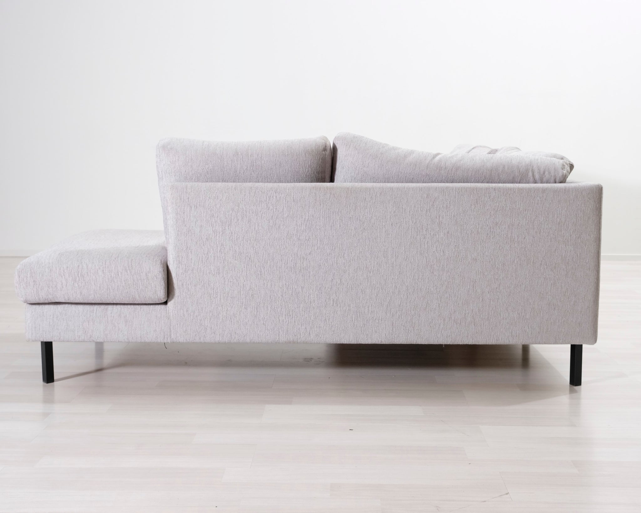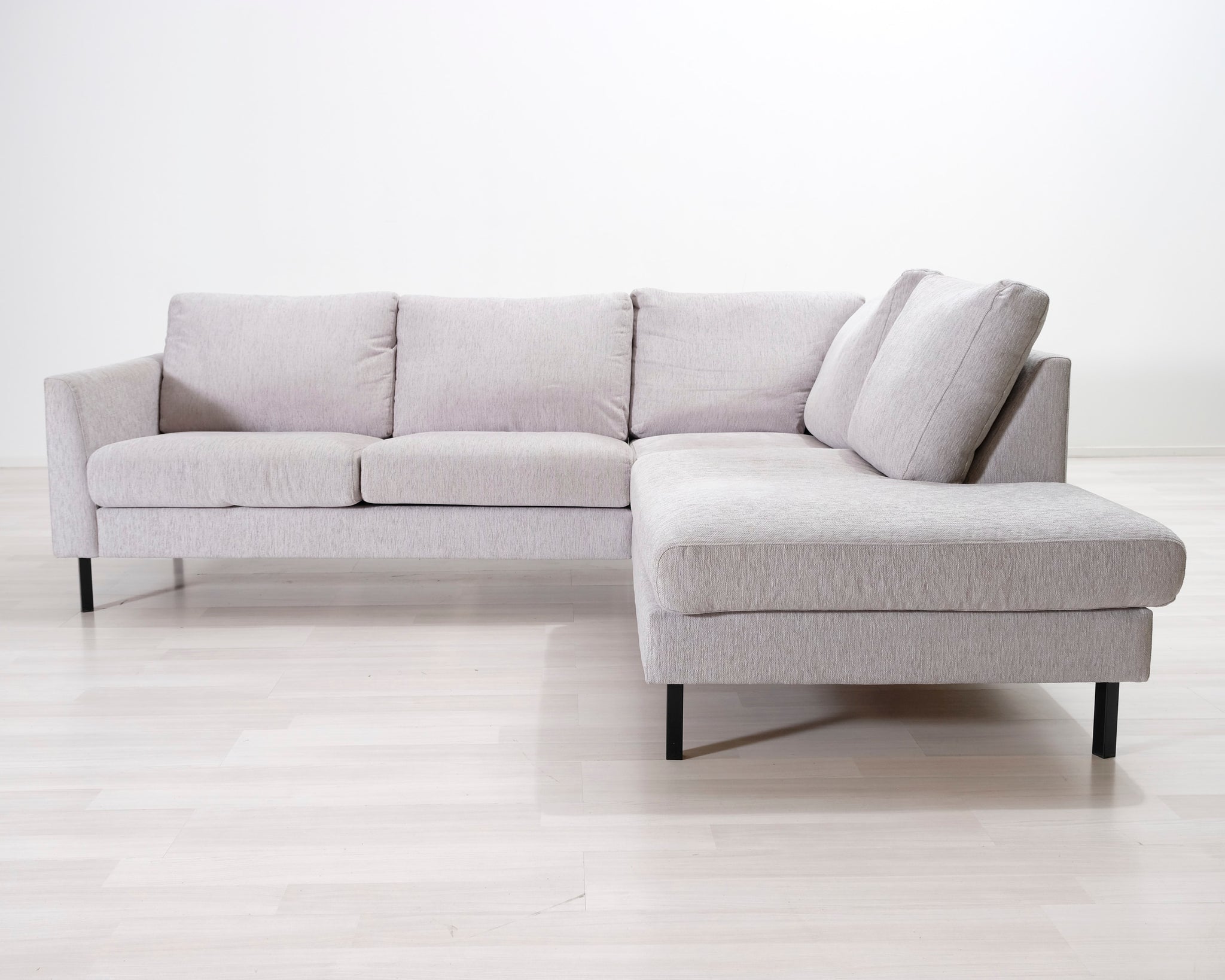 Neljän istuttava kulmasohva vaaleanharmaala kangasverhoilulla. Reilu avokulma antaa sohvalle rennon ulkomuodon. Istuin- ja selkätyynyjen päälliset ovat irrotettavat ja konepestävät.