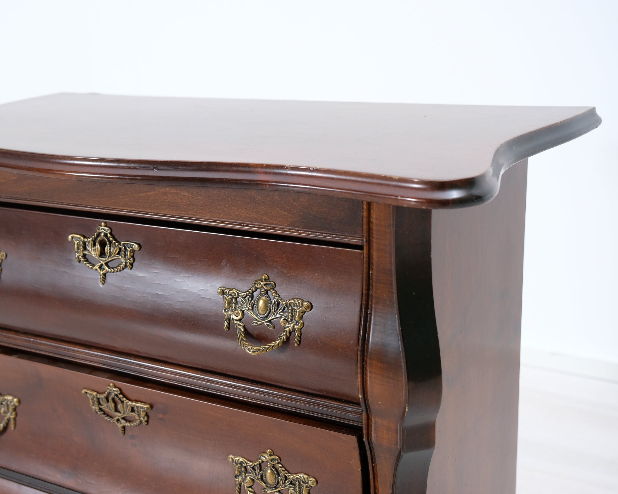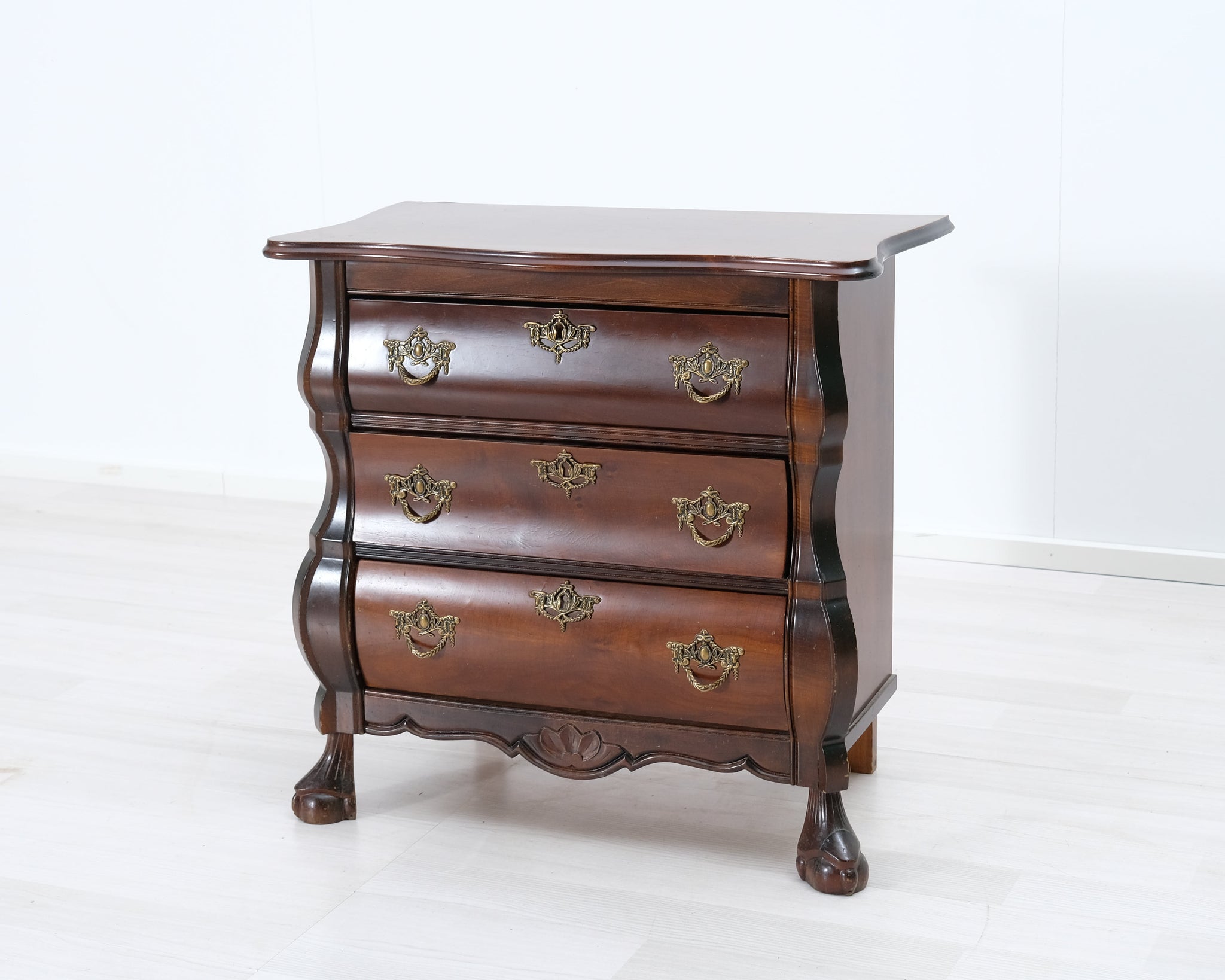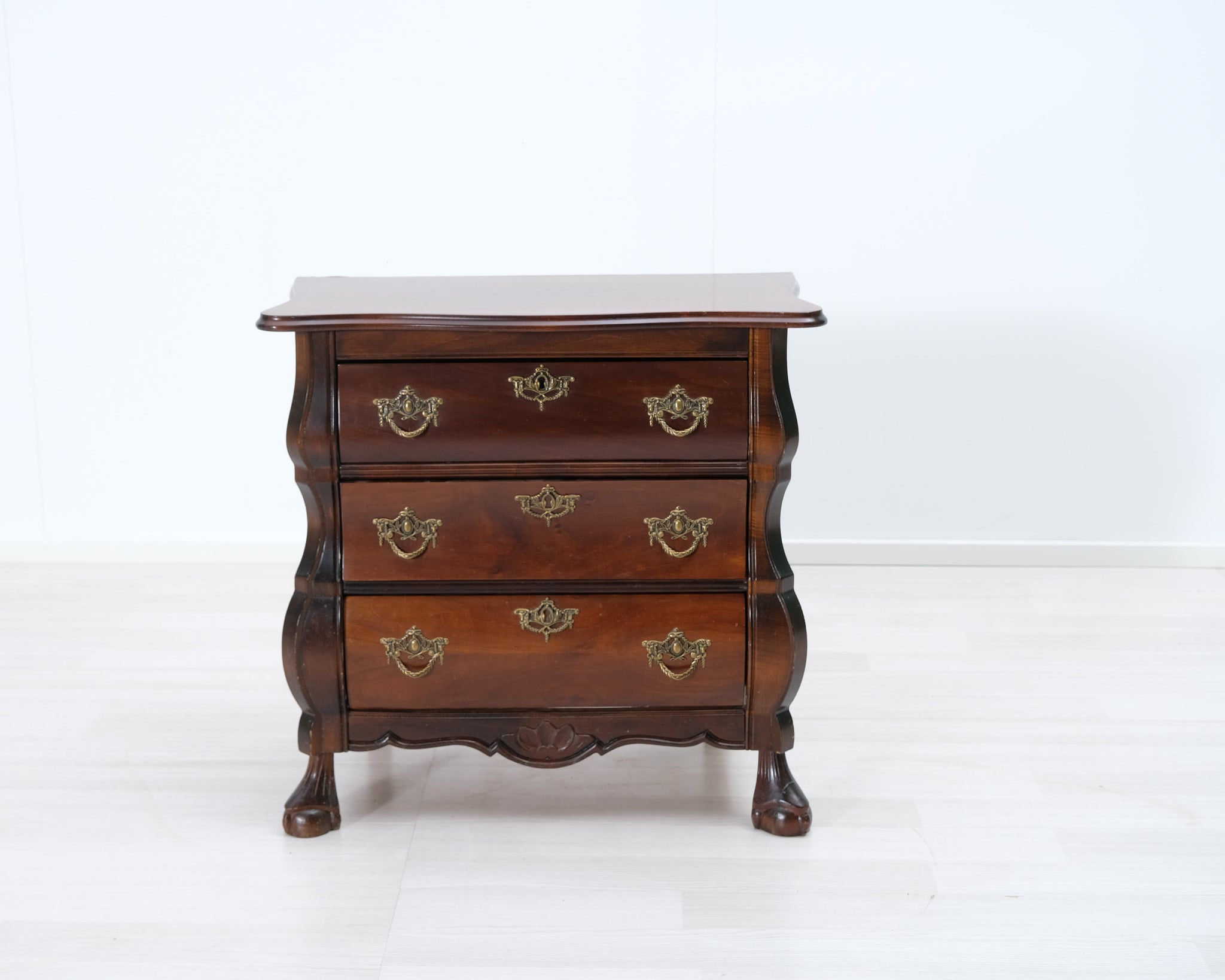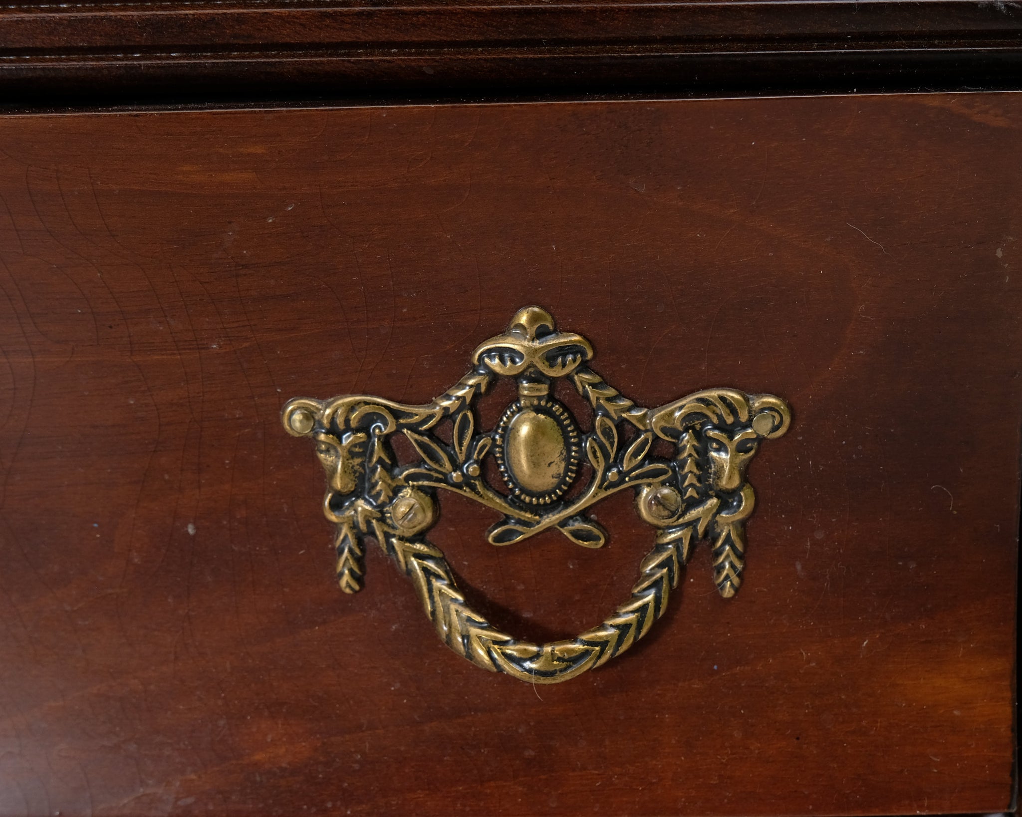 Antiikkinen lipasto. Kolme vetolaatikkoa ja kullanvärisiä yksityiskohtia.