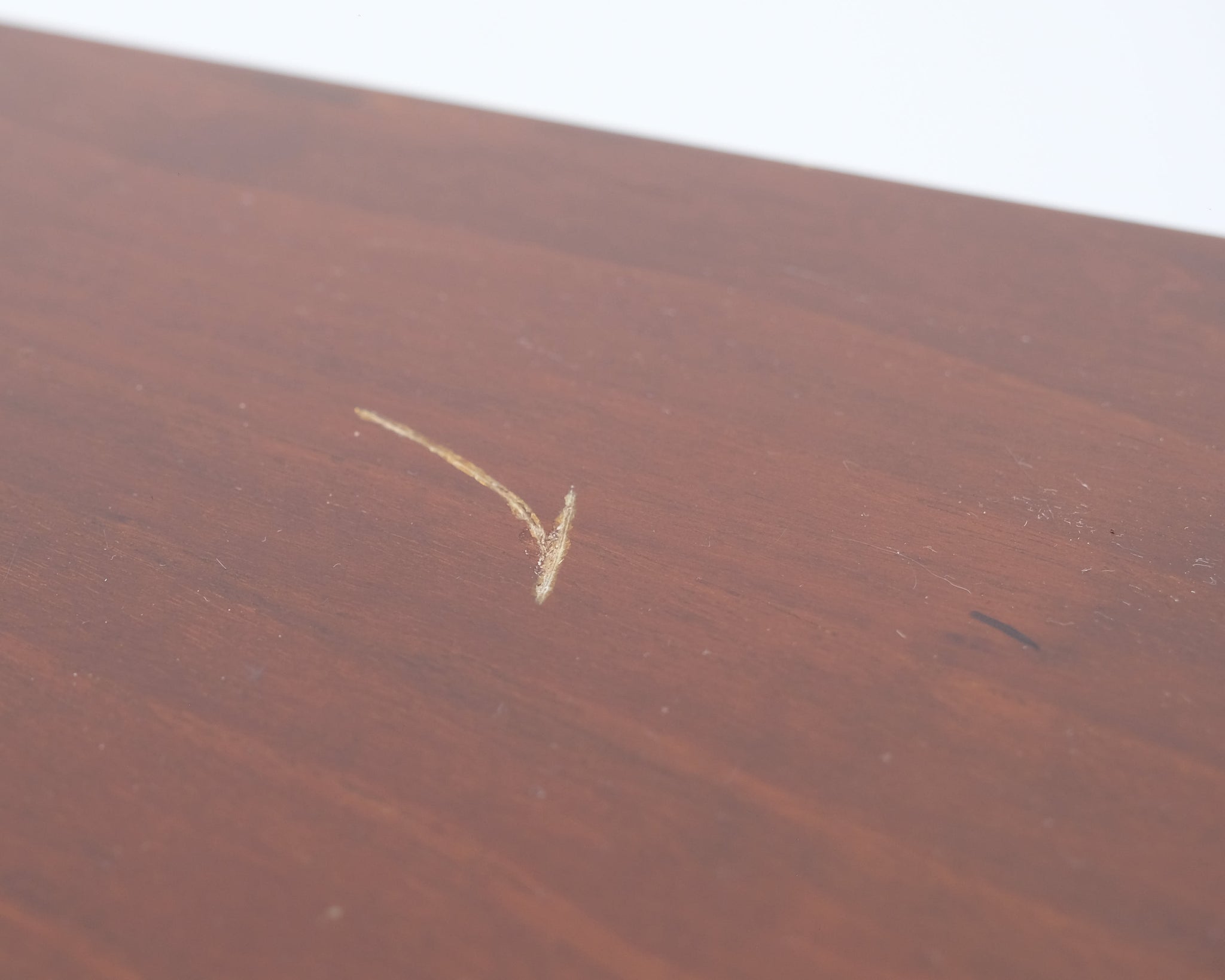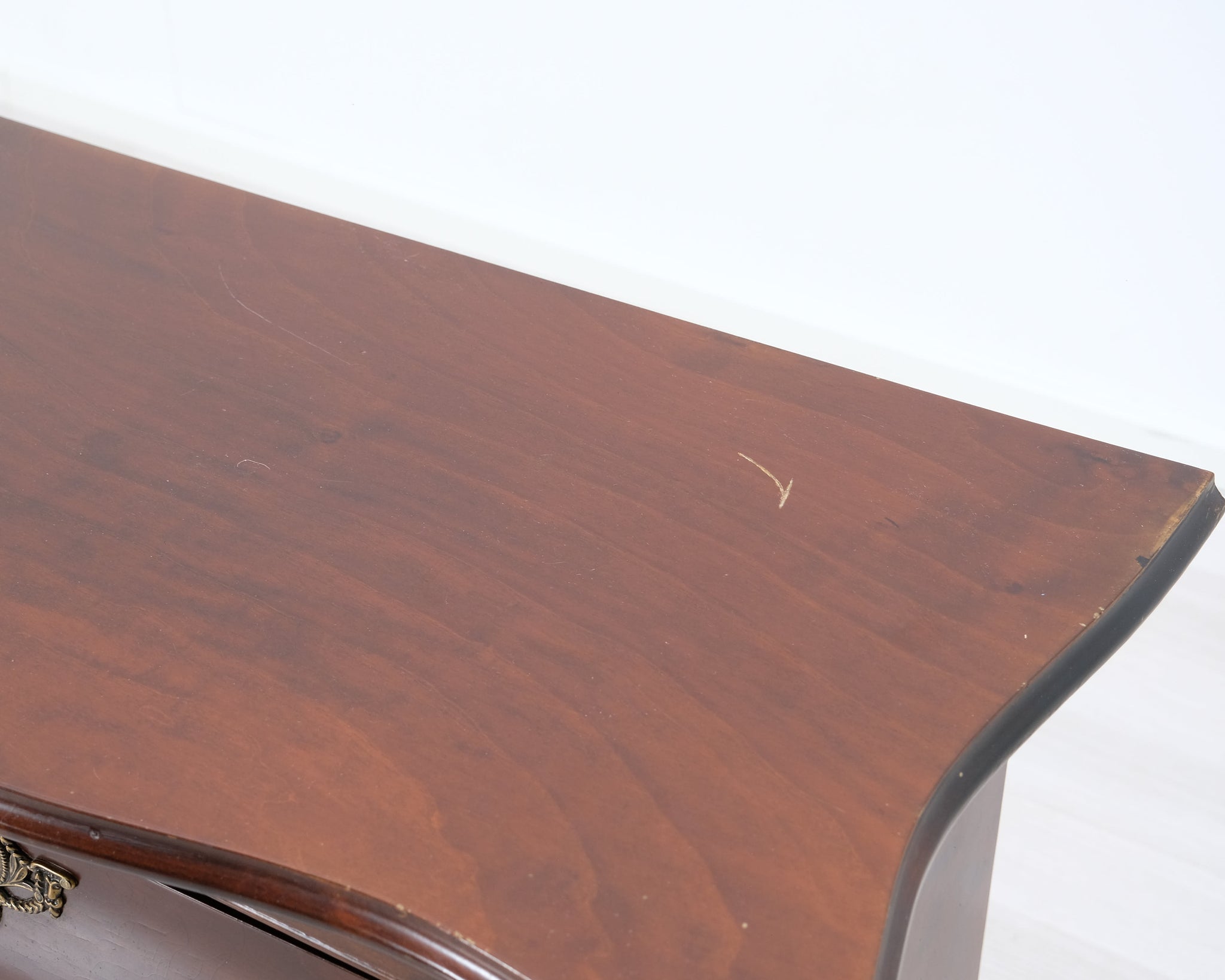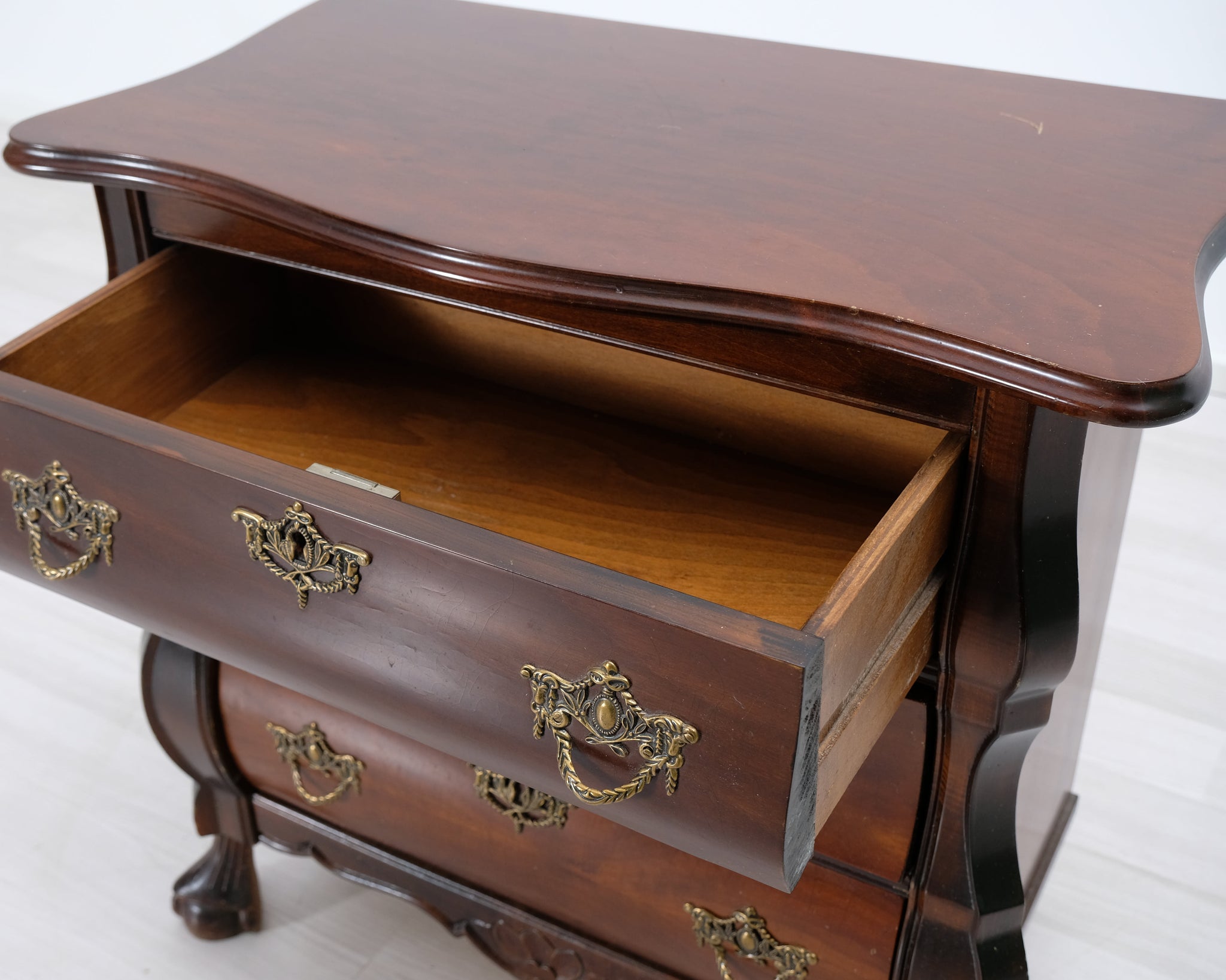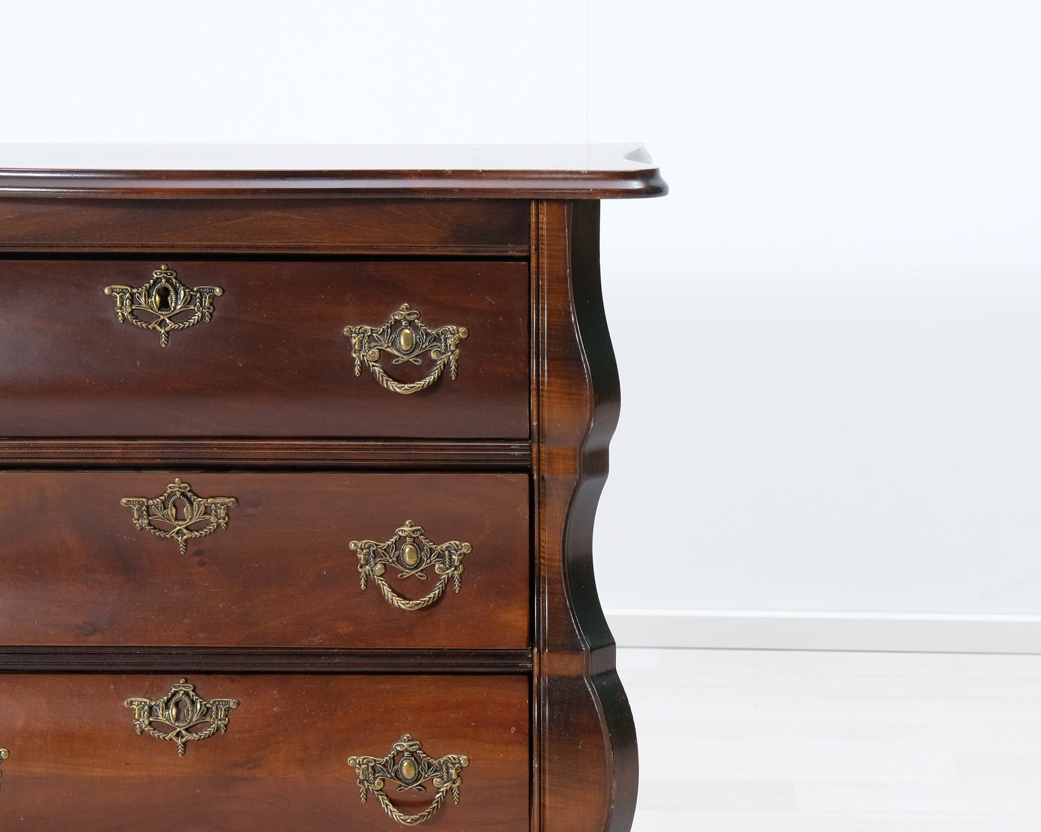 Antiikkinen lipasto. Kolme vetolaatikkoa ja kullanvärisiä yksityiskohtia.