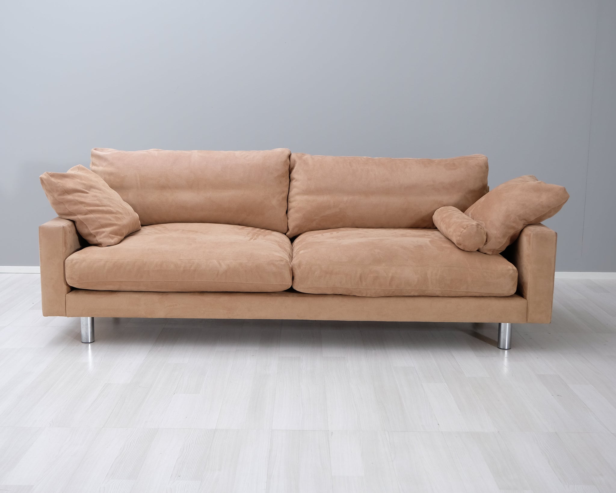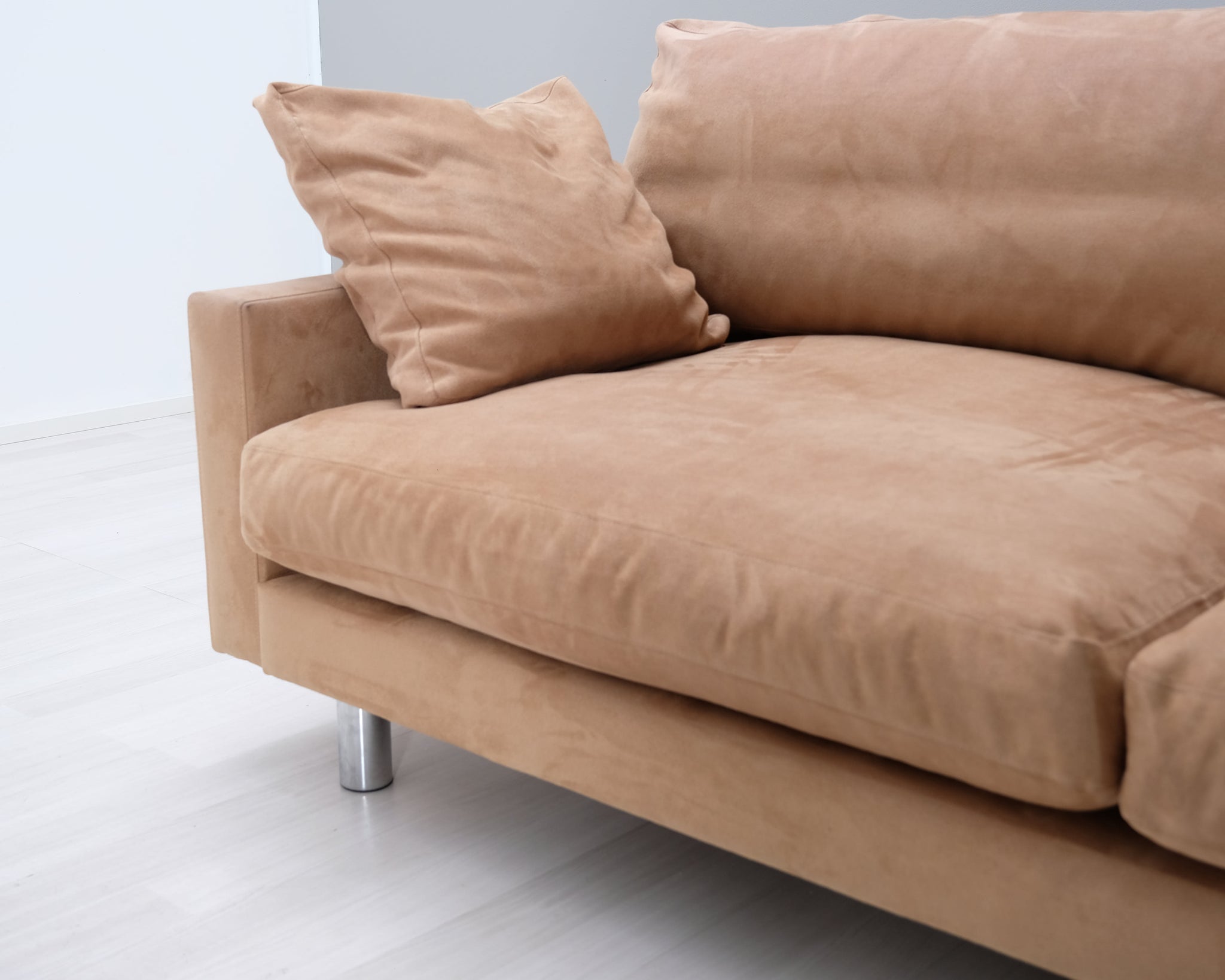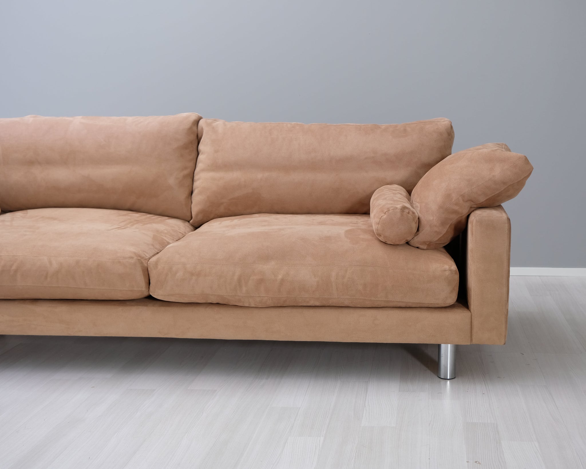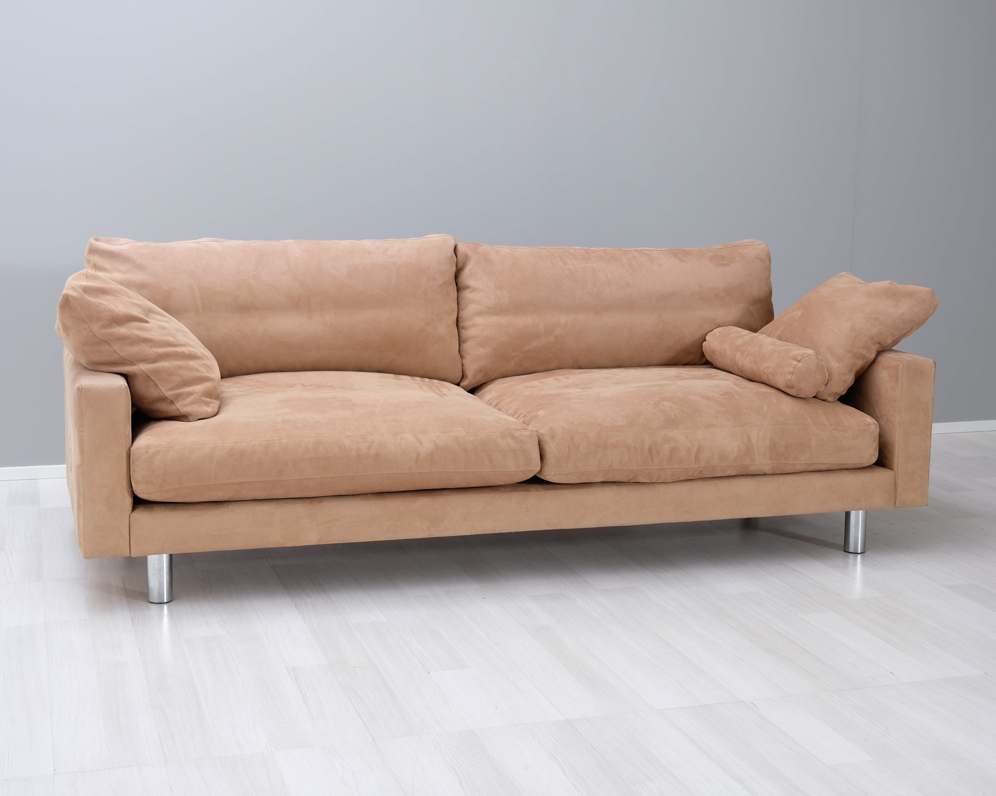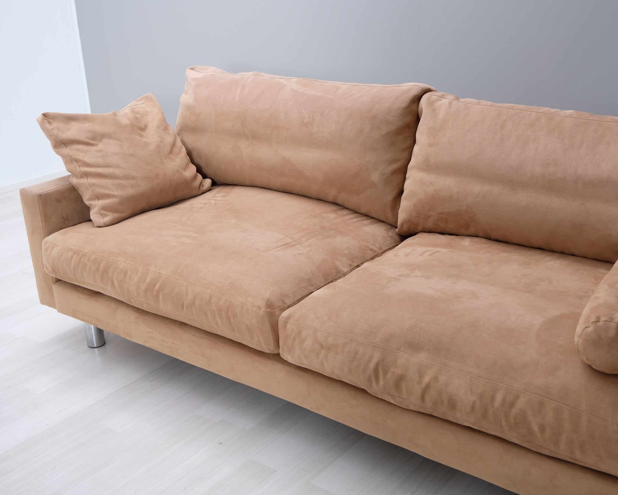 Kolmen istuttava kangassohva. Vaaleanruskeat alcantara-päälliset on irrotettavat ja konespestävät. Untuvatäyte.