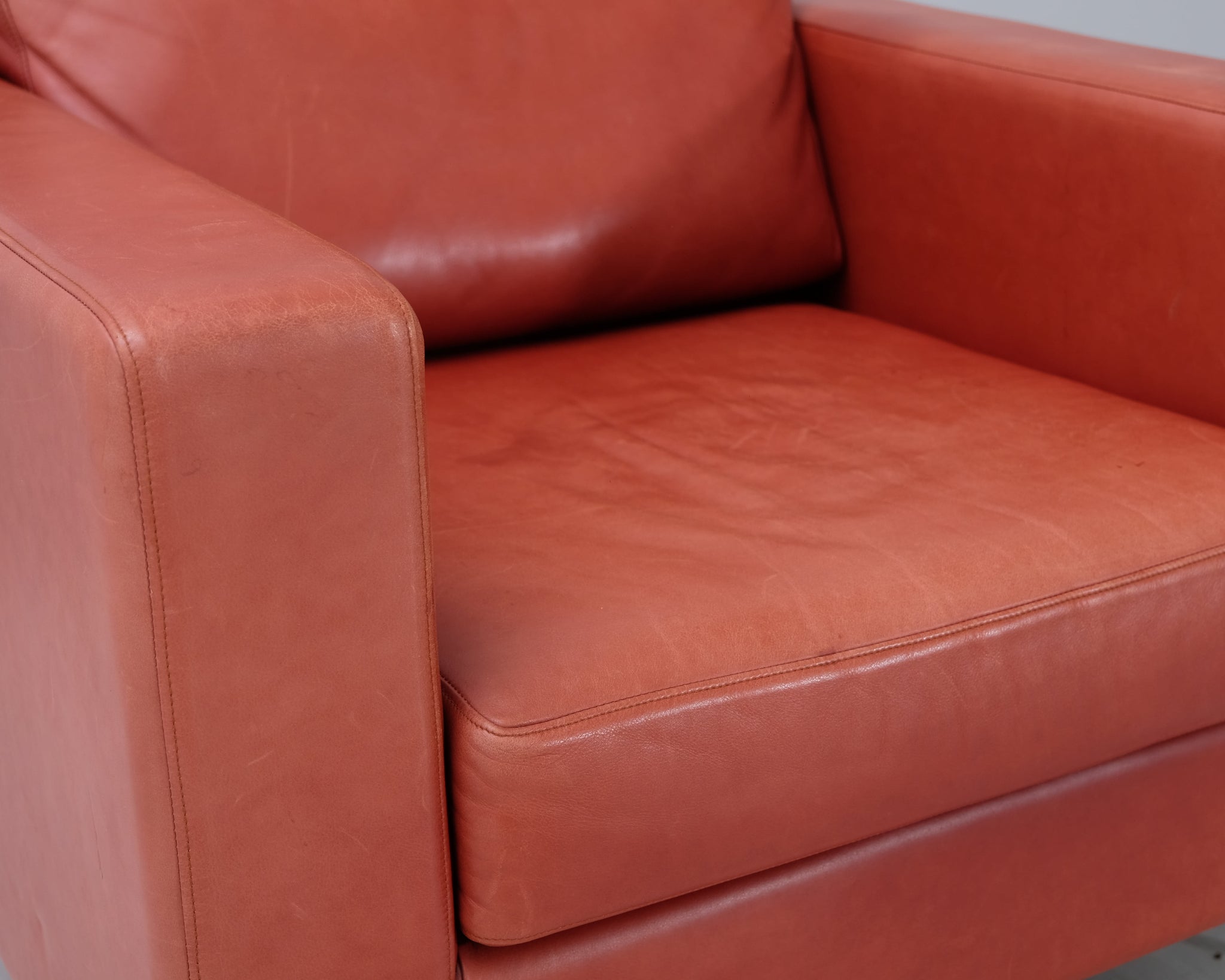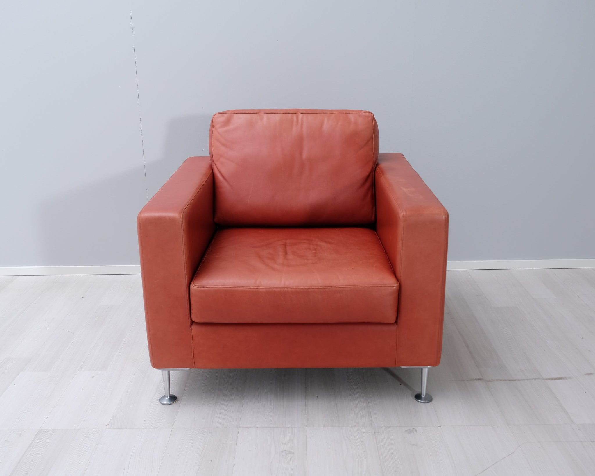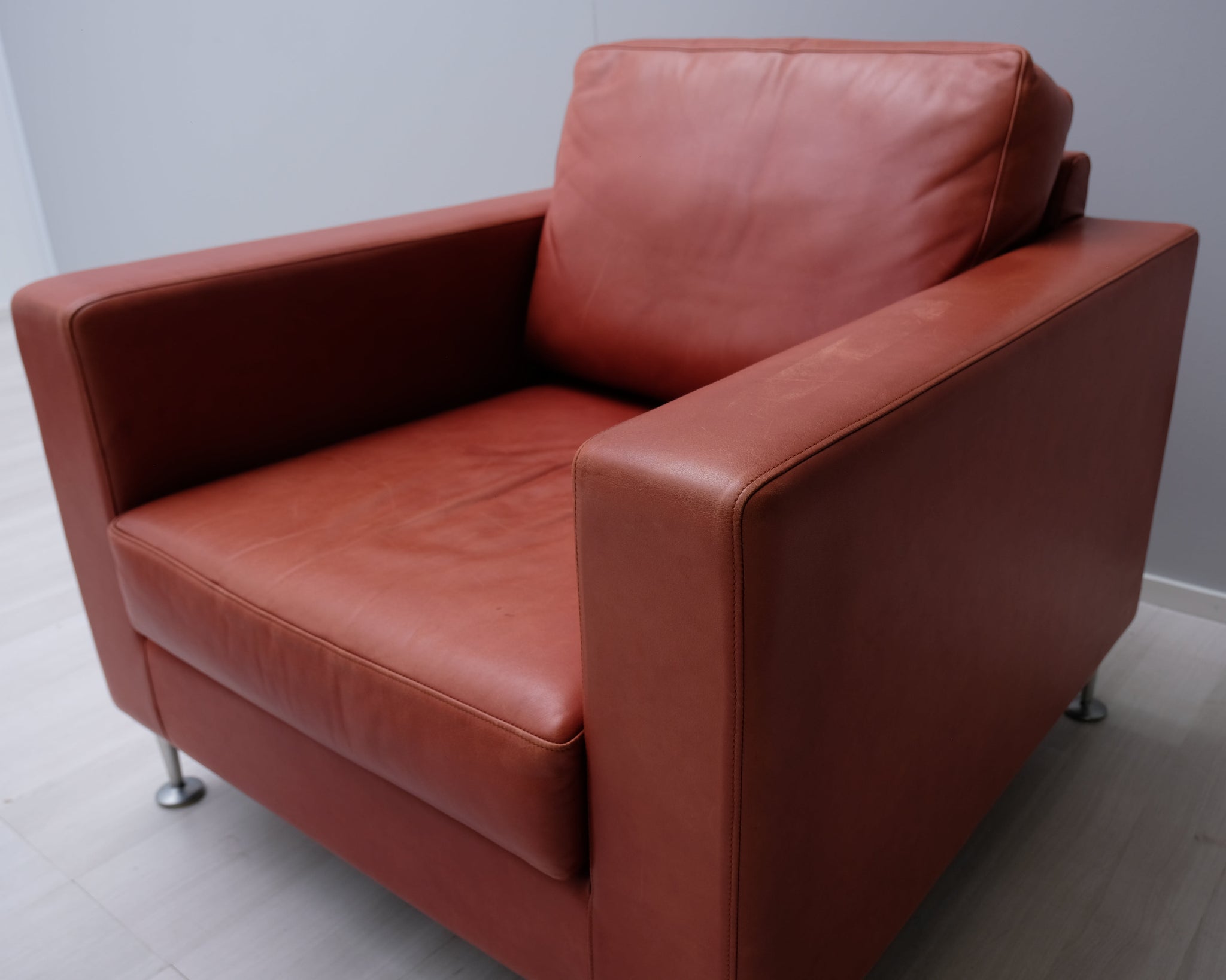 Sopen punainen nahkanojatuoli ja yhteensopiva rahi. Nojatuoli sopii täydellisesti väripilkuksi kotiin kuin kotiin.