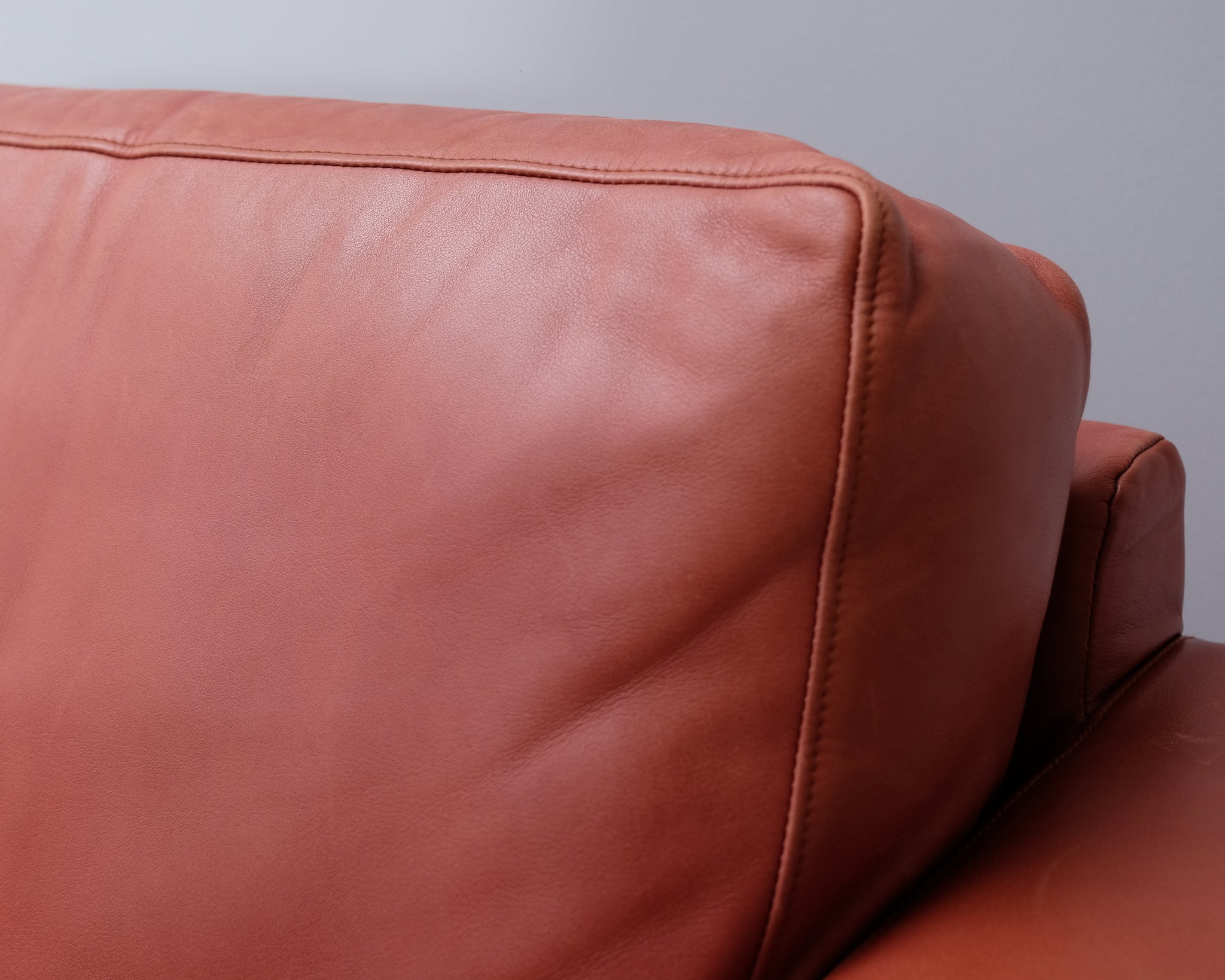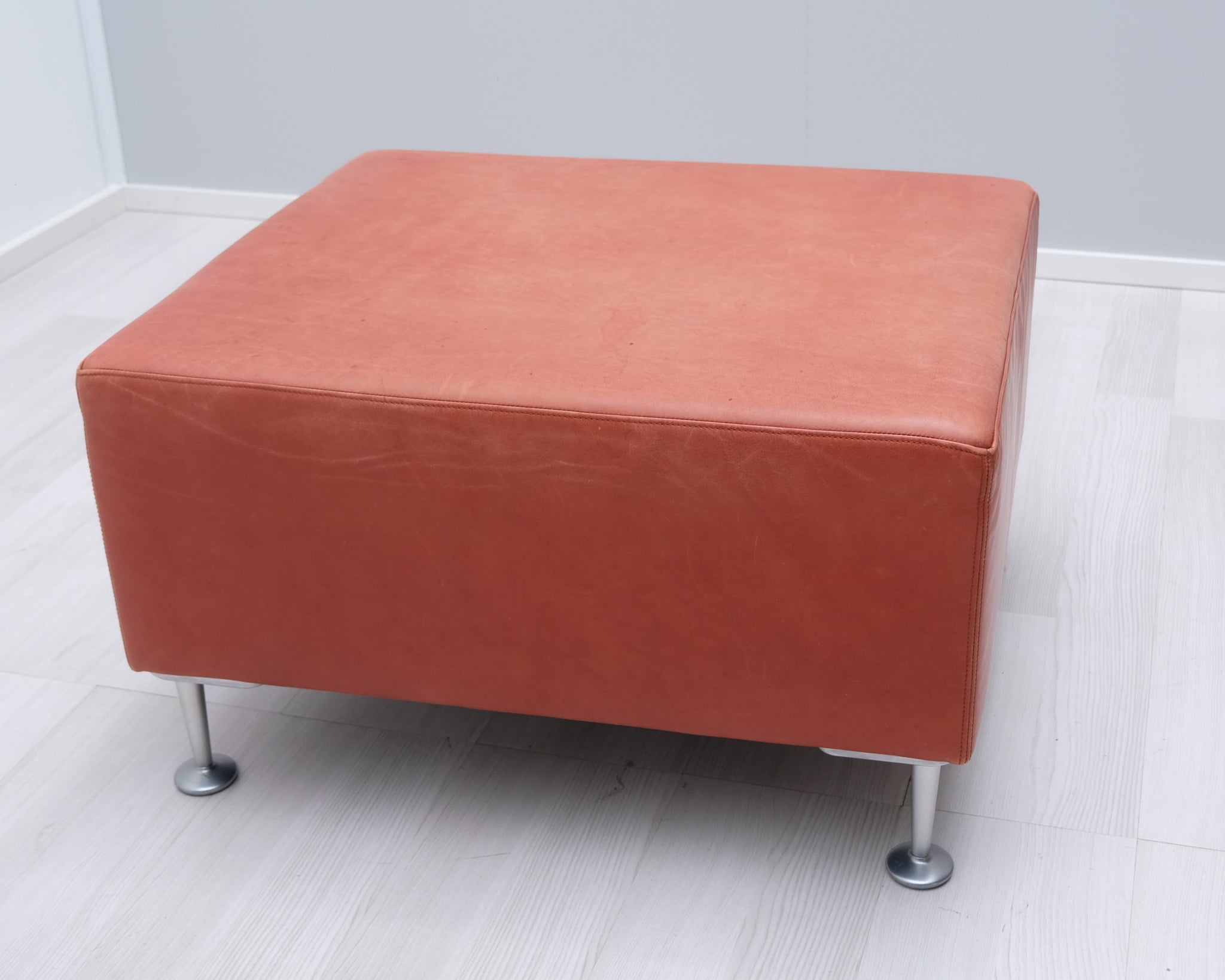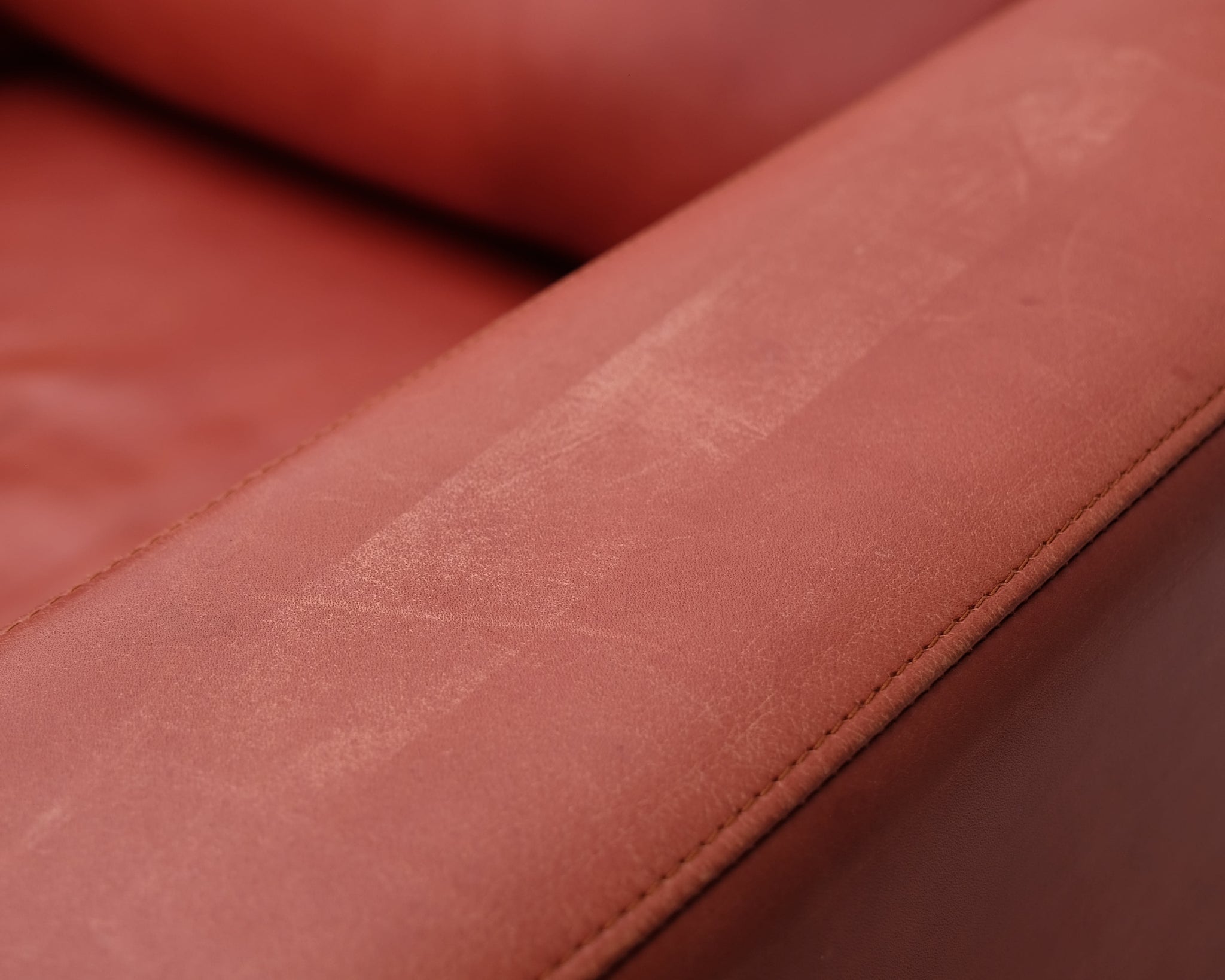 Sopen punainen nahkanojatuoli ja yhteensopiva rahi. Nojatuoli sopii täydellisesti väripilkuksi kotiin kuin kotiin.