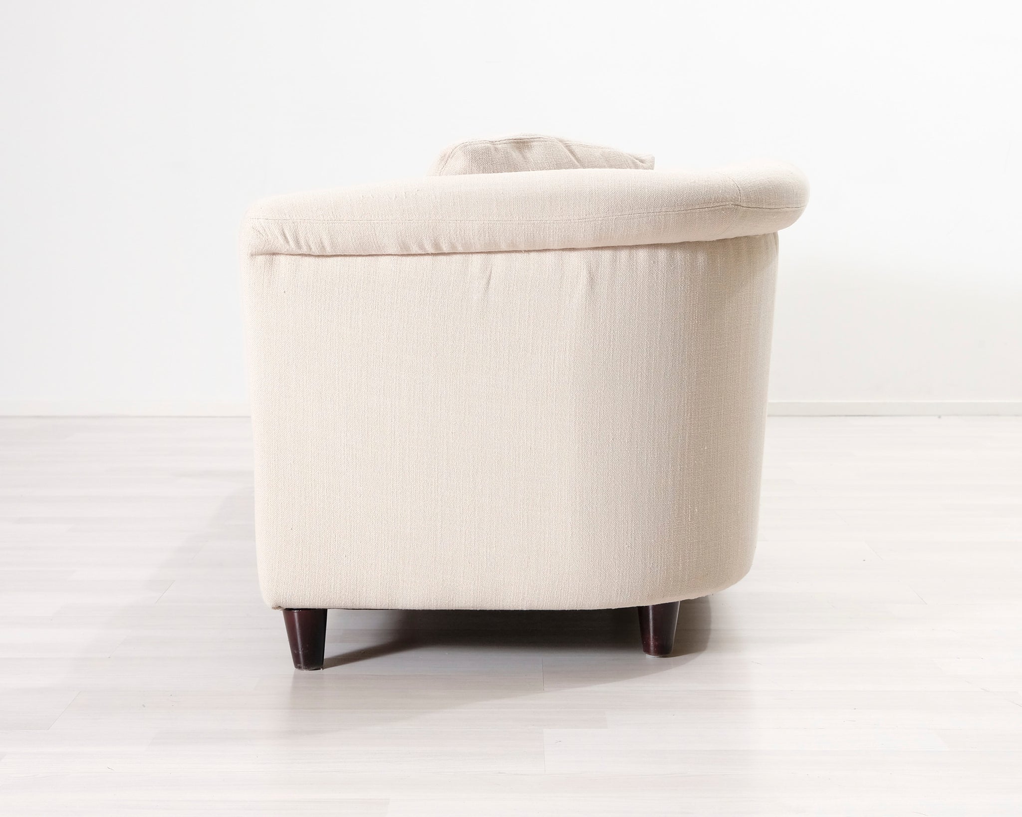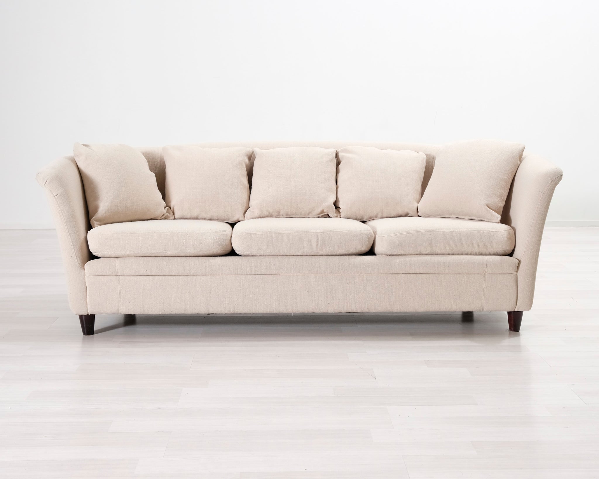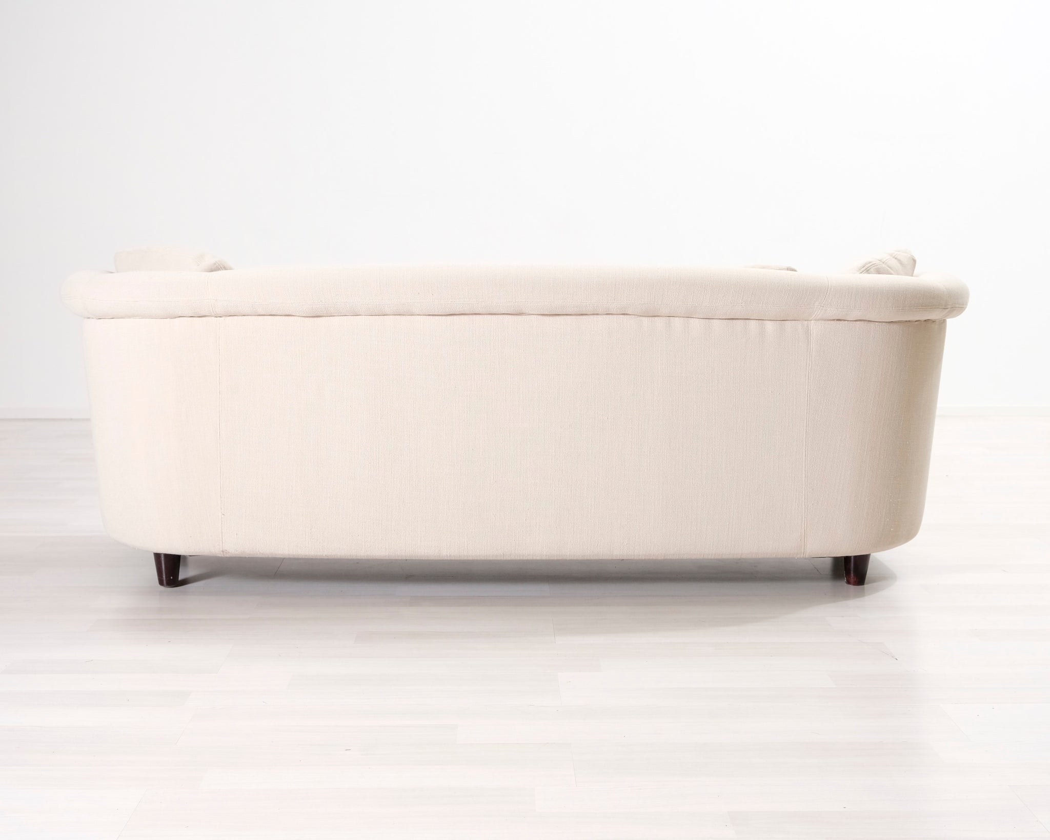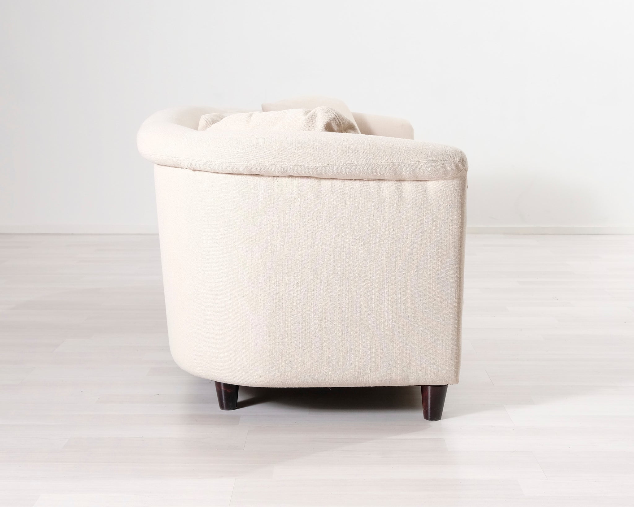 Luonnonvalkoinen kangassohva klassisella muotoilulla, jonka ansioista sohva sopii monen tyyliseen sisustukseen. Kauniit tummanruskeat puiset jalat.