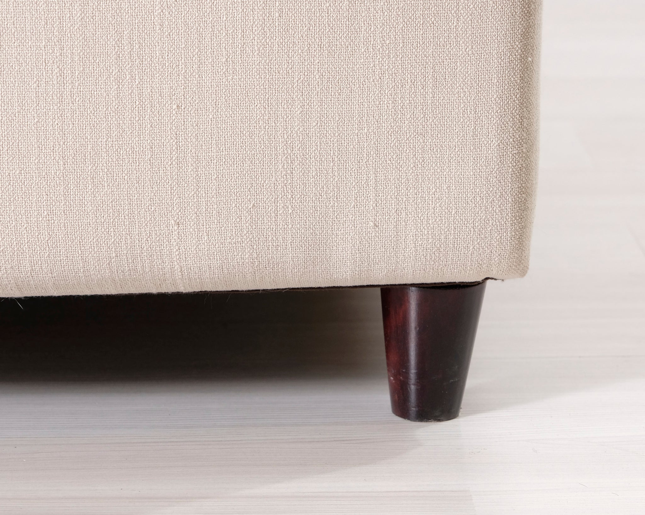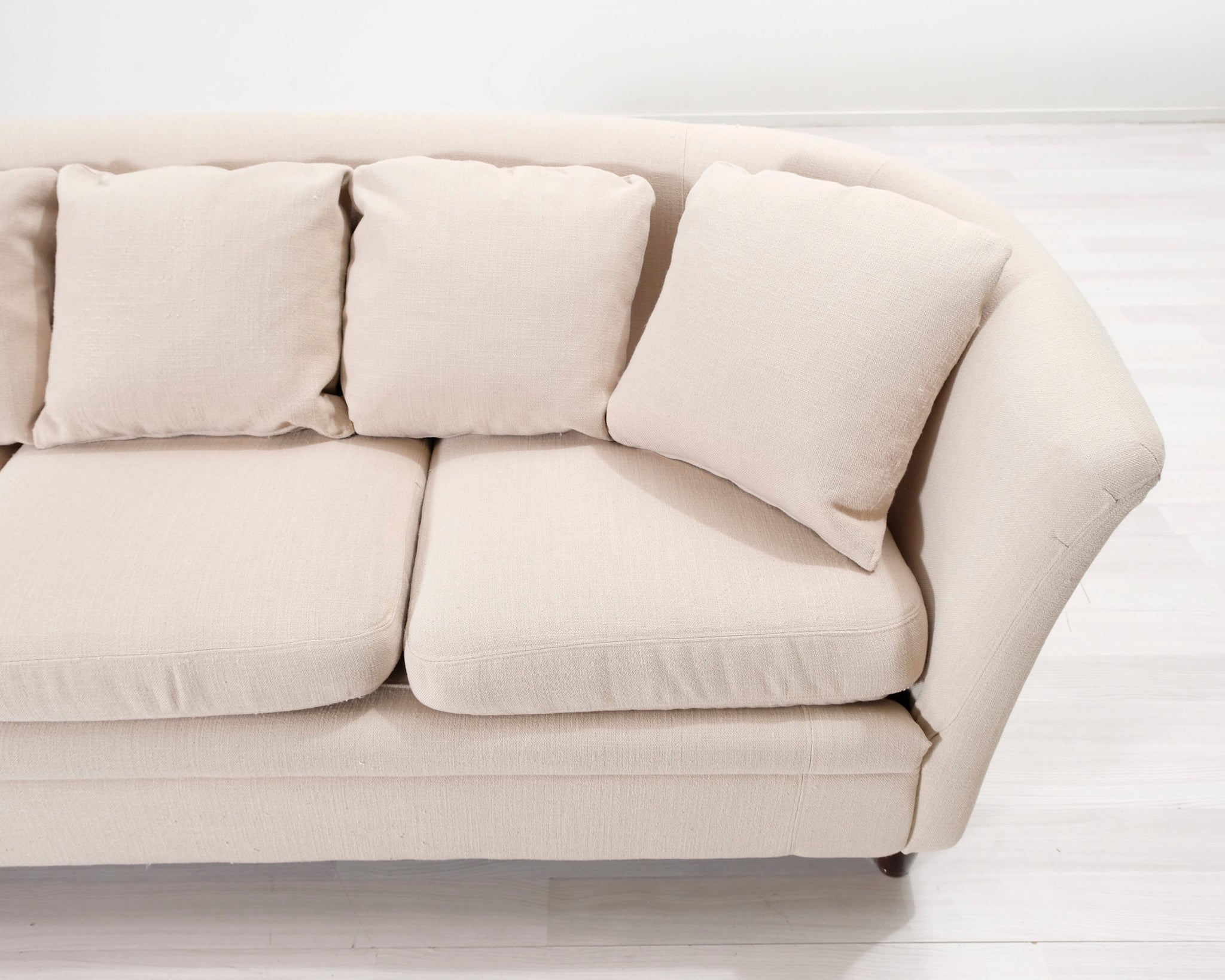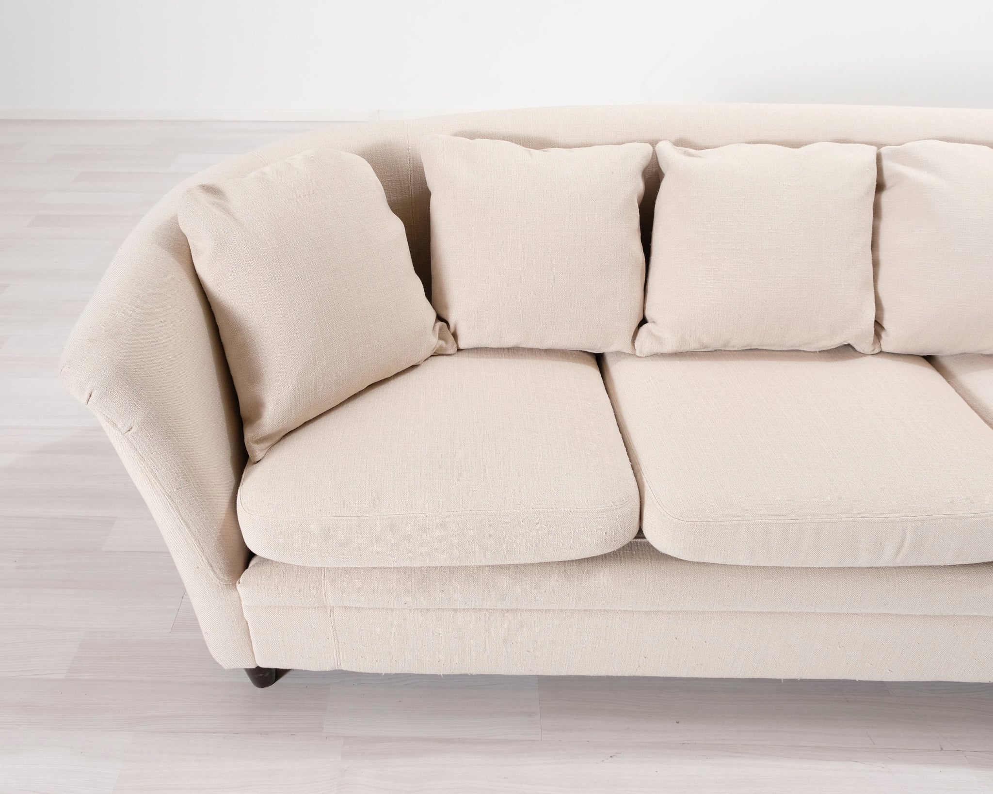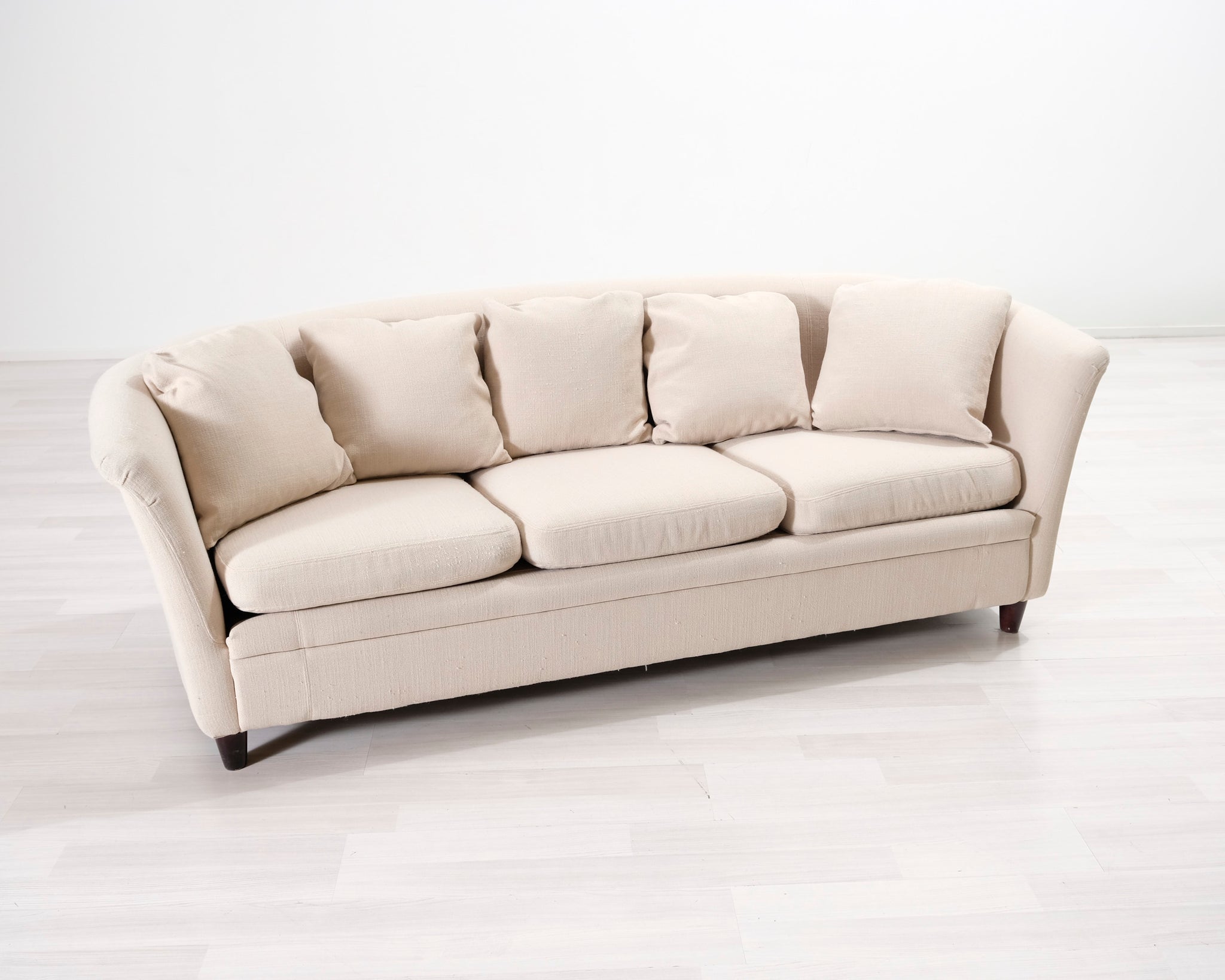 Luonnonvalkoinen kangassohva klassisella muotoilulla, jonka ansioista sohva sopii monen tyyliseen sisustukseen. Kauniit tummanruskeat puiset jalat.