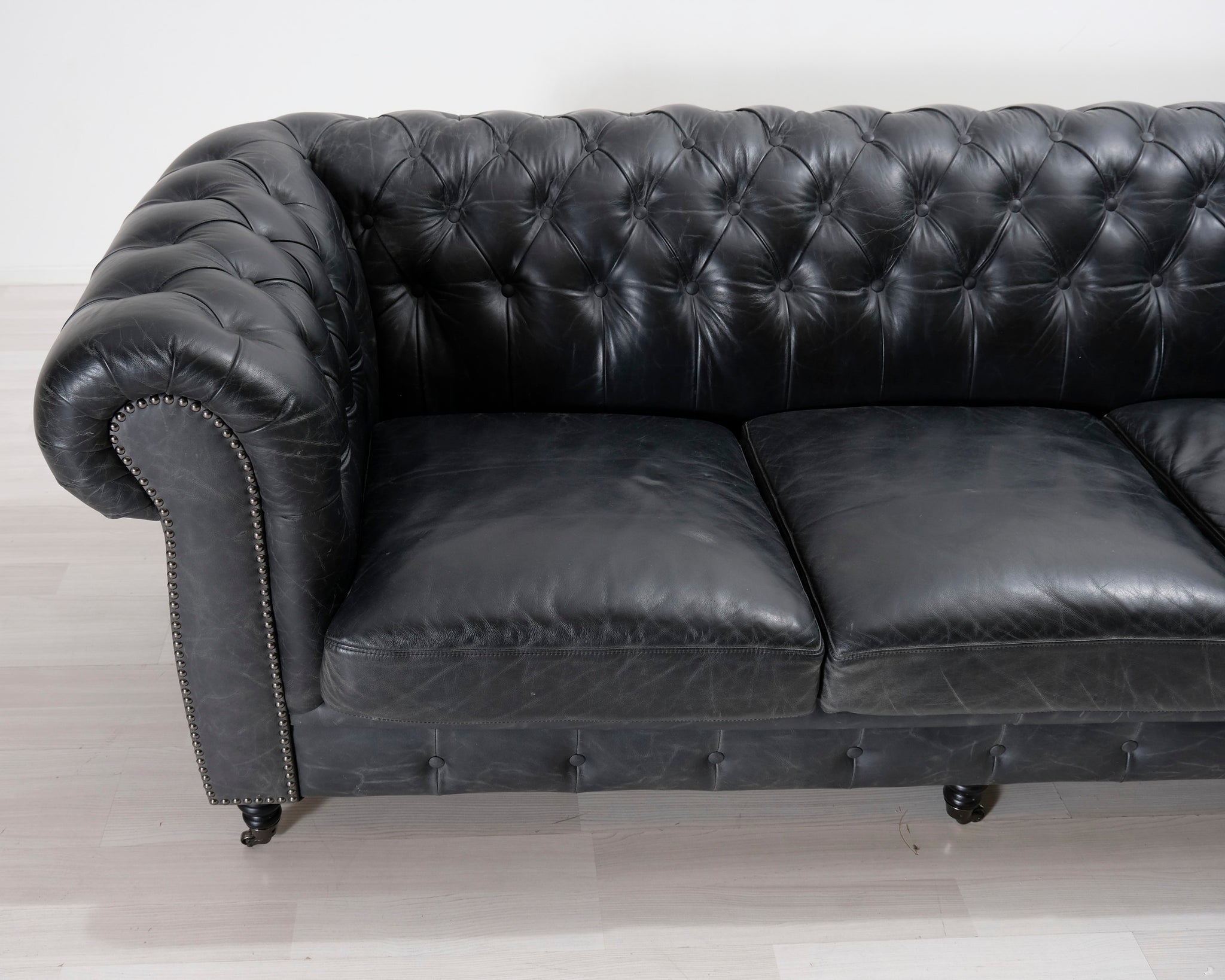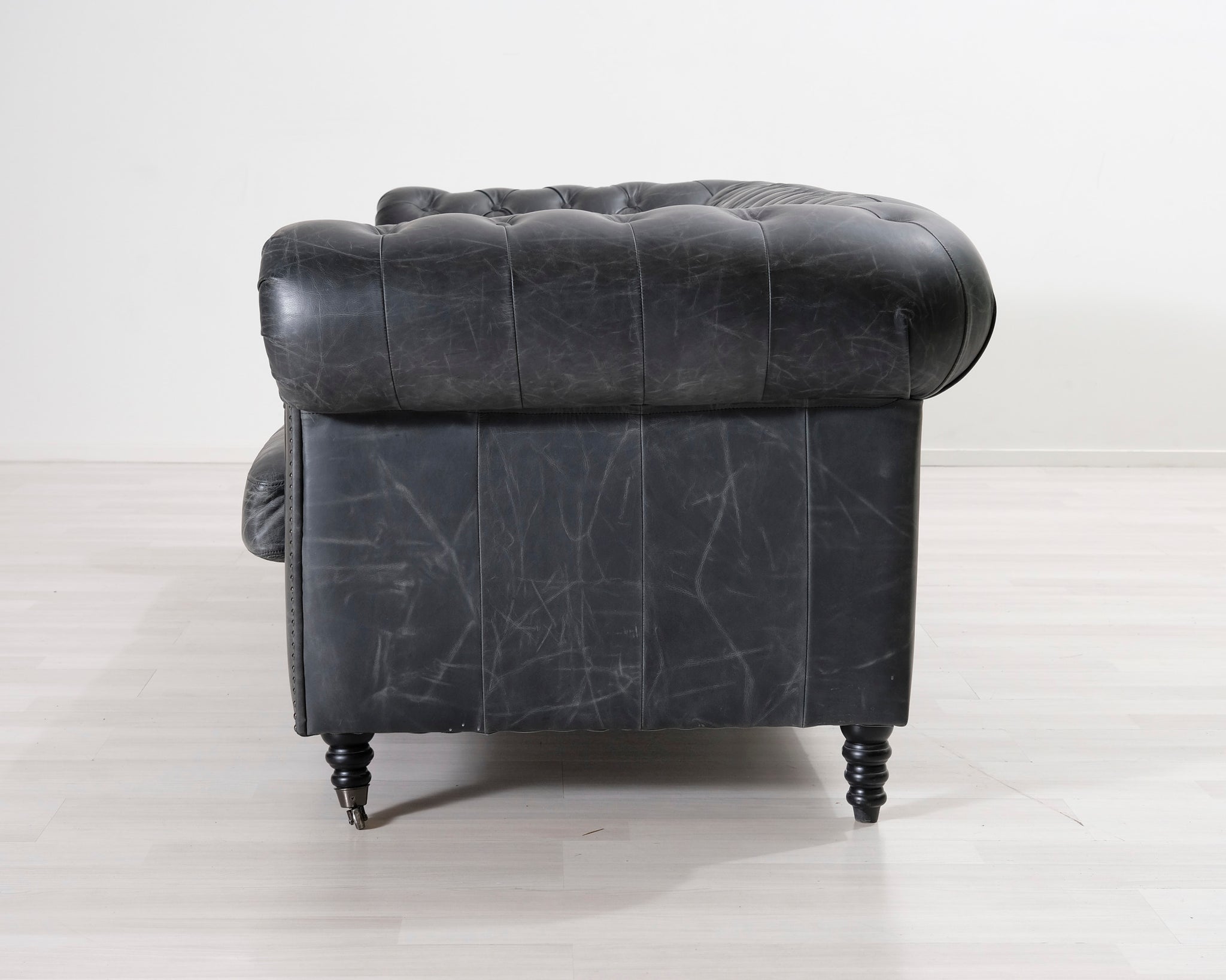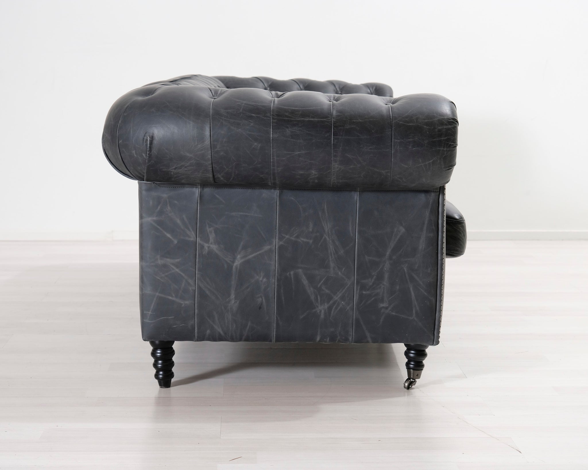 Pyöristetyt käsinojat, tikattu nahkapinta ja koristeniitit ovat tunnunsomaisia yksityiskohtia Chesterfield-tyylisissä sohvissa. Tämä sohva on kolmen istuttava ja verhoiltu harmaalla nahalla.