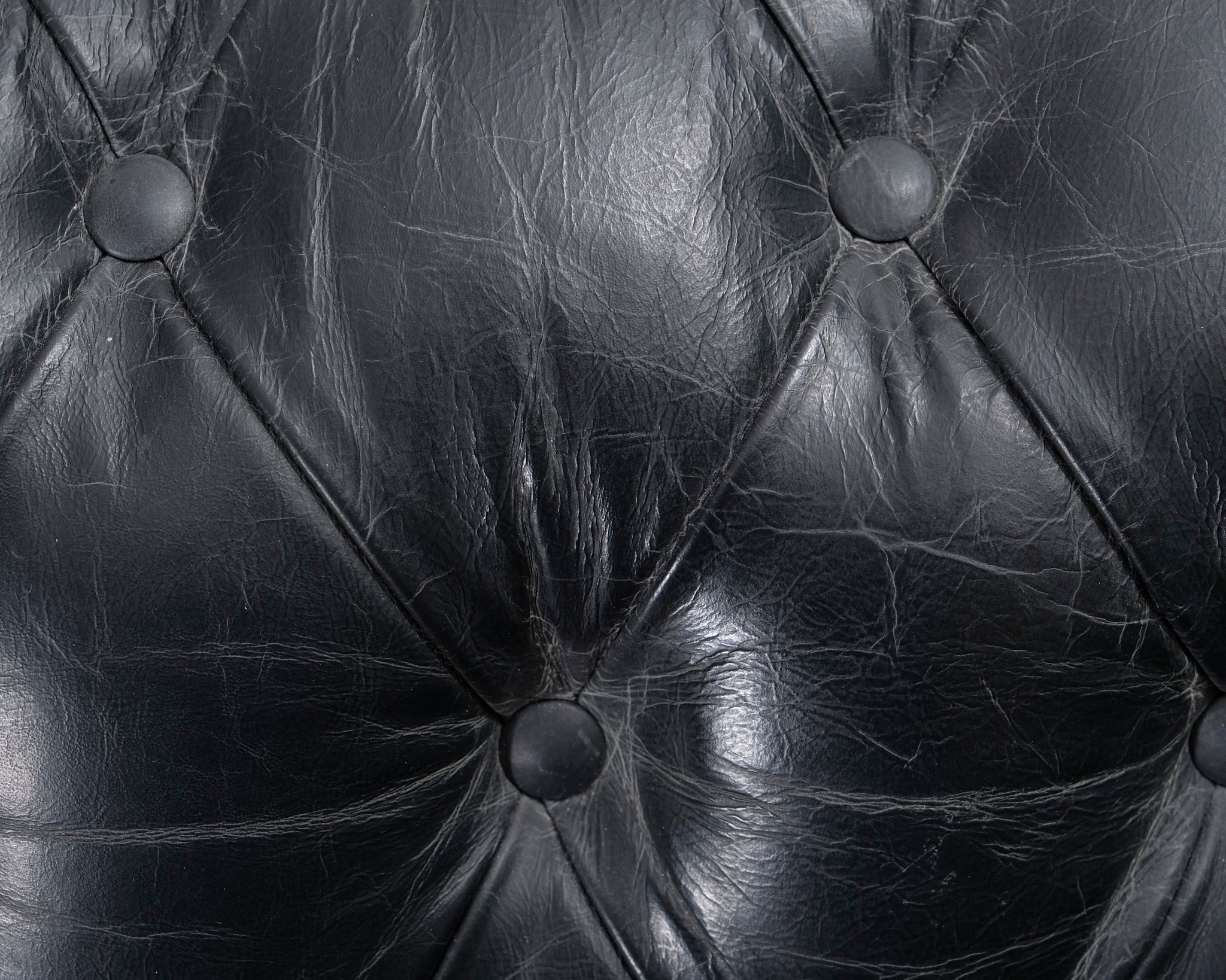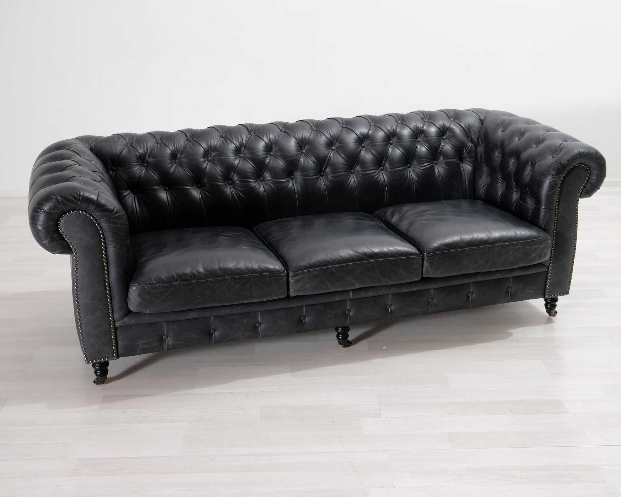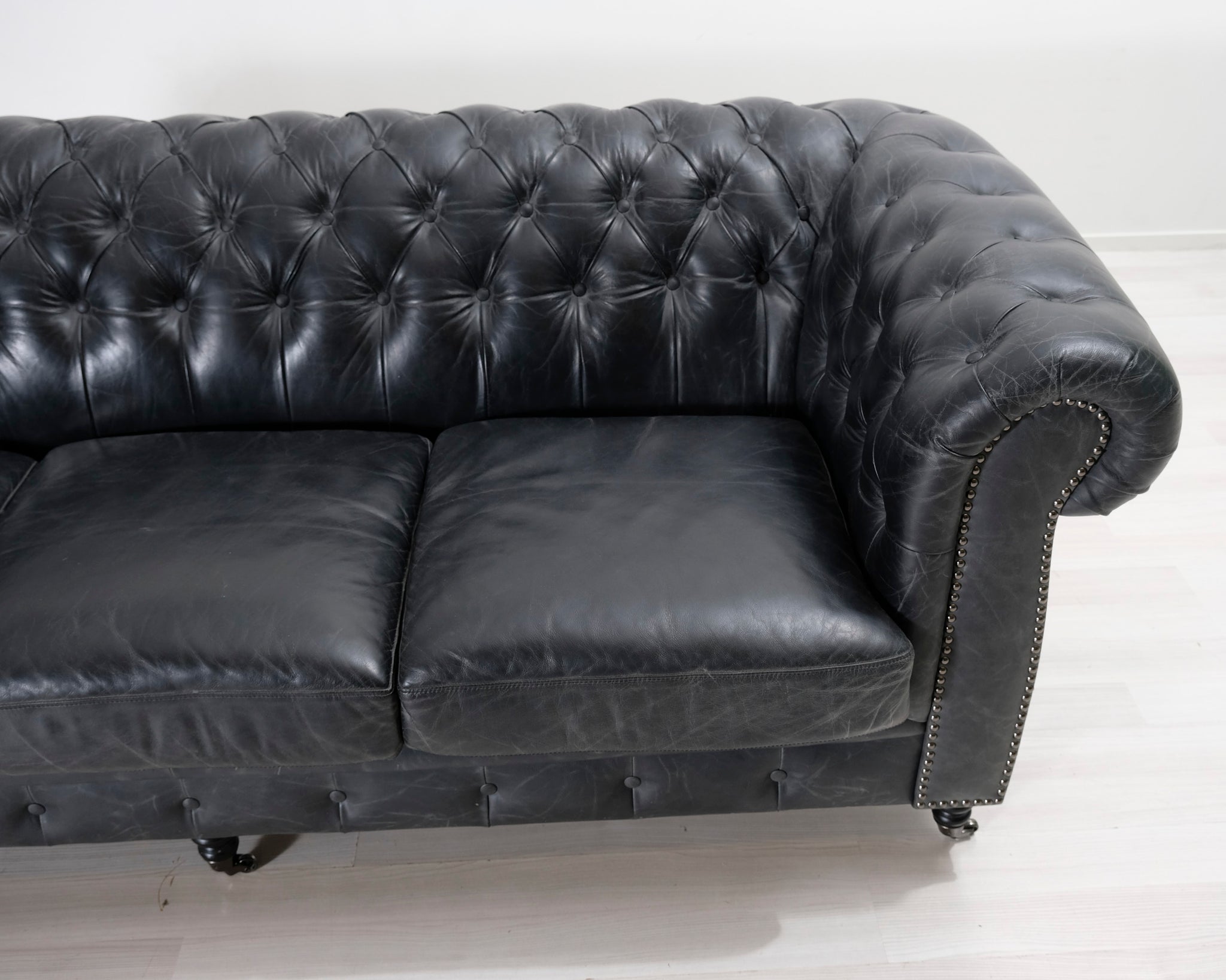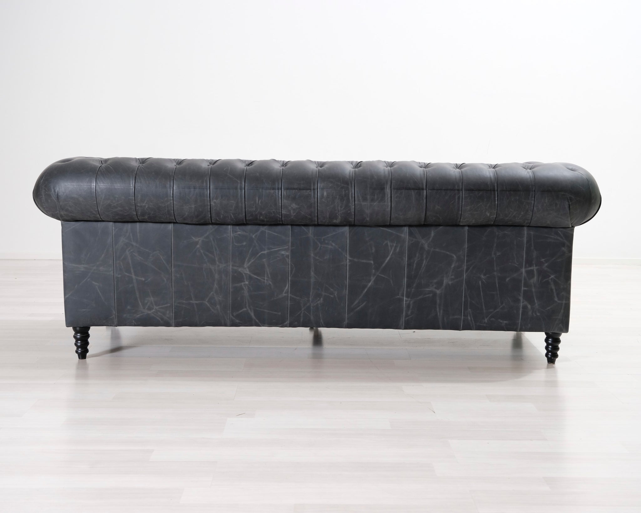Pyöristetyt käsinojat, tikattu nahkapinta ja koristeniitit ovat tunnunsomaisia yksityiskohtia Chesterfield-tyylisissä sohvissa. Tämä sohva on kolmen istuttava ja verhoiltu harmaalla nahalla.