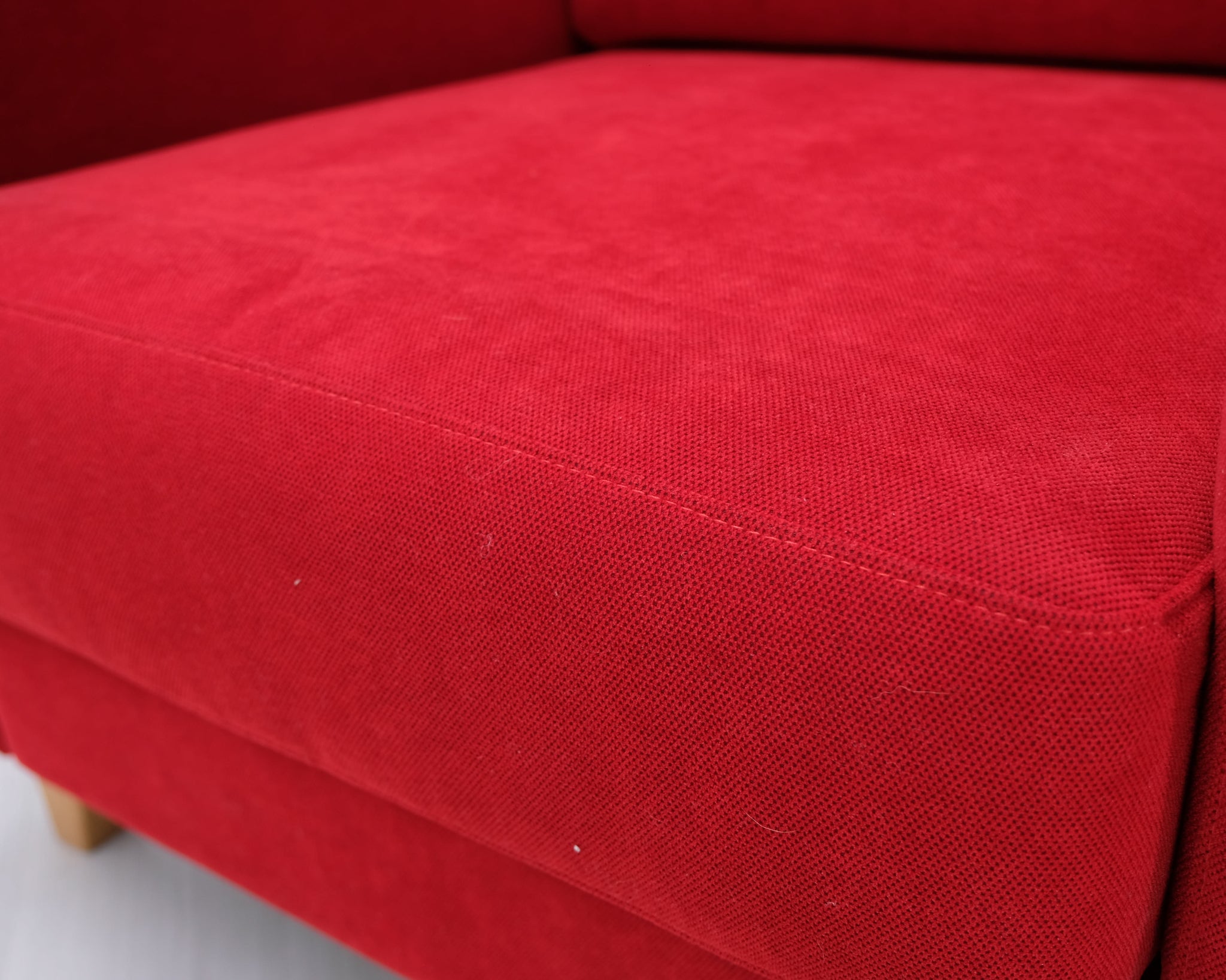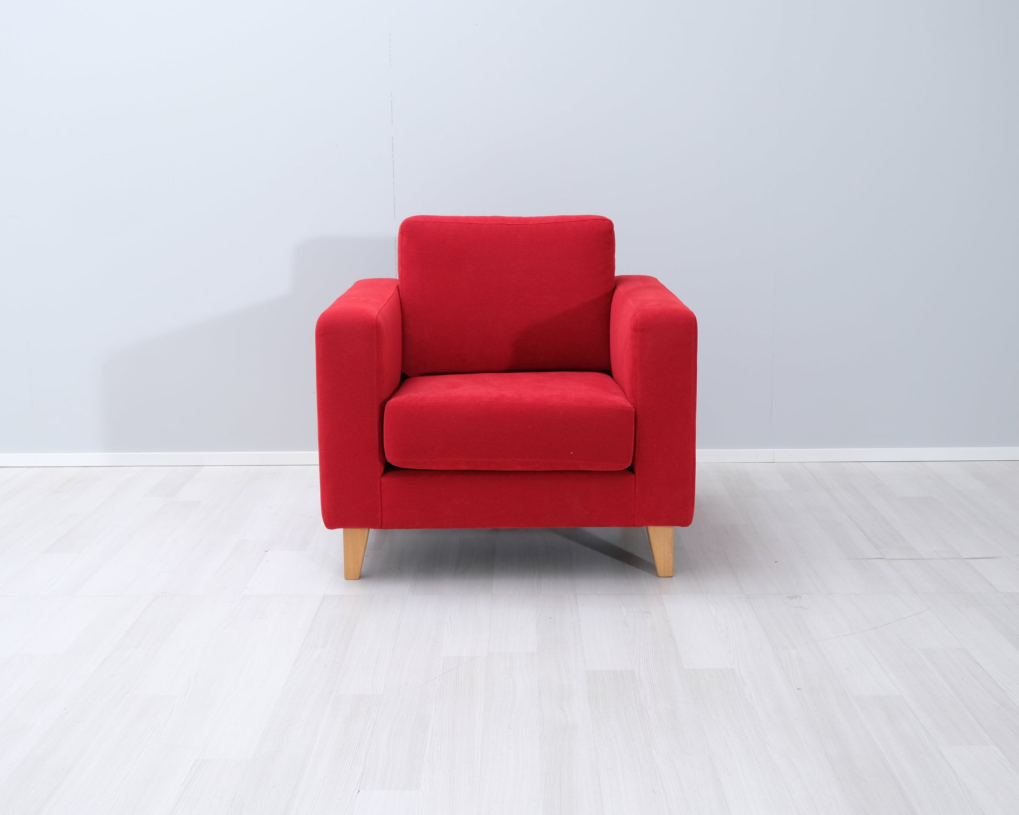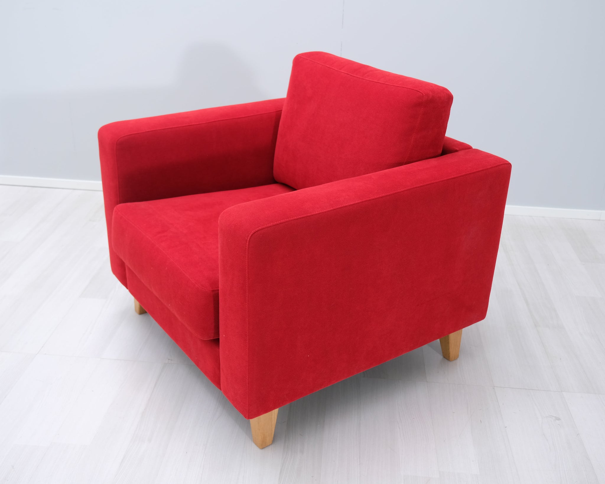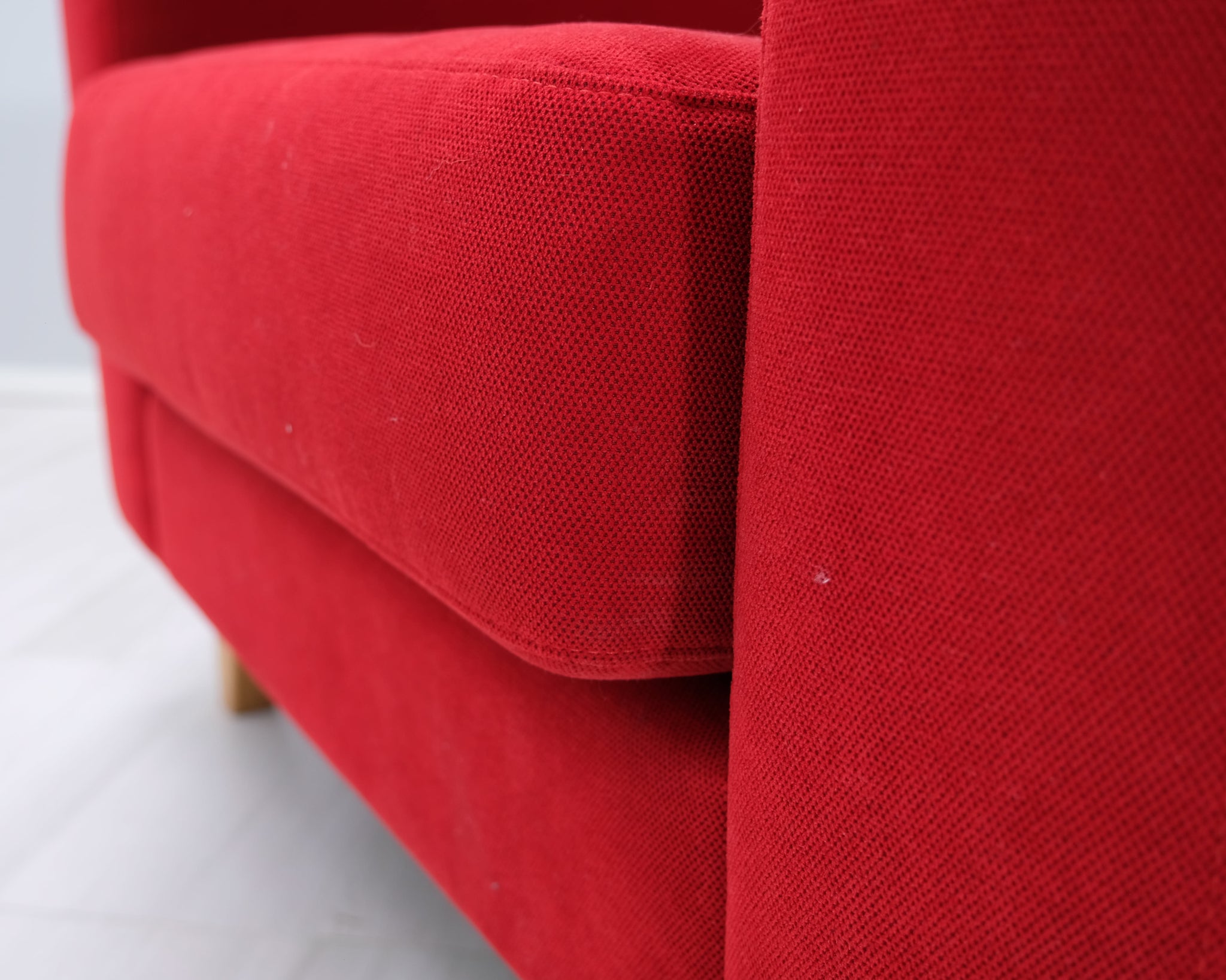 Kotimaisen Adean valmistama punainen kangasnojatuoli. Sijoita nojatuoli esimerkiksi olohuoneen tai makuuhuoneen väripilkuksi.