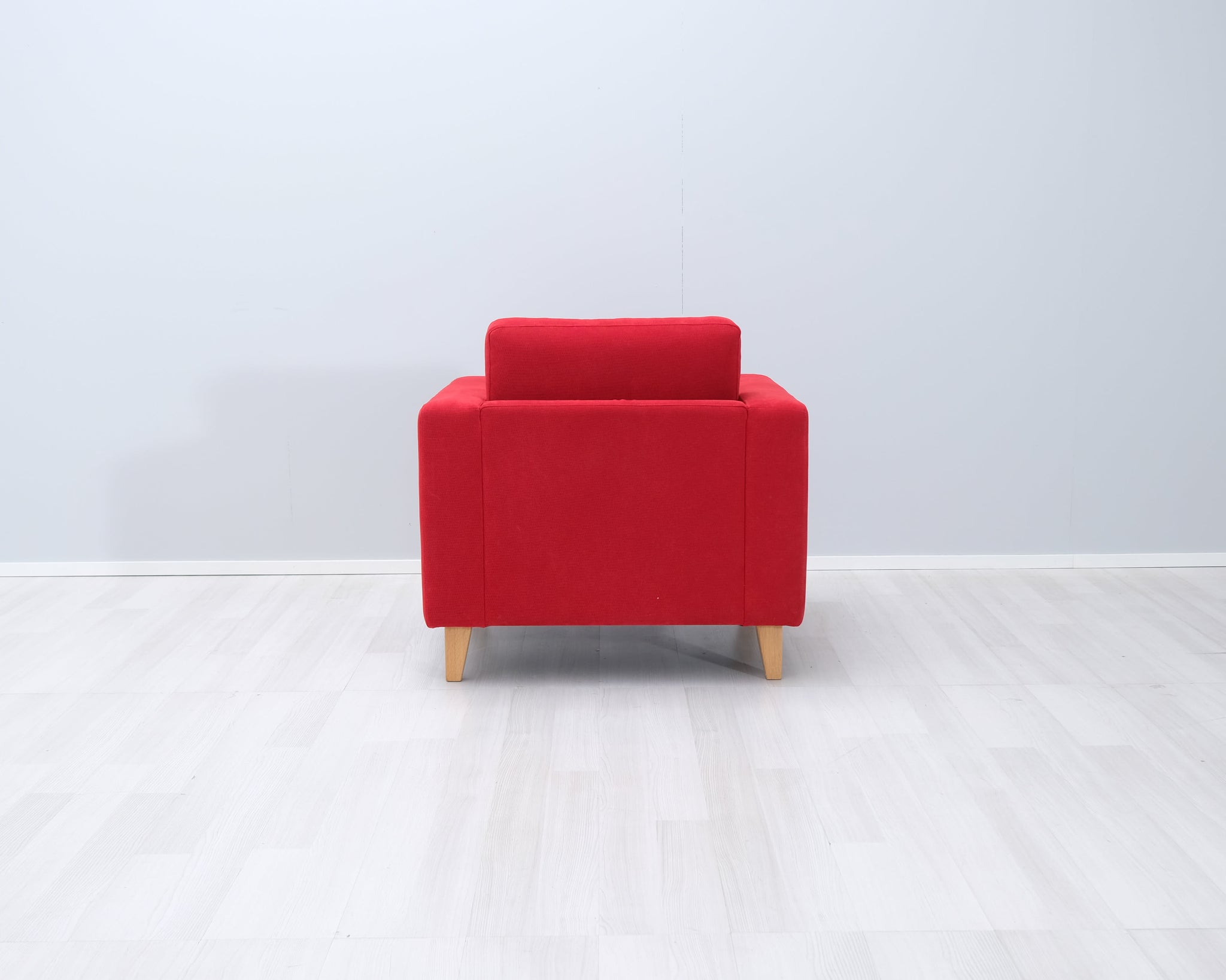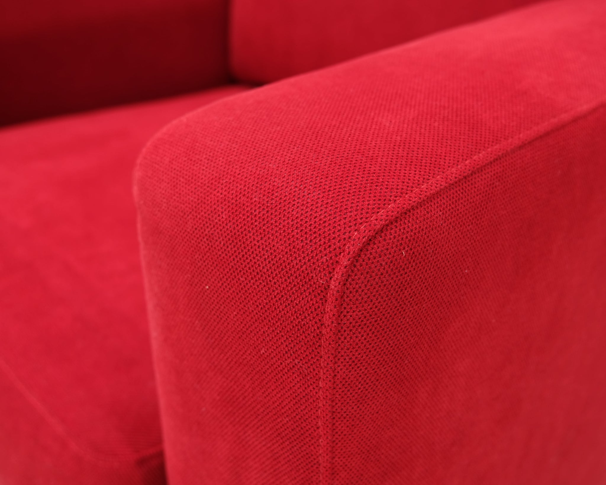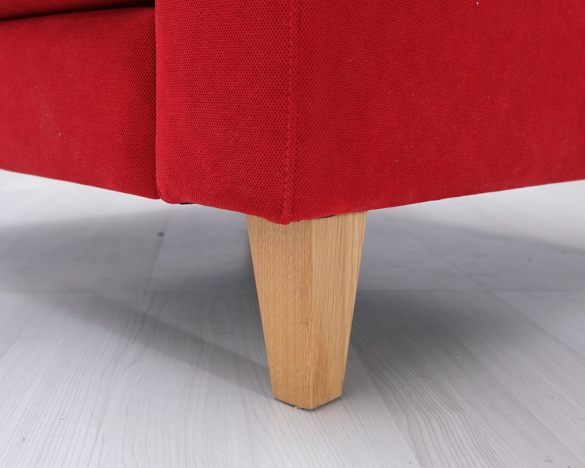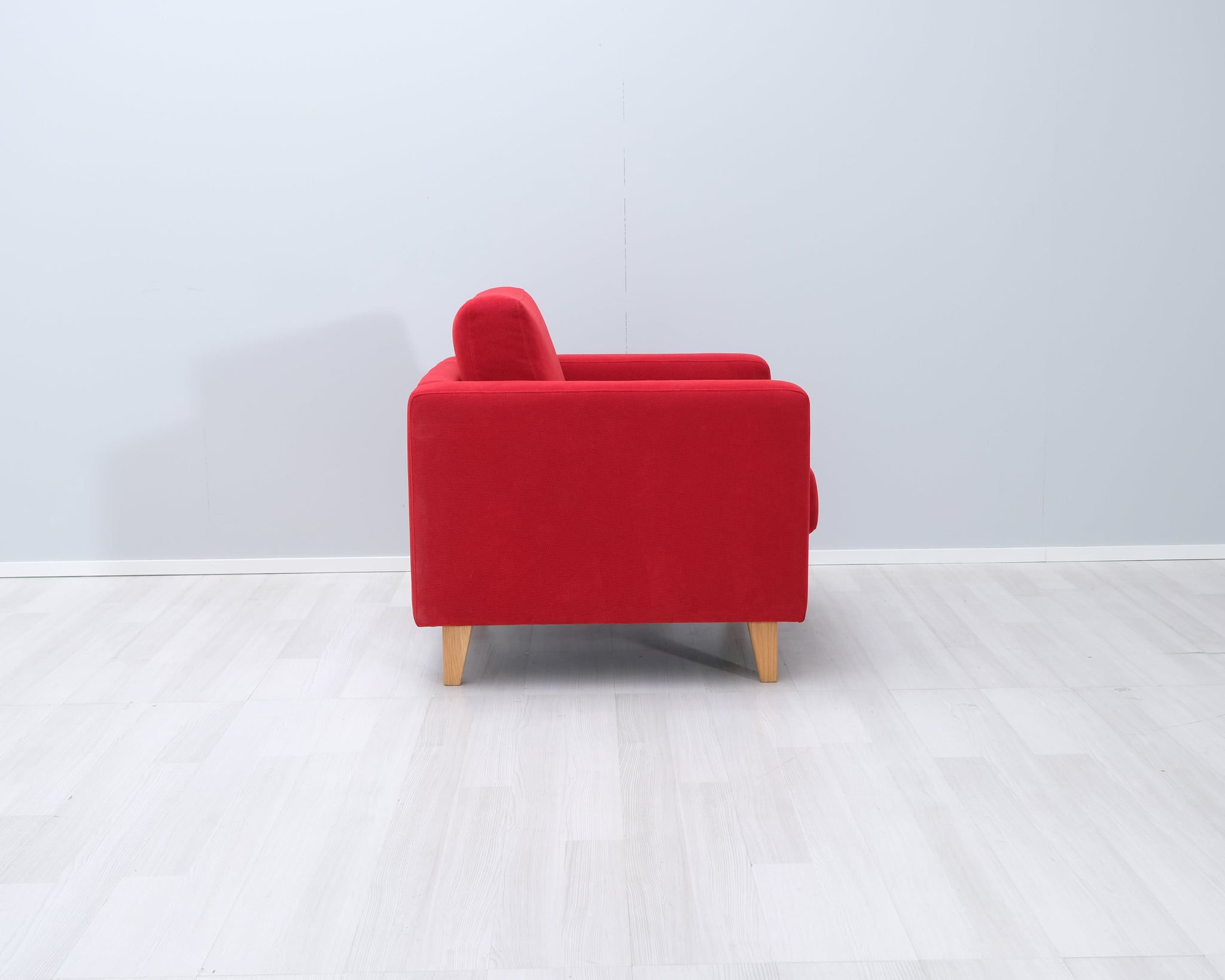 Kotimaisen Adean valmistama punainen kangasnojatuoli. Sijoita nojatuoli esimerkiksi olohuoneen tai makuuhuoneen väripilkuksi.