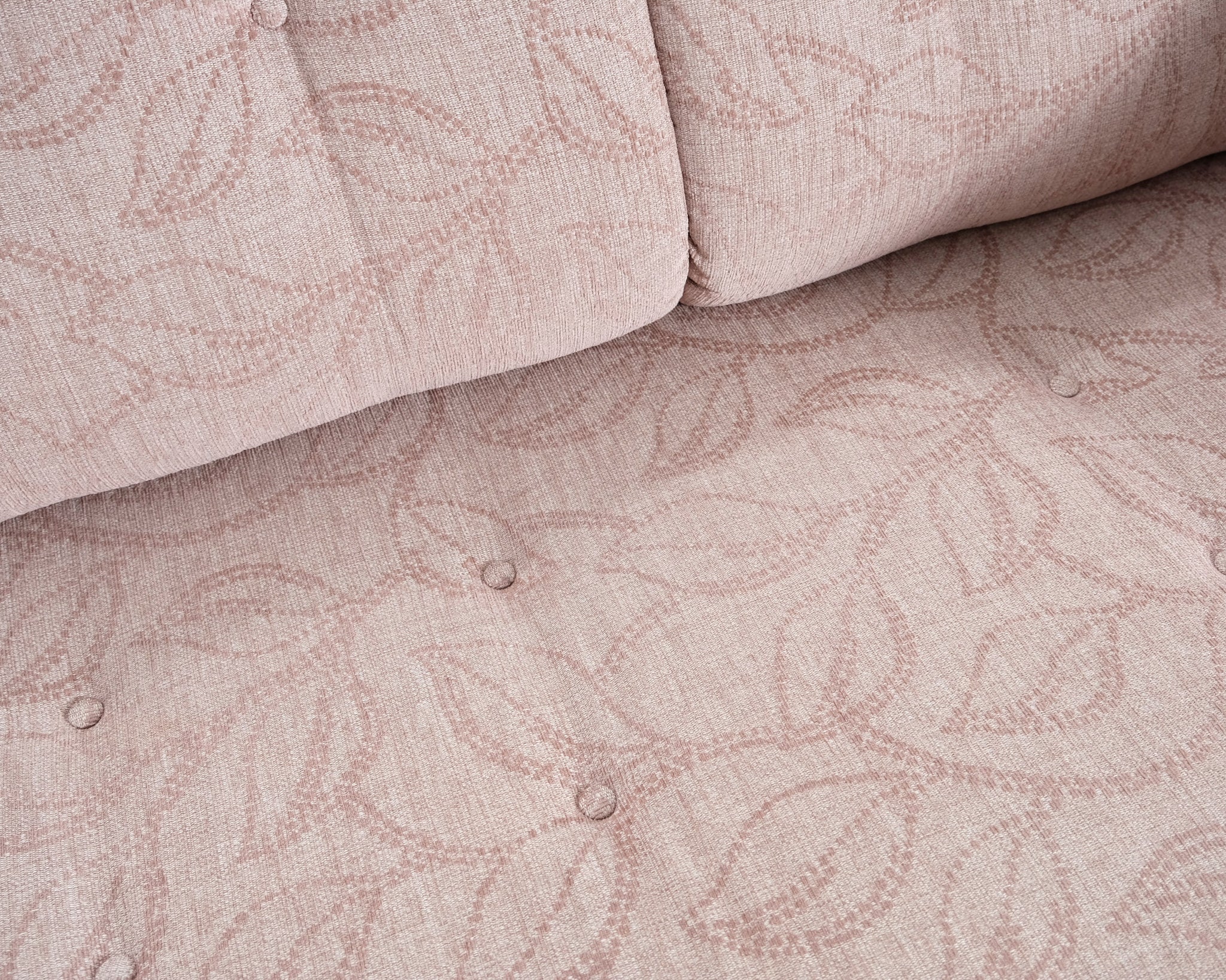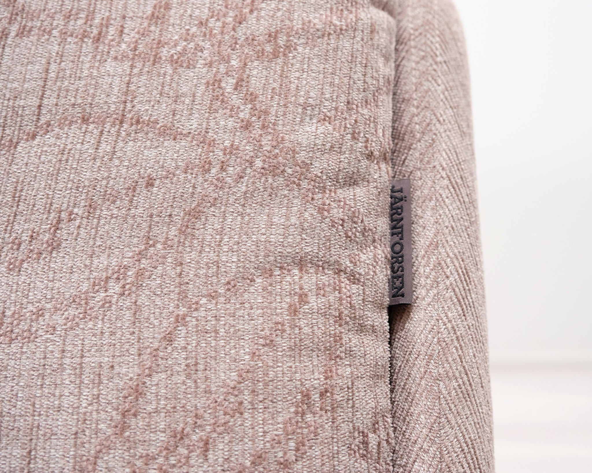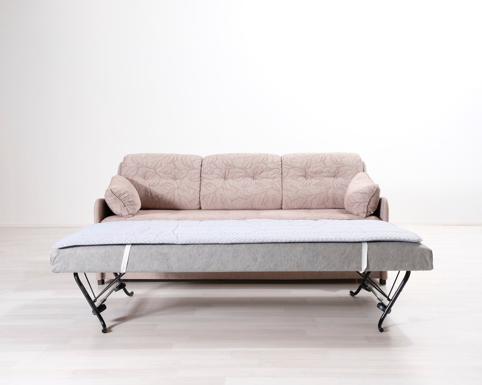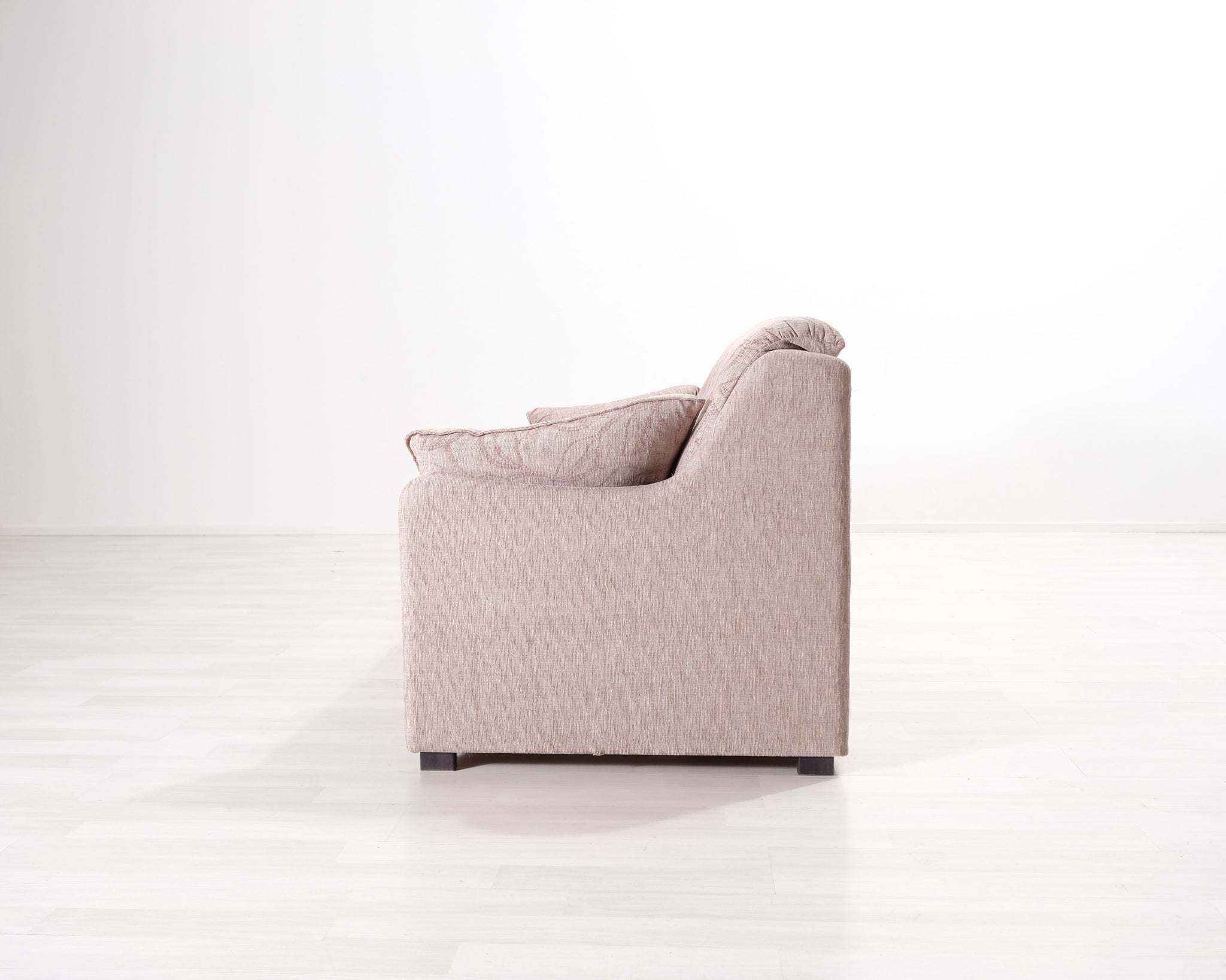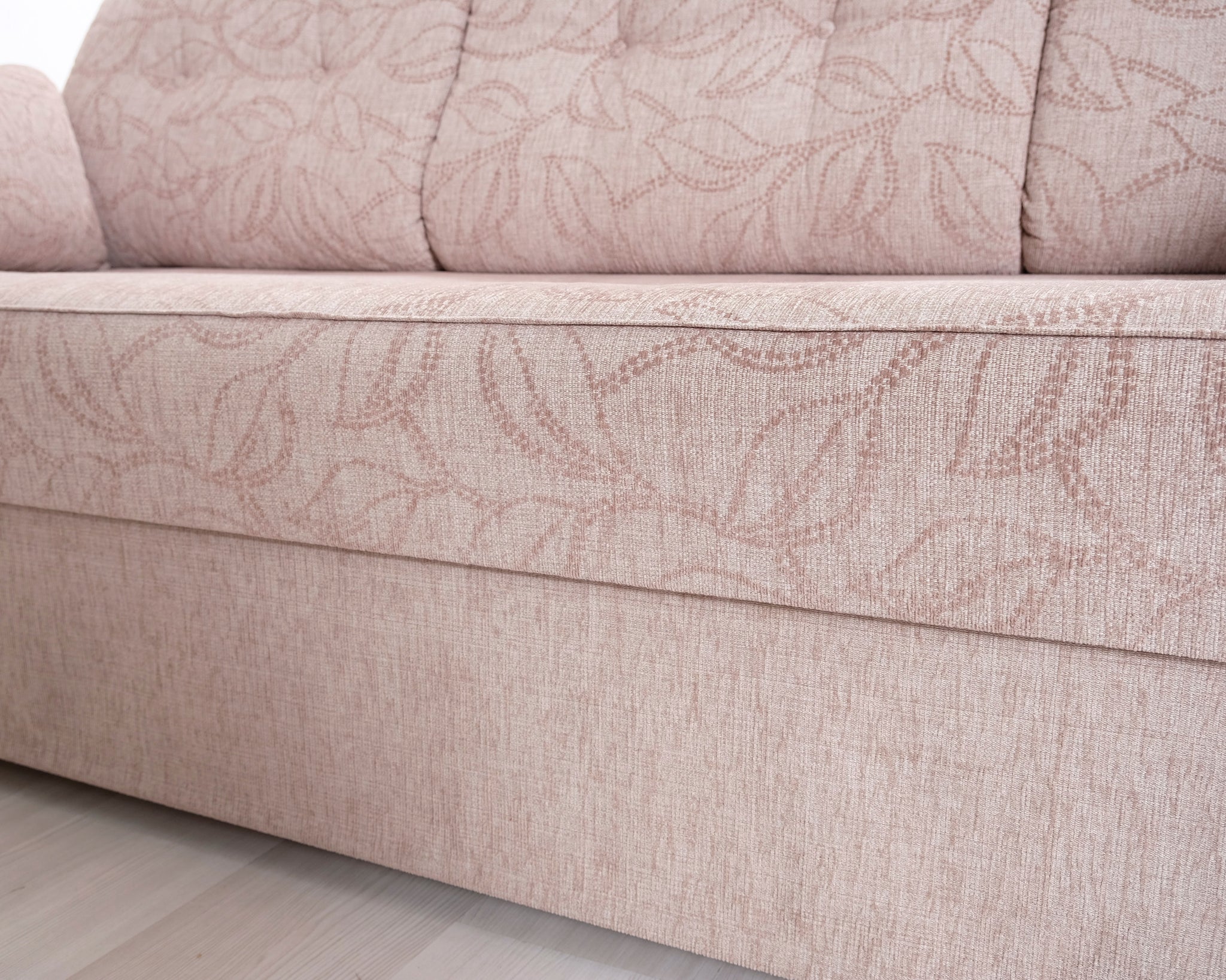 Kolmen istuttava vuodesohva. Beige kangasverhoilu lehtikuviolla.