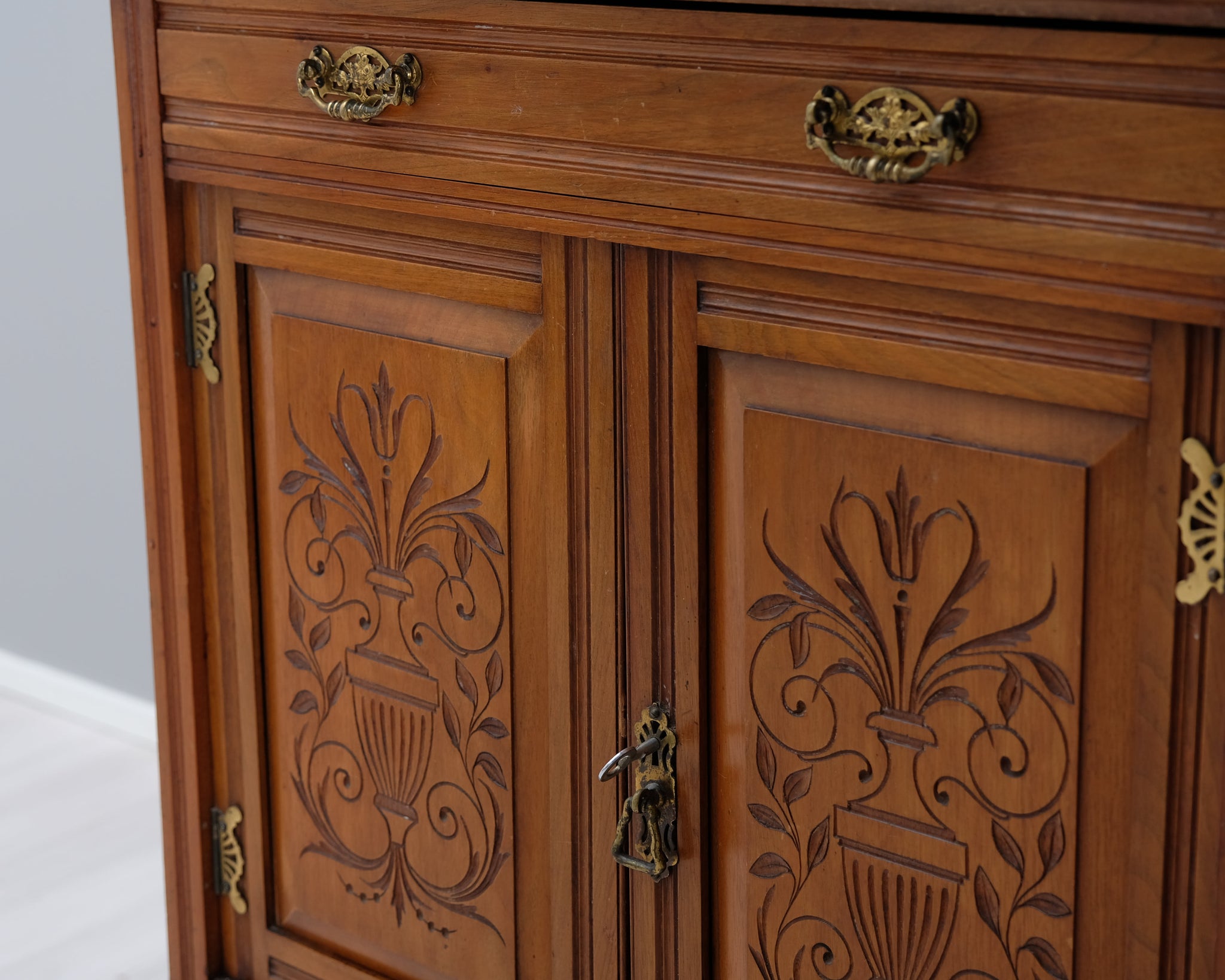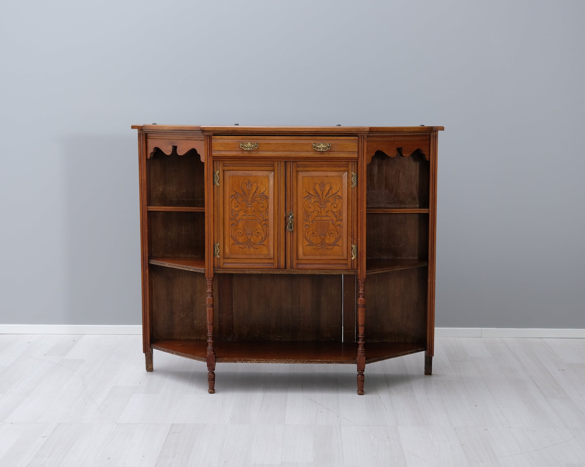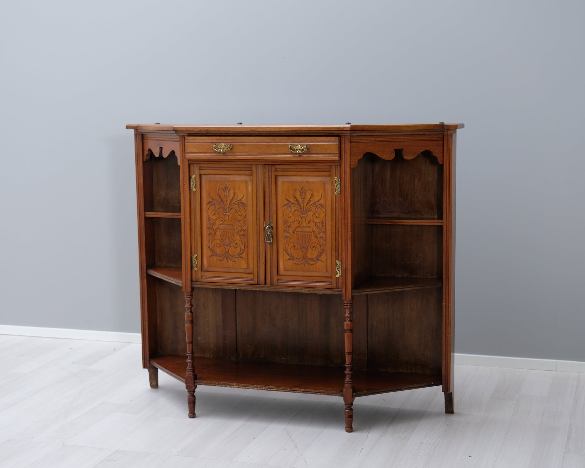 Antiikkinen sivupöytä. Keskellä lukittavat ovet ja ympärillä erikokoisia tasoja. Koristeellisia kaiverruksia.