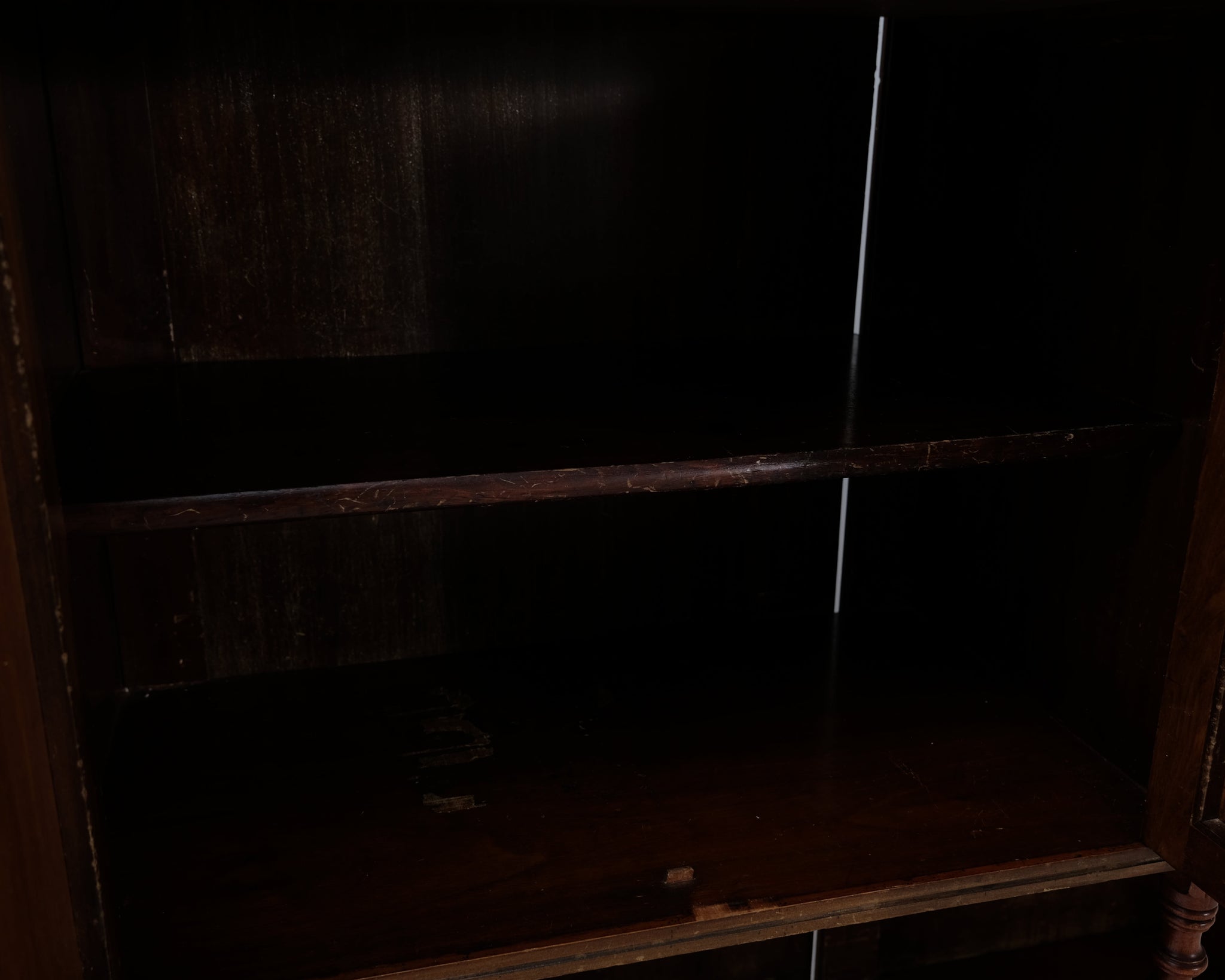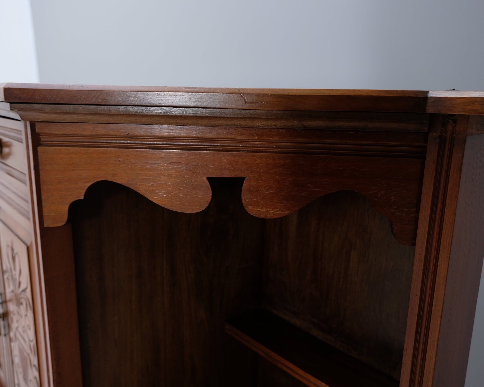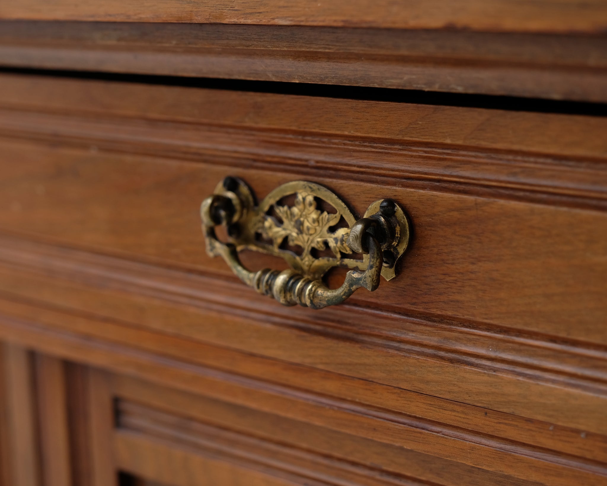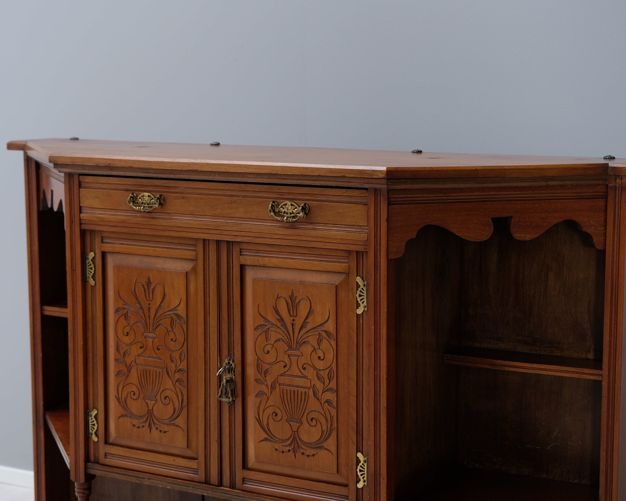 Antiikkinen sivupöytä. Keskellä lukittavat ovet ja ympärillä erikokoisia tasoja. Koristeellisia kaiverruksia.
