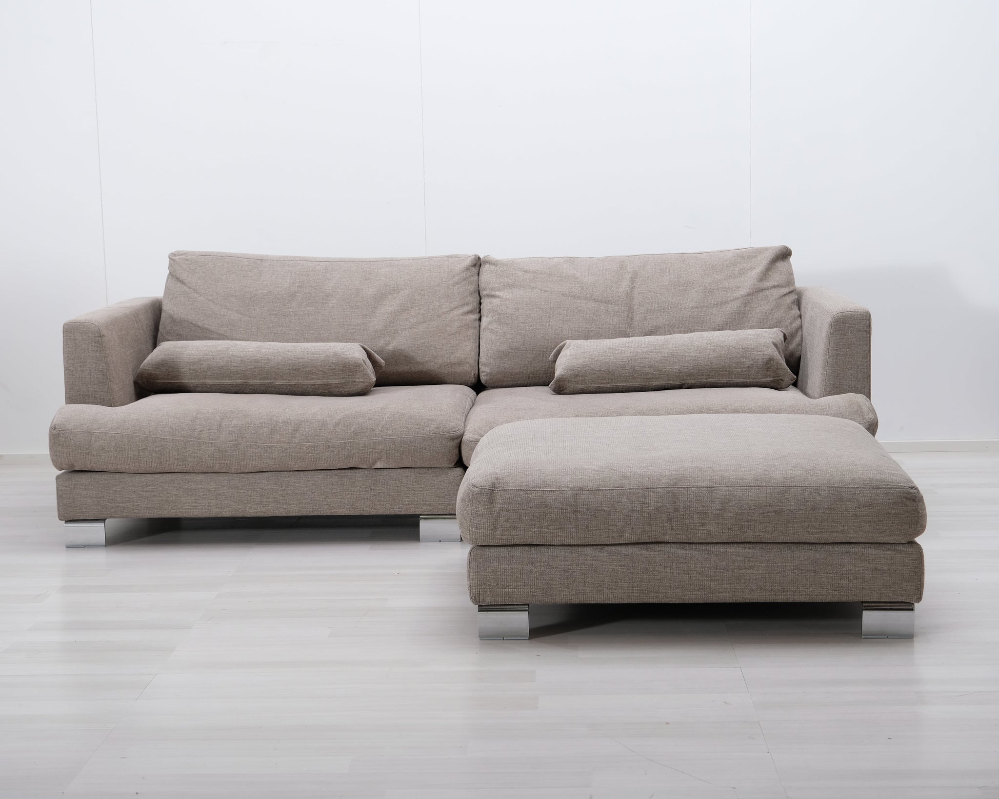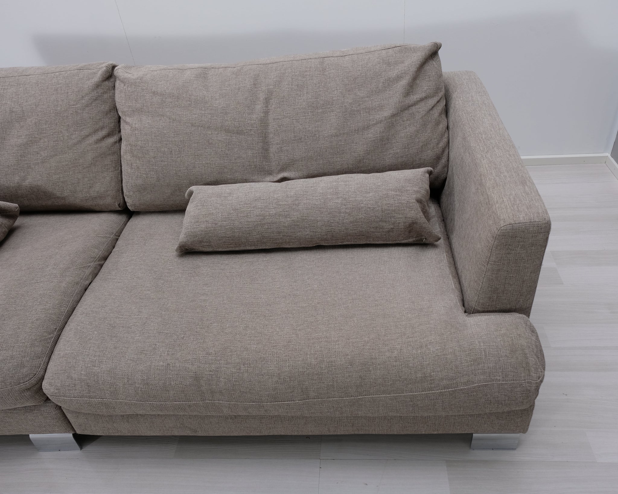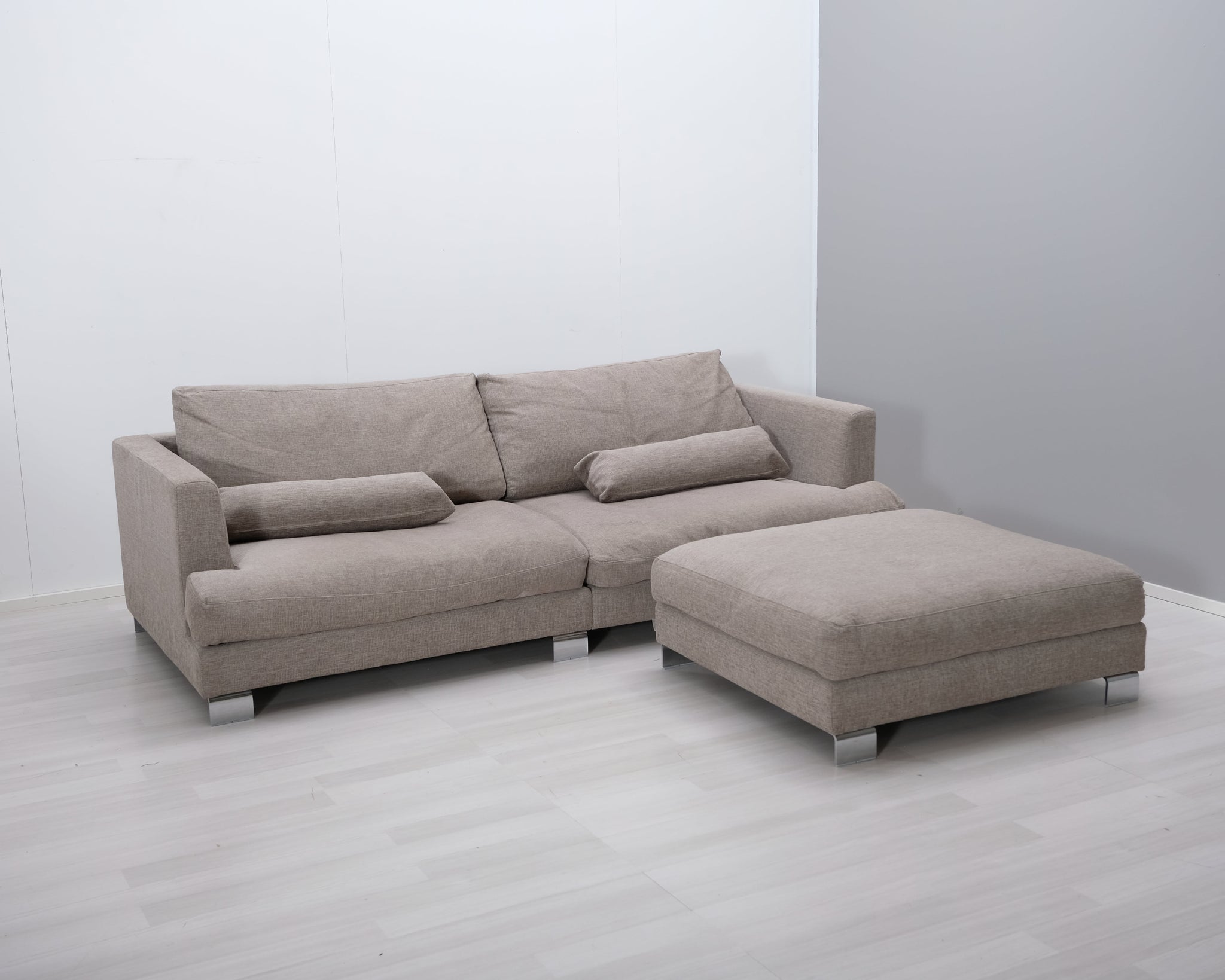 Kolmenistuttava kangassohva ja yhteensopiva rahi. Kaksi pitkulaista heittotyynyä. Harmaanbeige verhoilu.