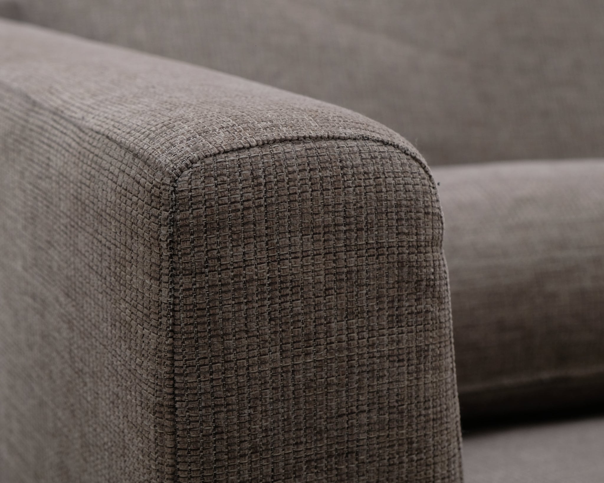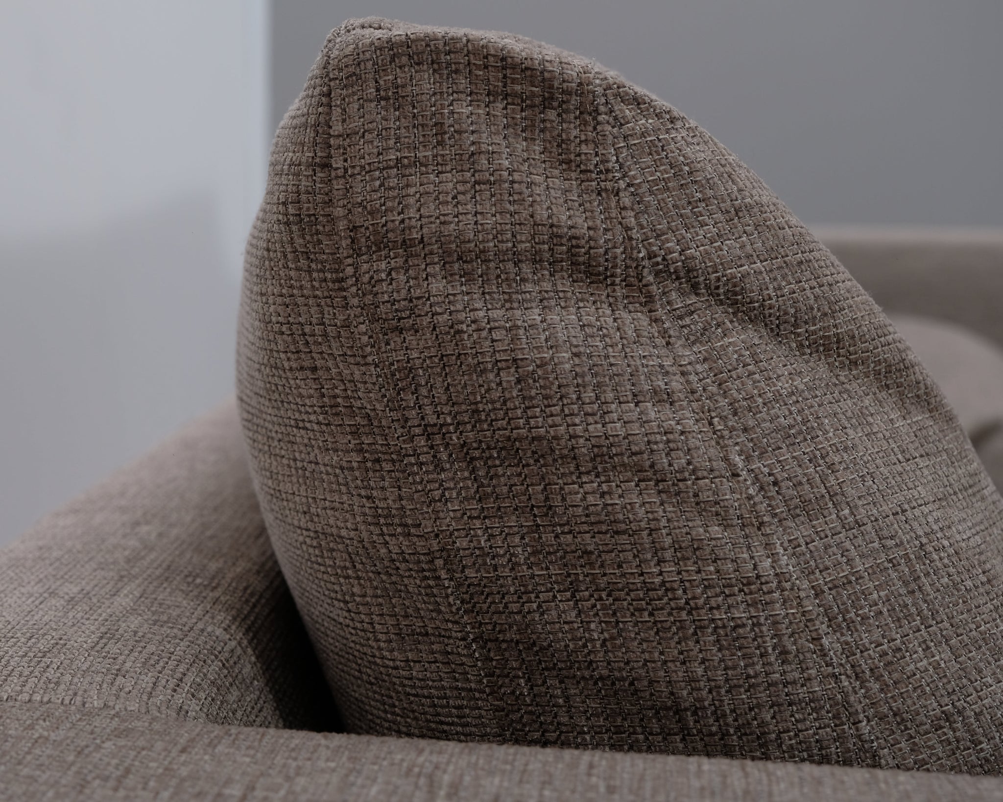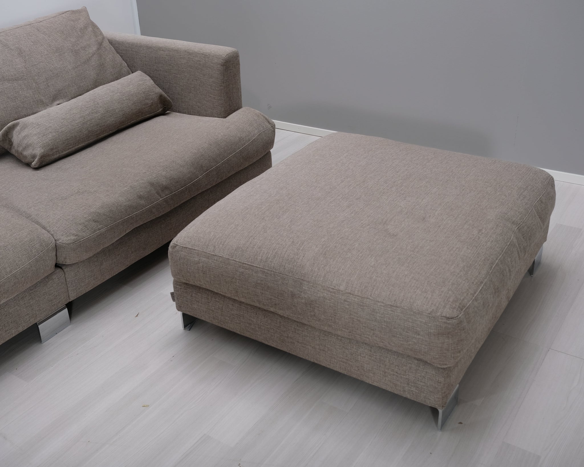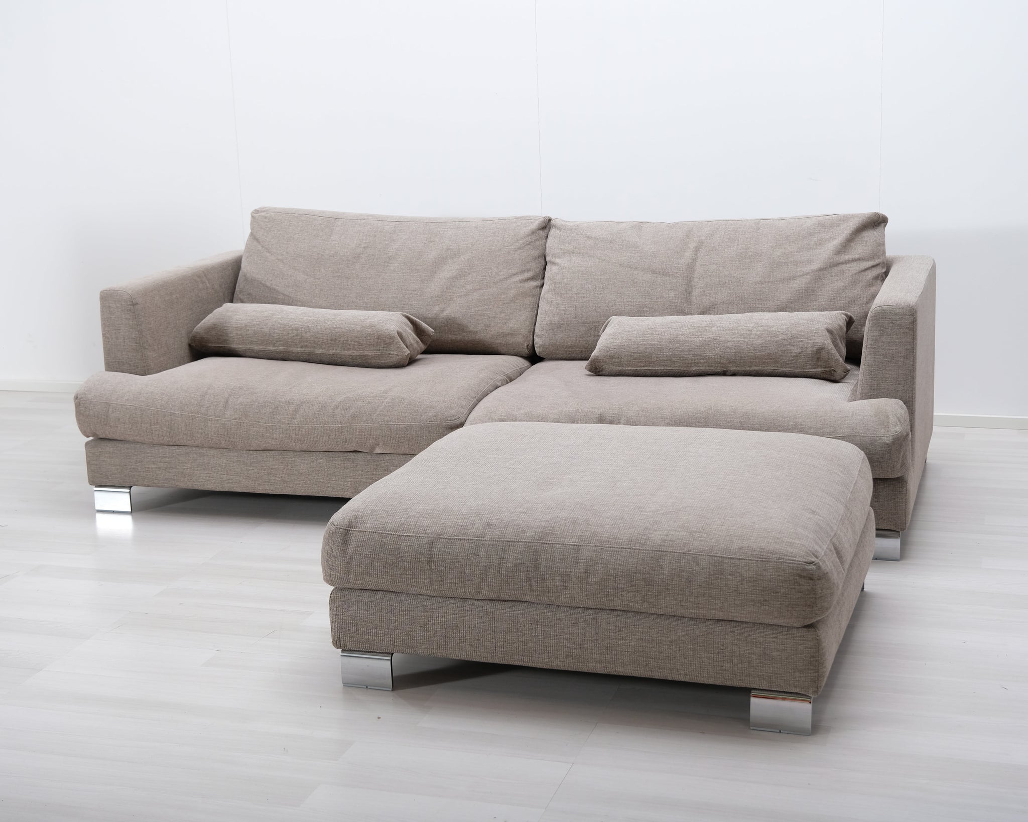 Kolmenistuttava kangassohva ja yhteensopiva rahi. Kaksi pitkulaista heittotyynyä. Harmaanbeige verhoilu.