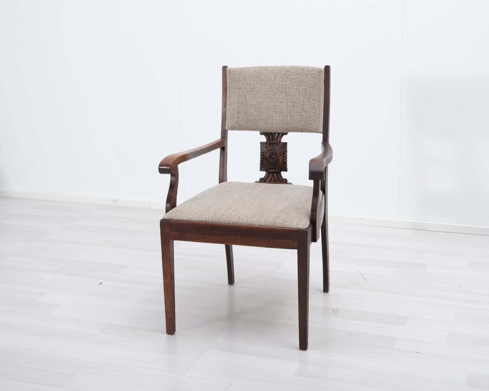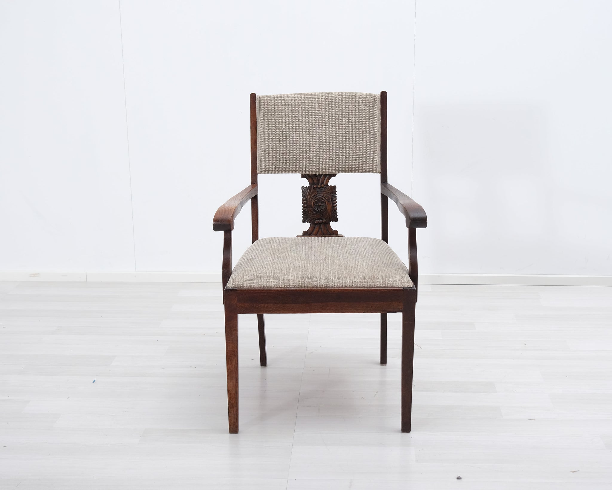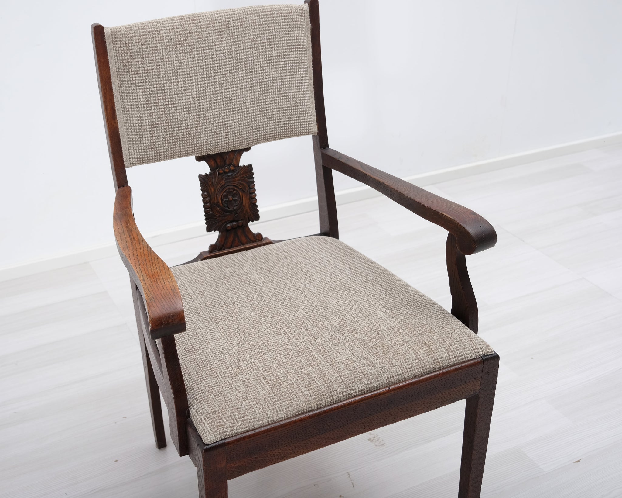 Upeilla yksityiskohdilla varusteltu kangasverhoiltu tuoli. Kalusto 40-luvulta kokopuuta, puusepän käsin rakentama, tukevaa tekoa. Entisöity ja kangasverhoilu vaihdettu 2-vuotta sitten. Uniikkikappale.