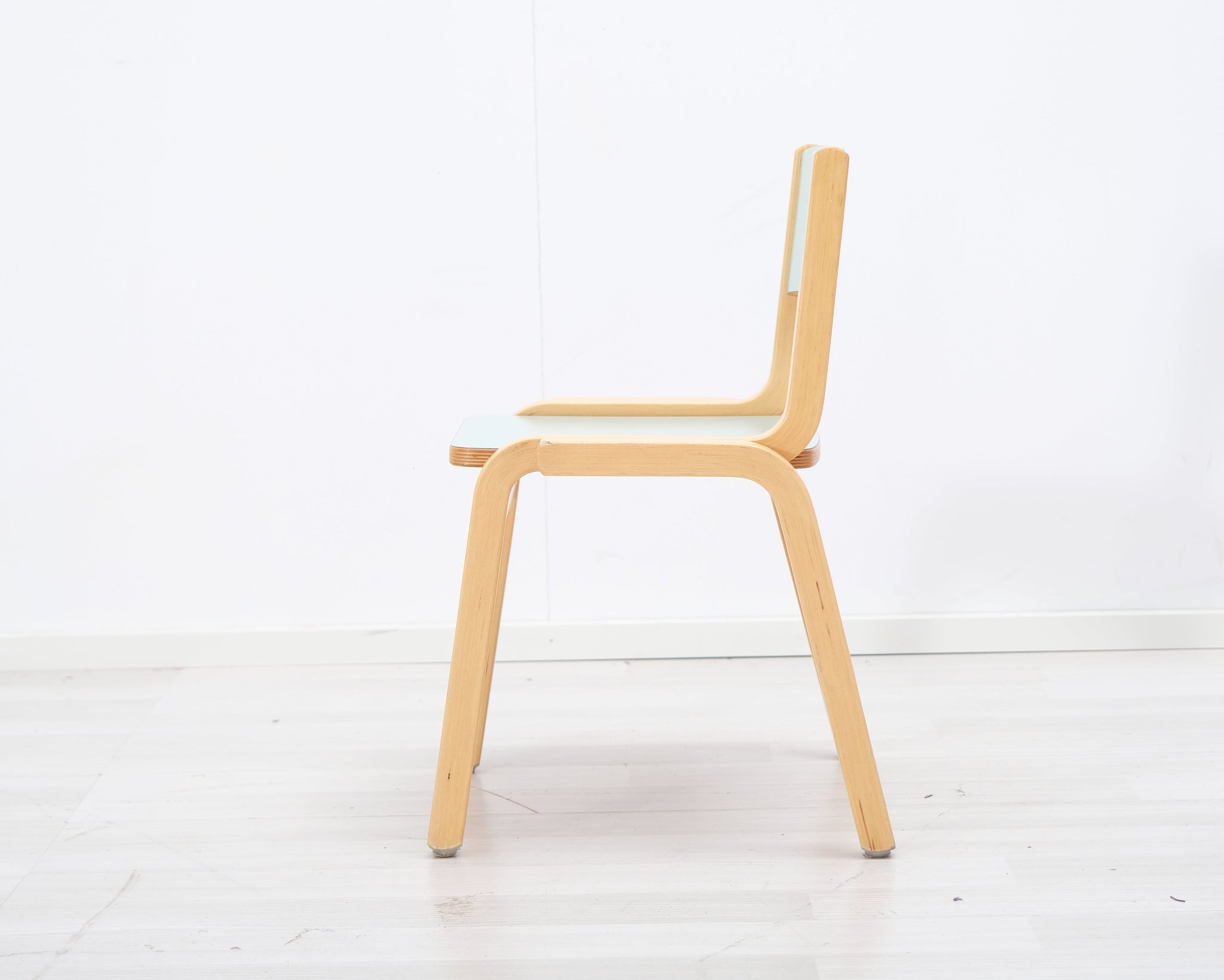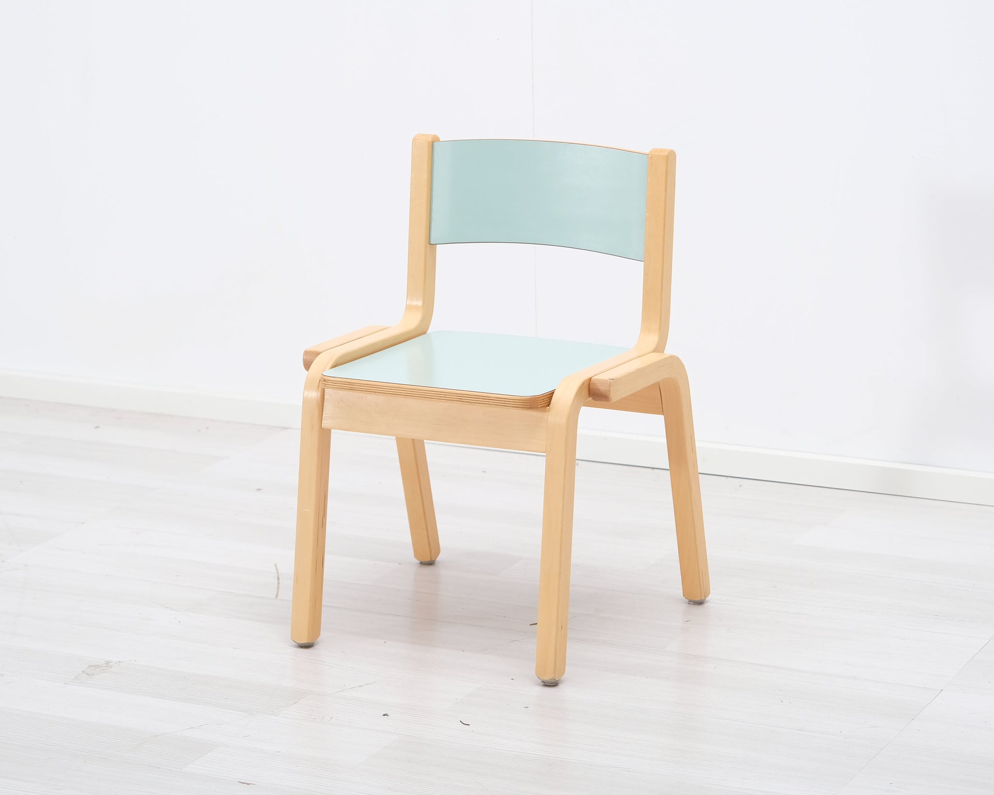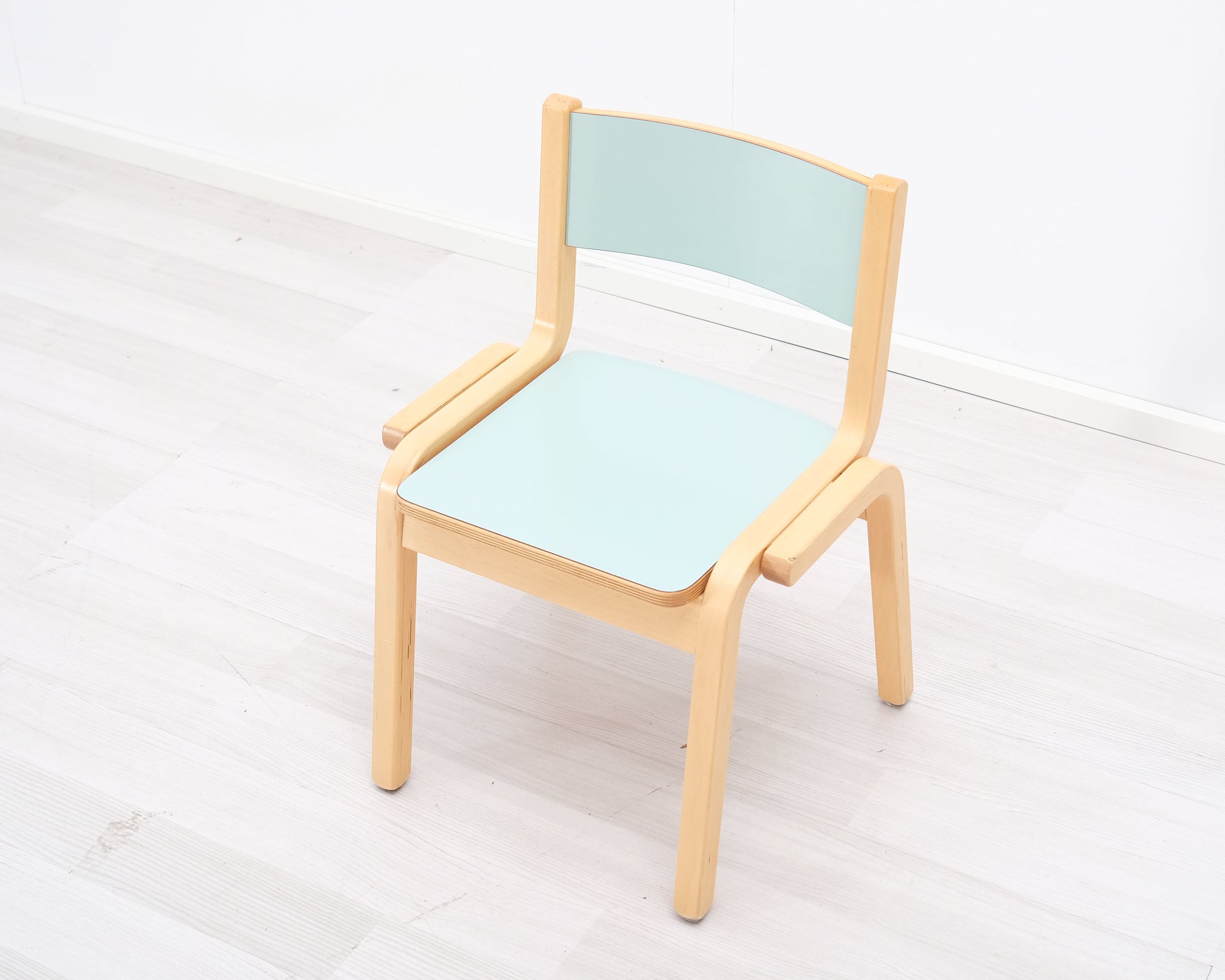 Airiston lastentuoli. Istuin ja selkänoja vaaleansinistä korkeapainelaminaattia. Jalat taivutettua koivua.