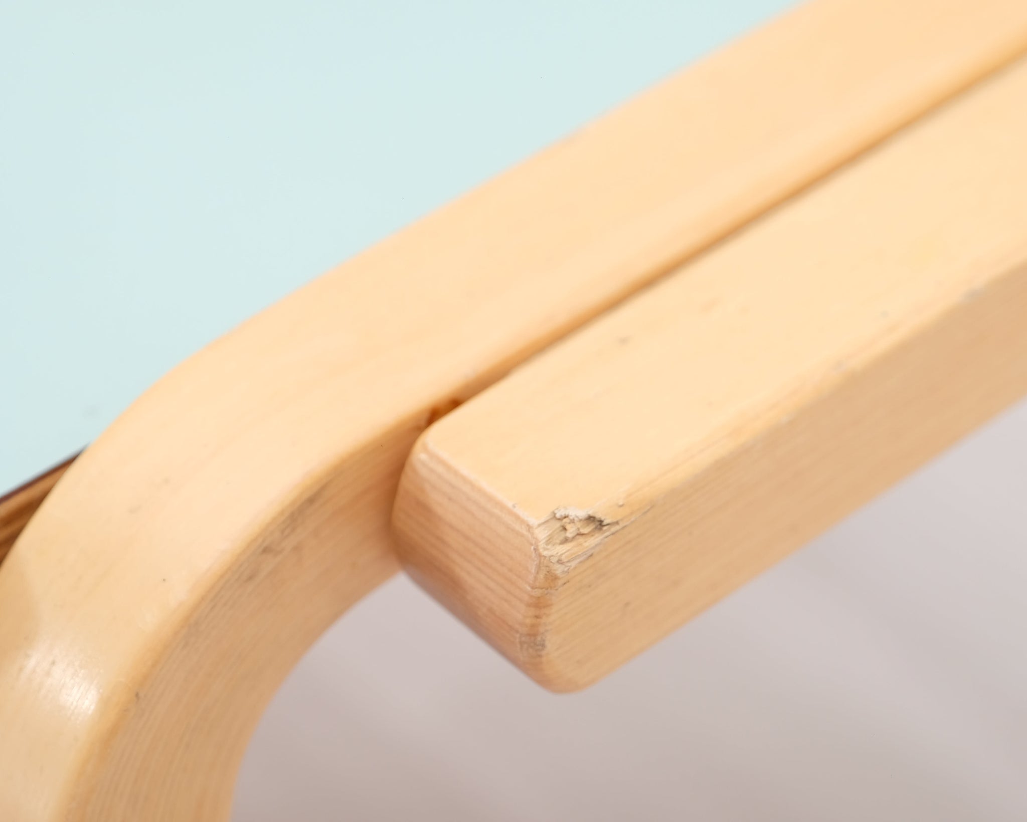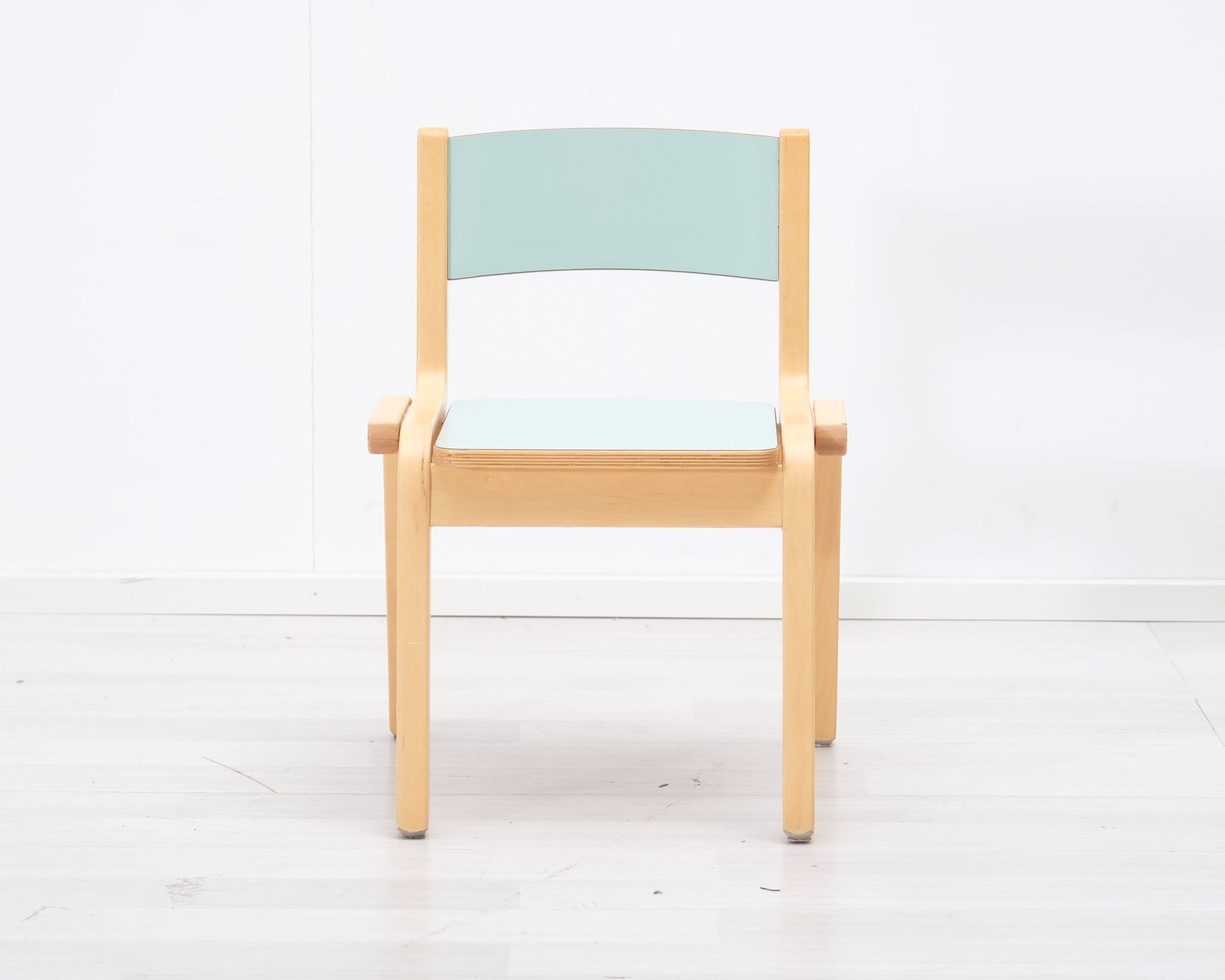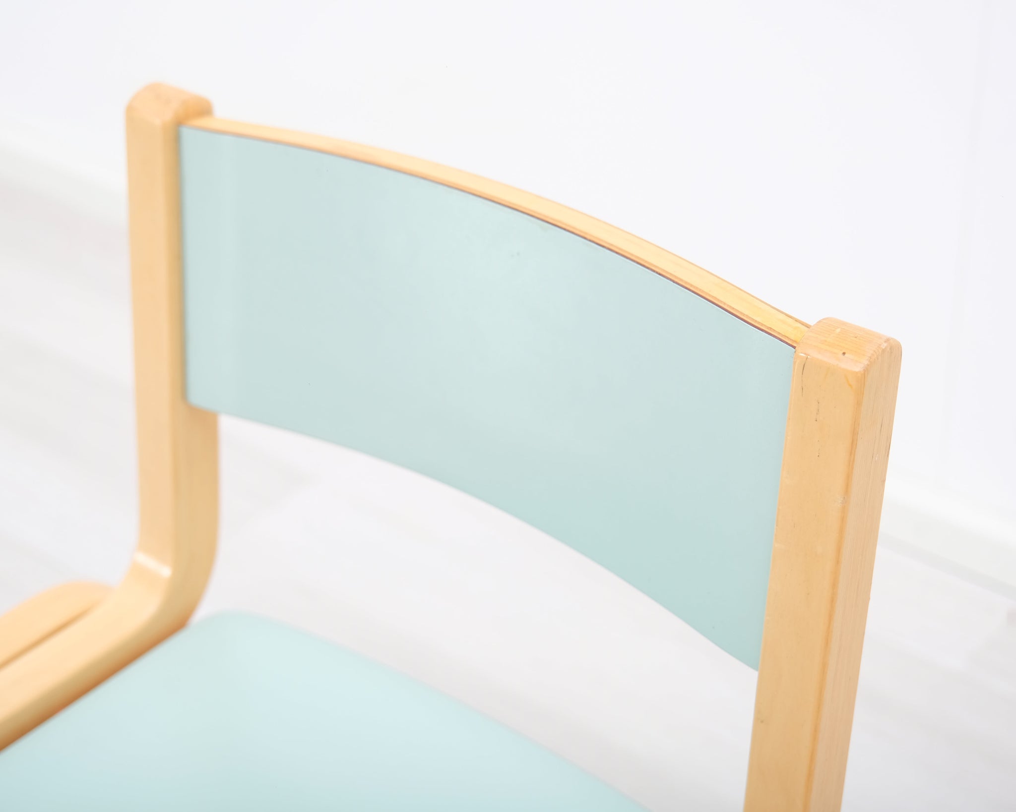 Airiston lastentuoli. Istuin ja selkänoja vaaleansinistä korkeapainelaminaattia. Jalat taivutettua koivua.