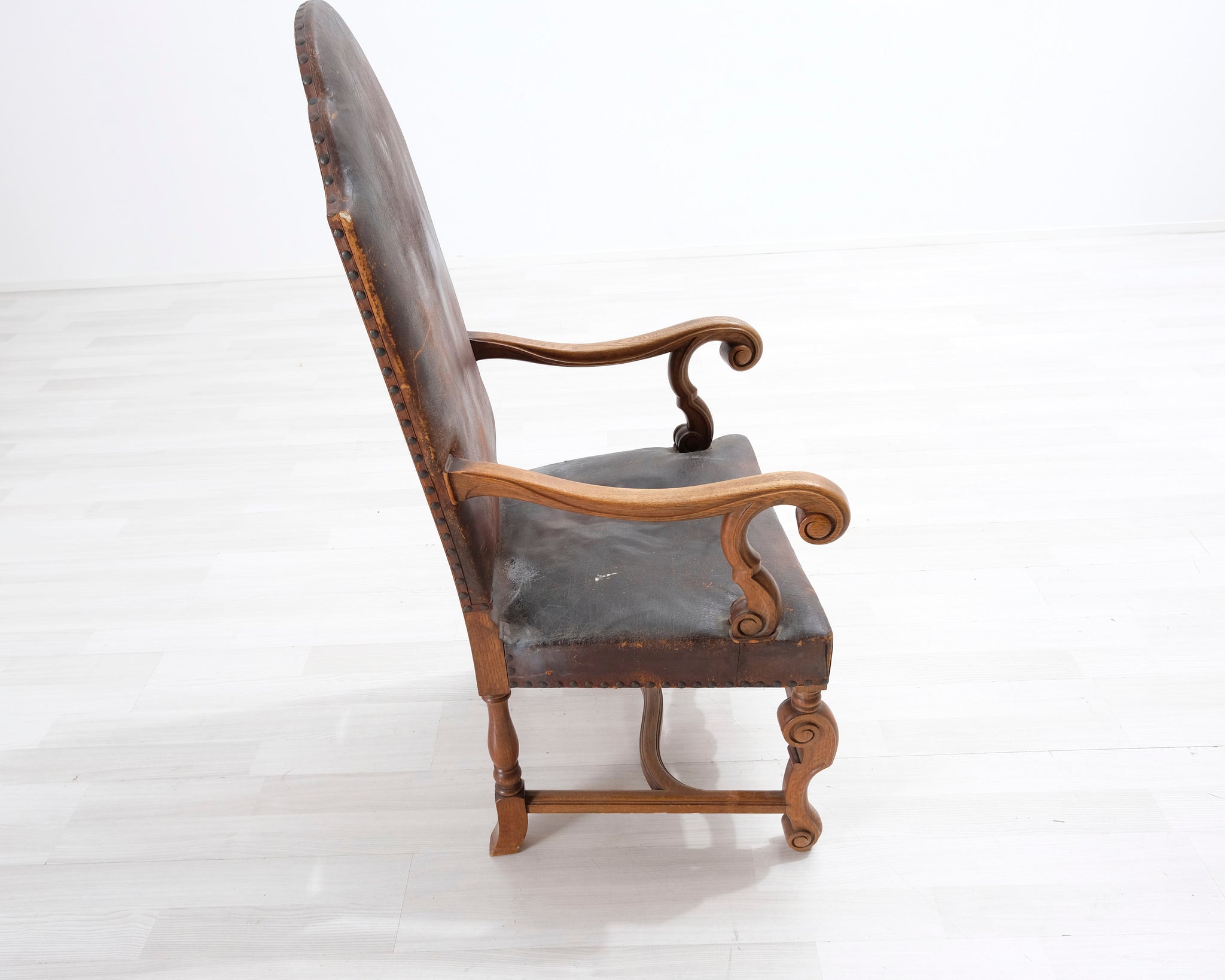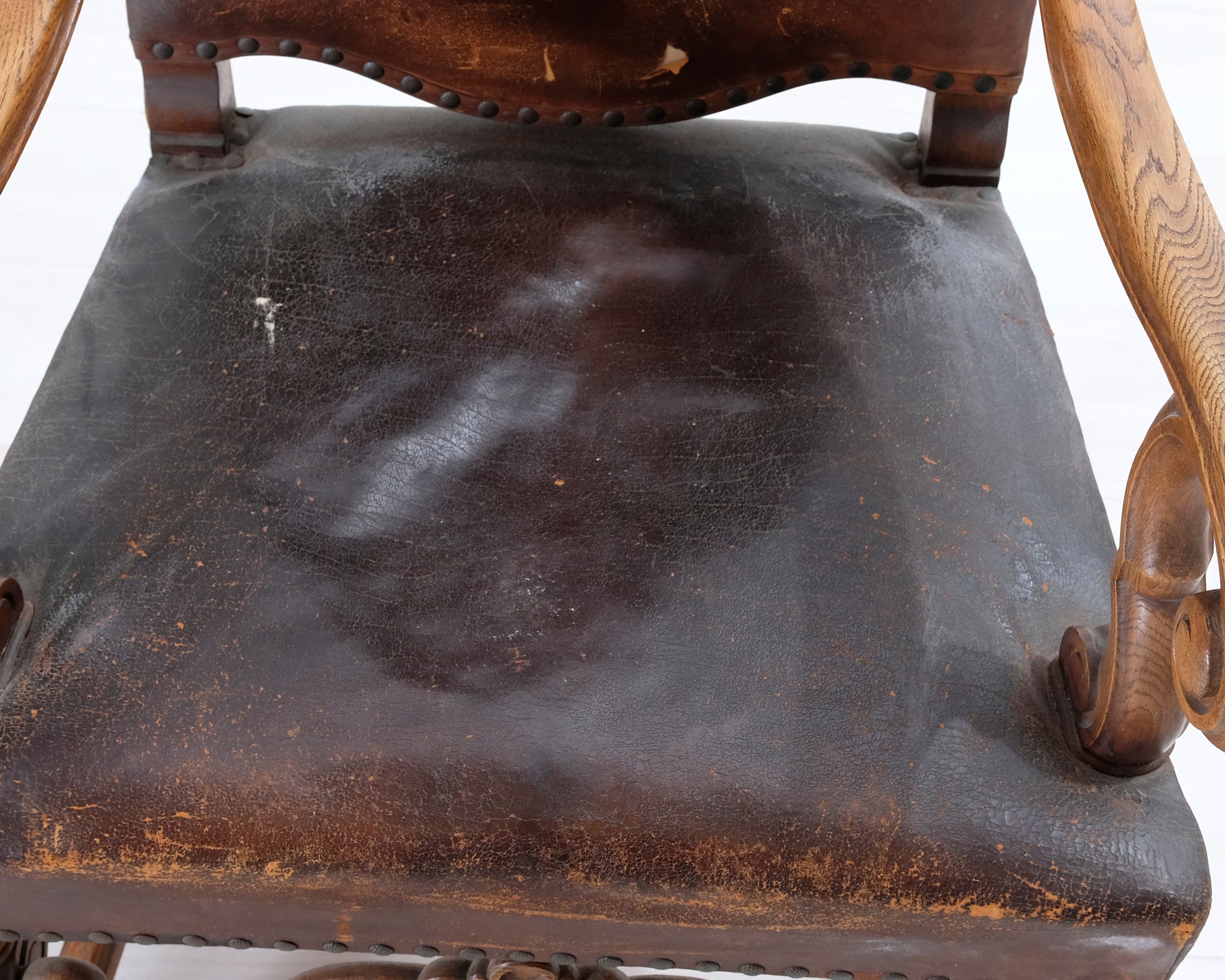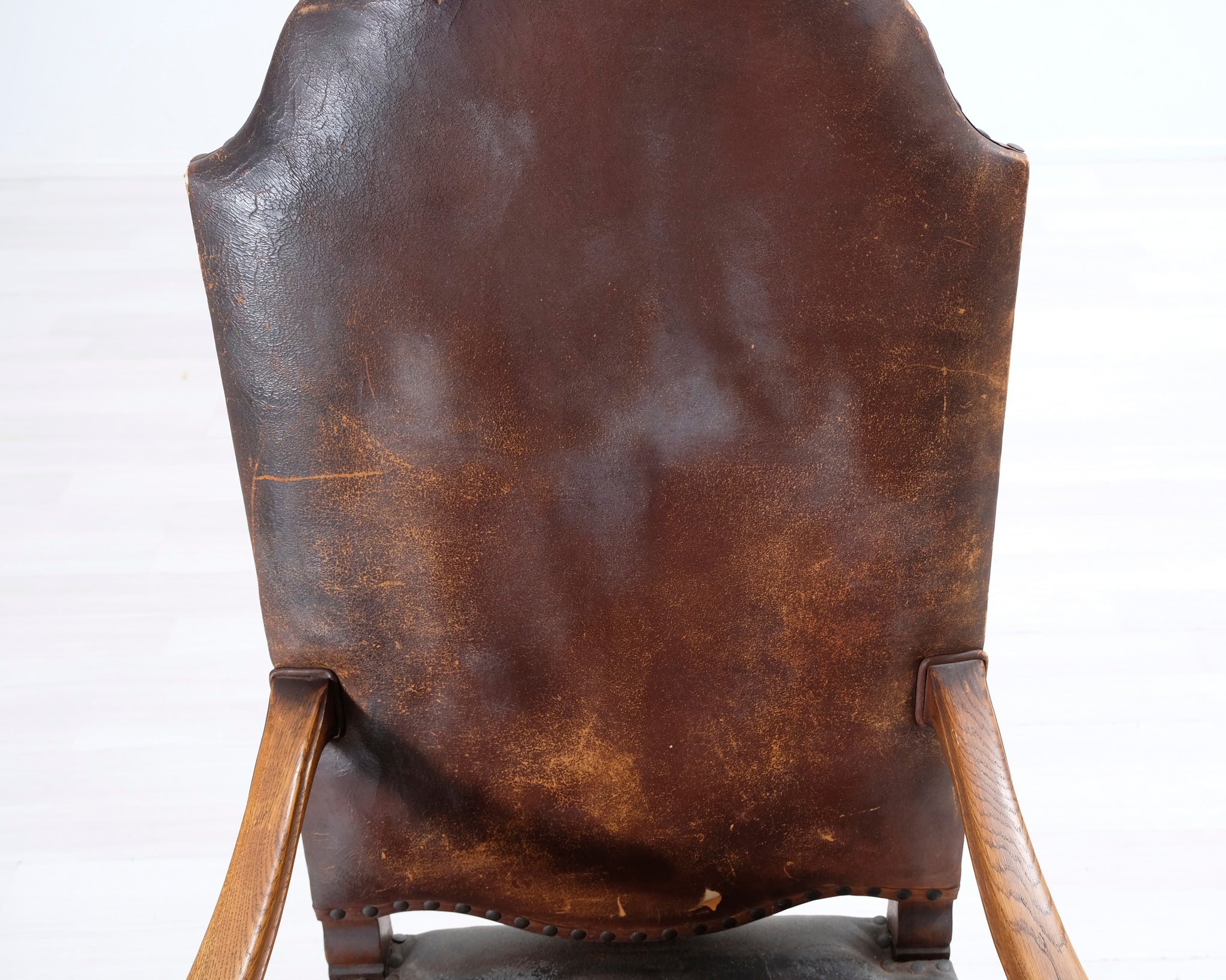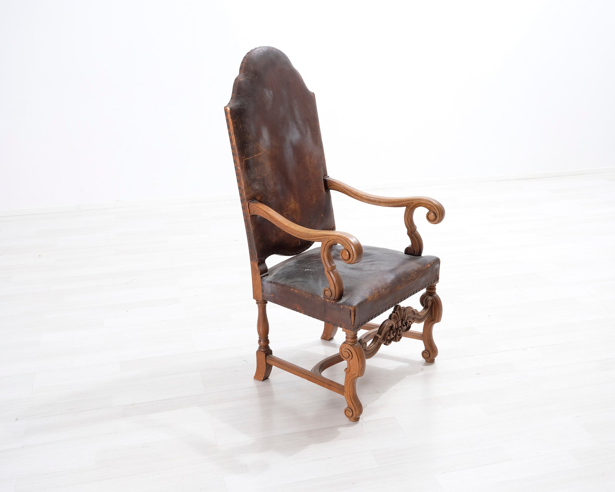 Antiikkinen tuoli, jonka istuin ja selkänoja on verhoiltu ruskealla nahalla. Koristeelliset puuosat.