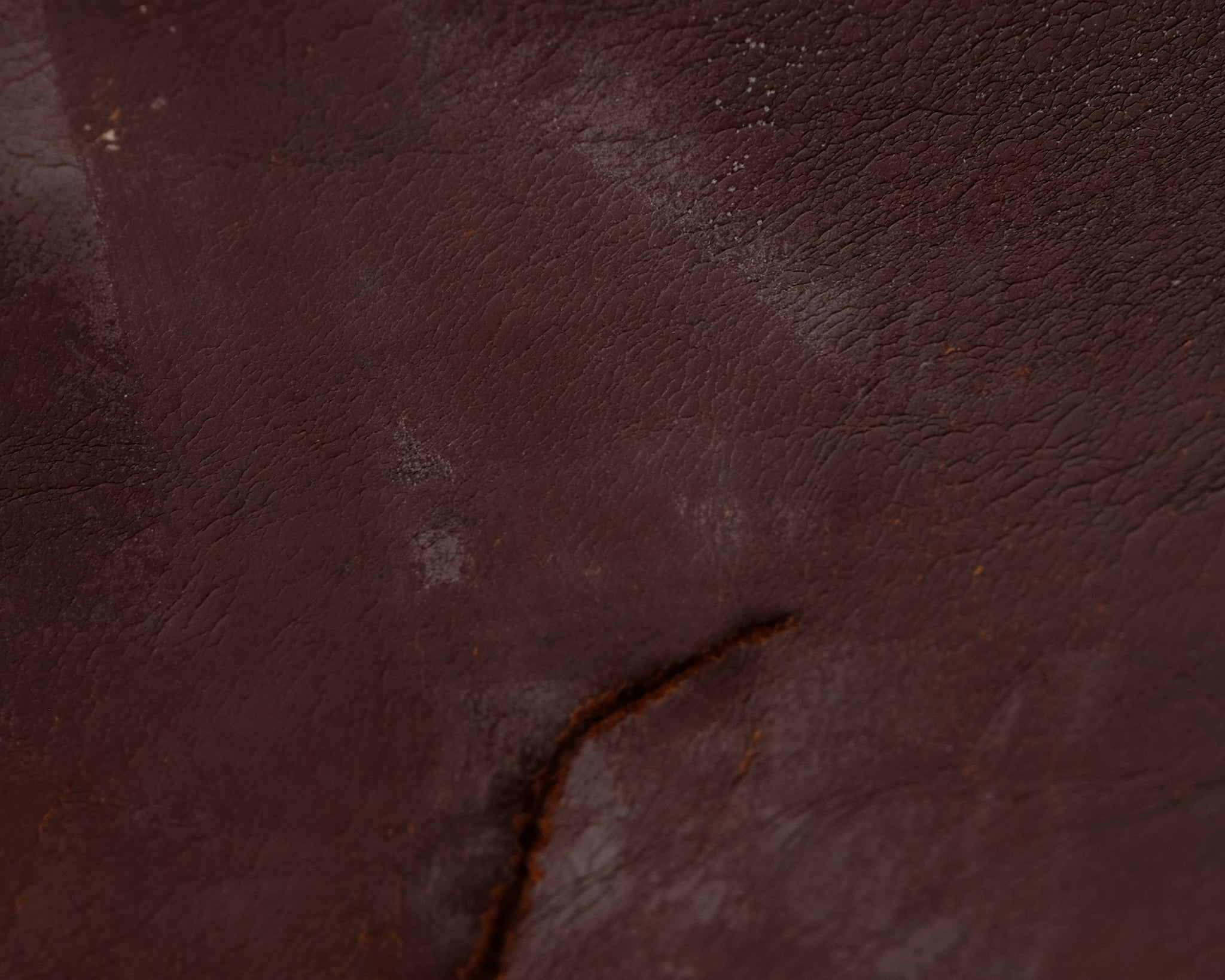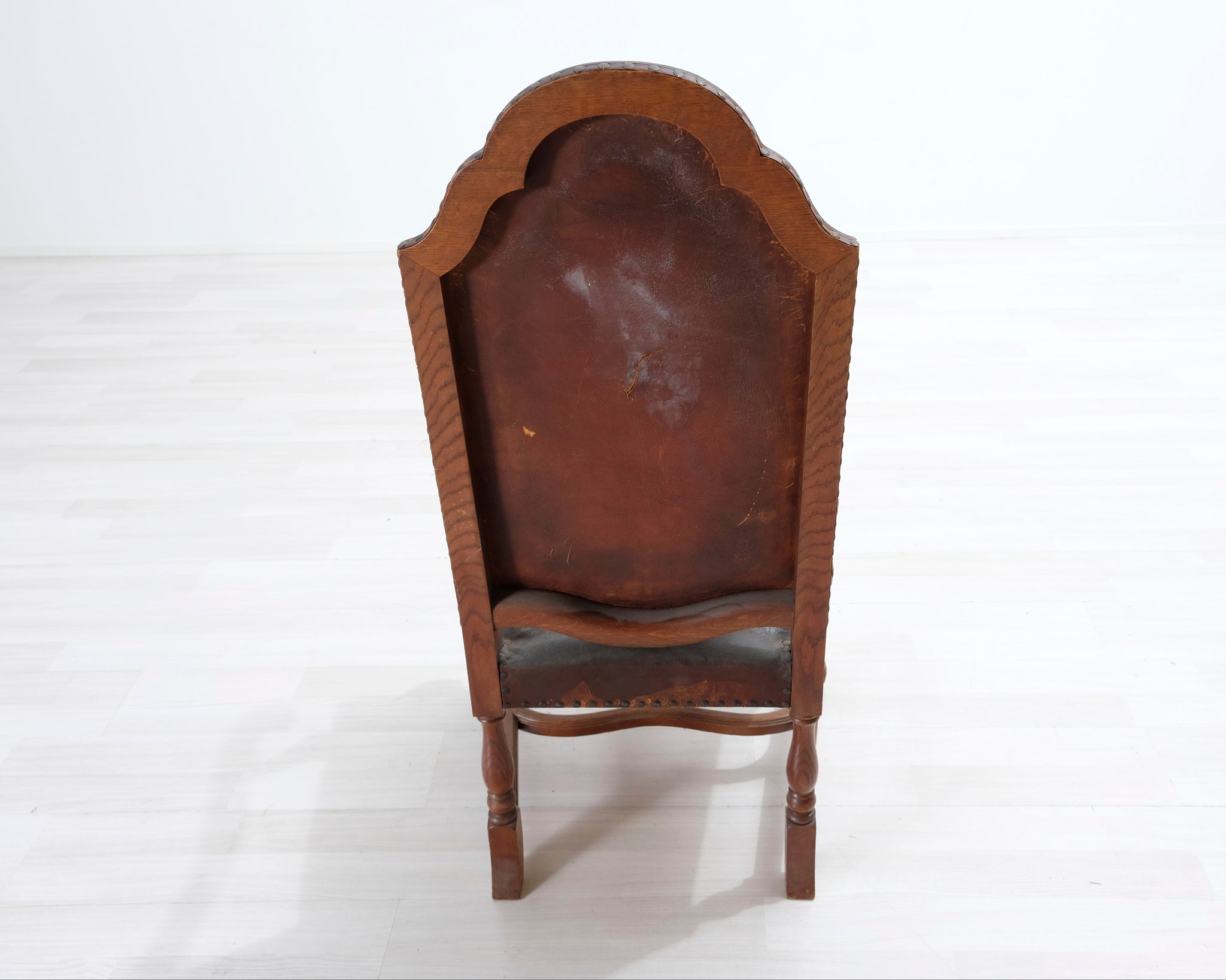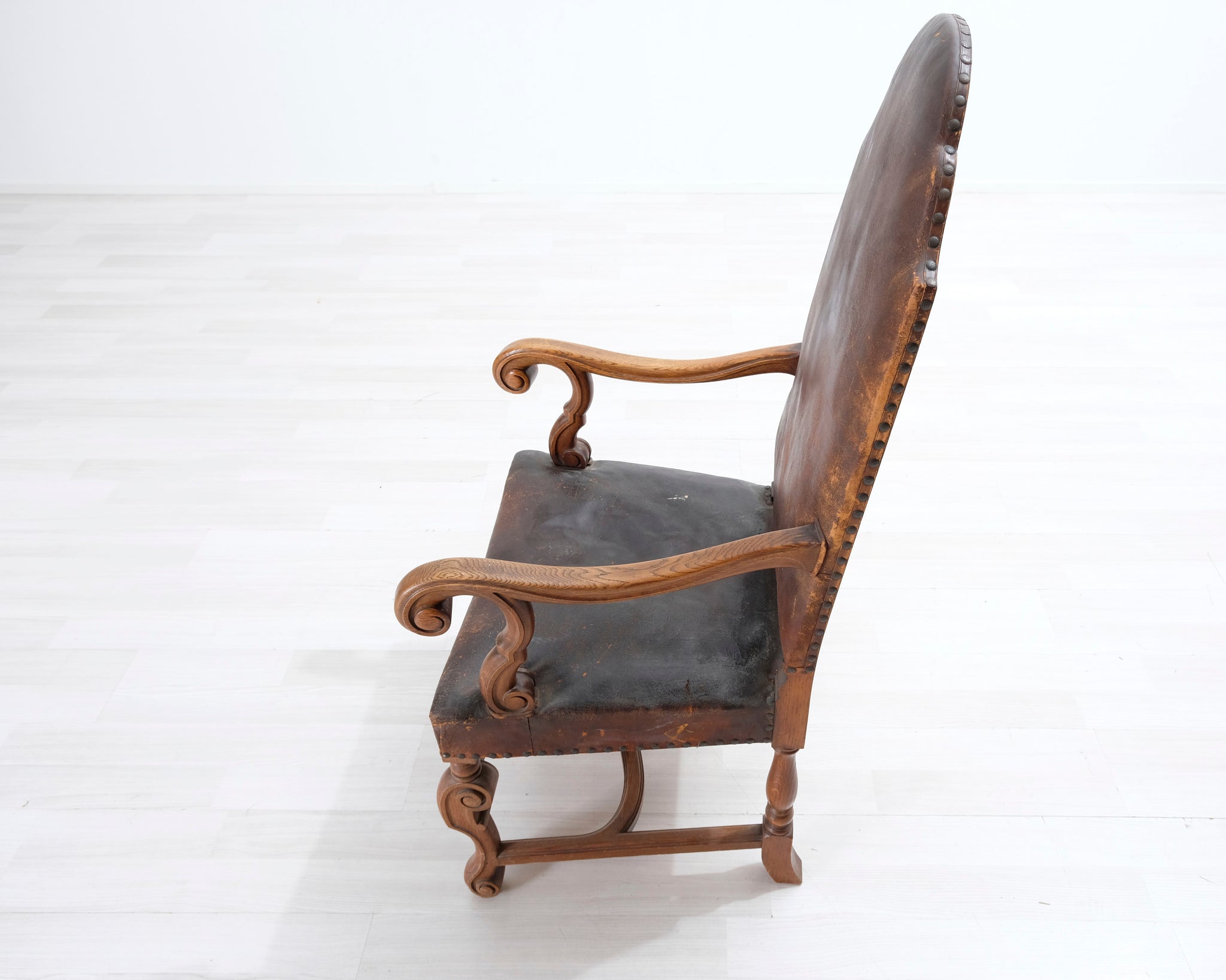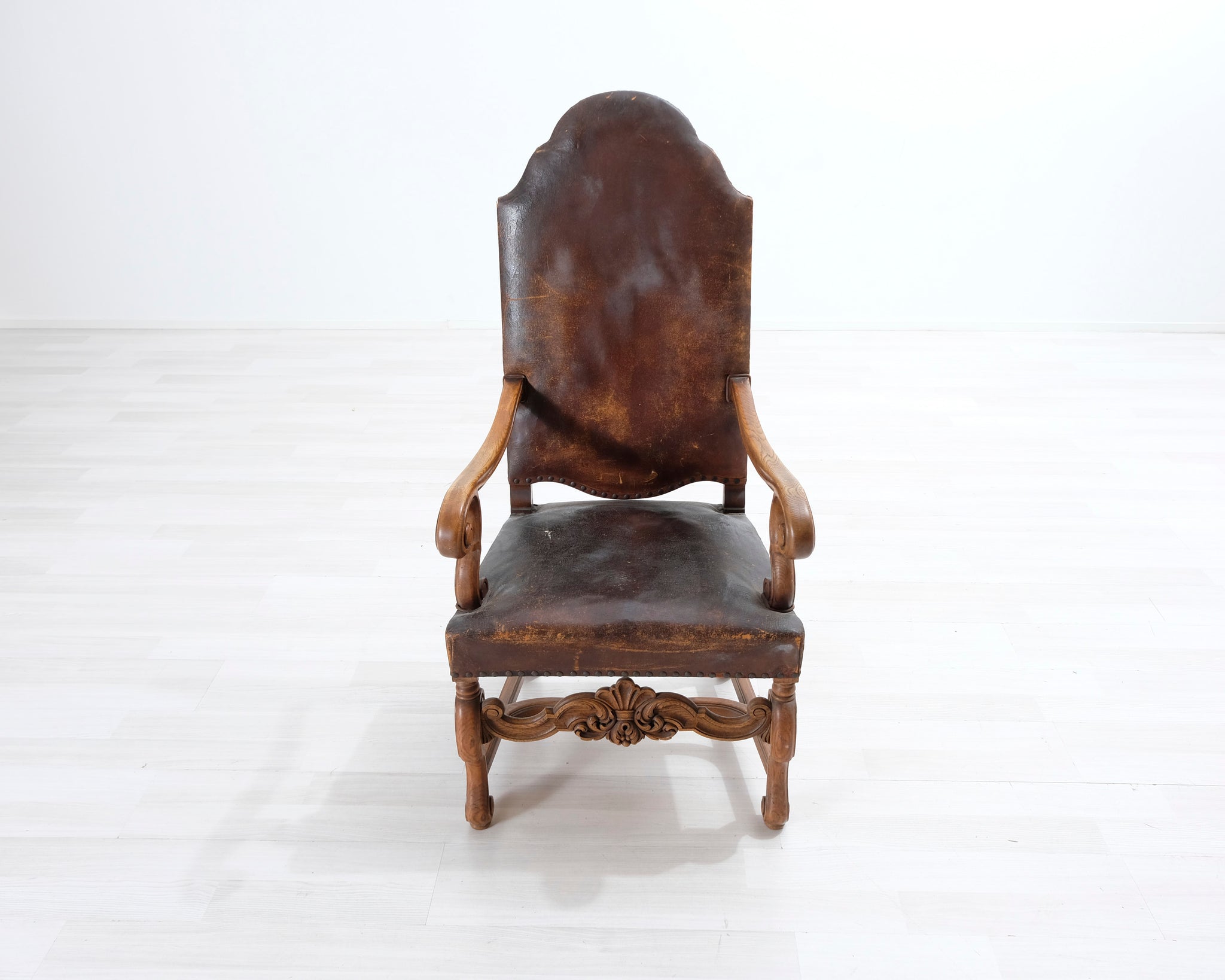 Antiikkinen tuoli, jonka istuin ja selkänoja on verhoiltu ruskealla nahalla. Koristeelliset puuosat.
