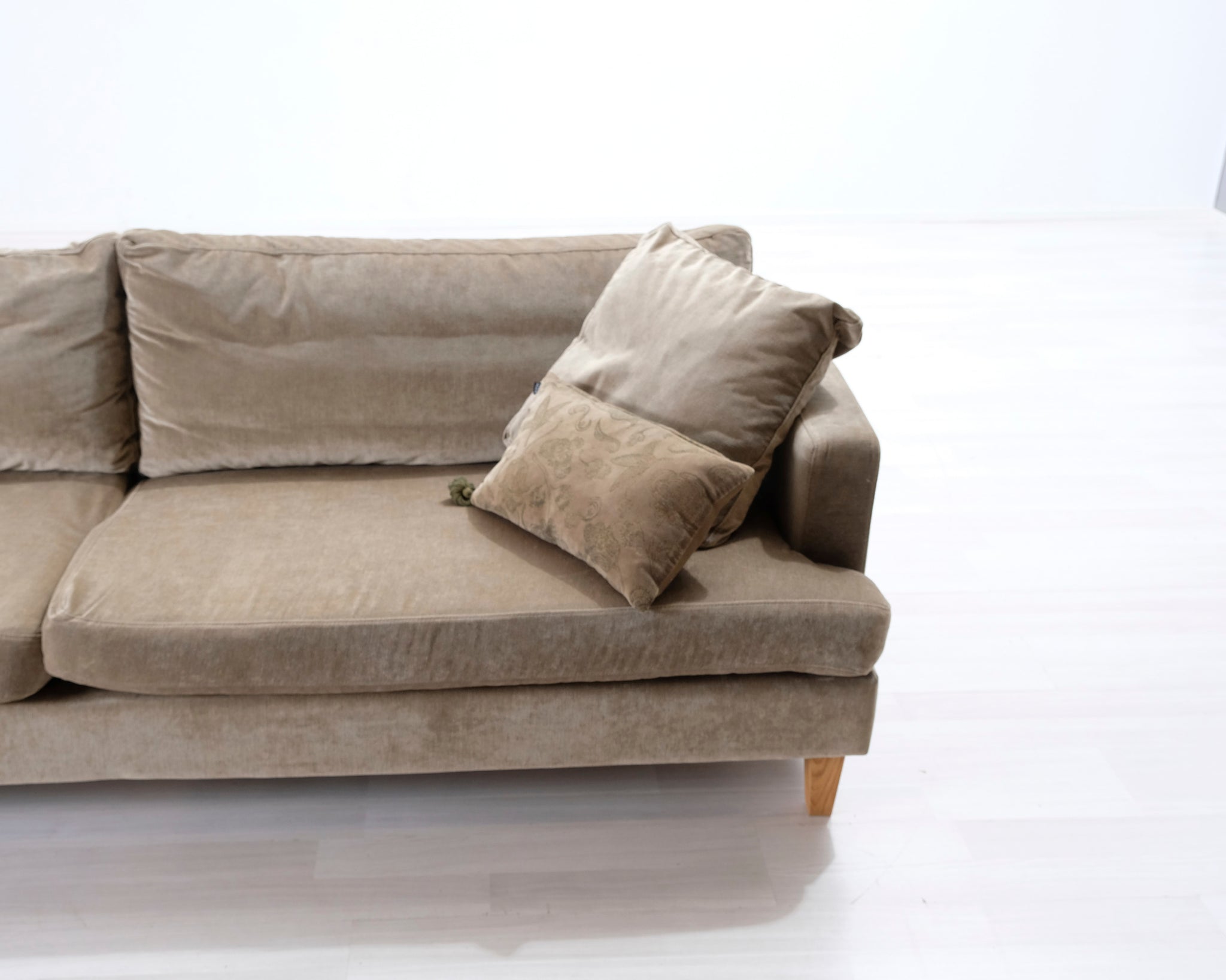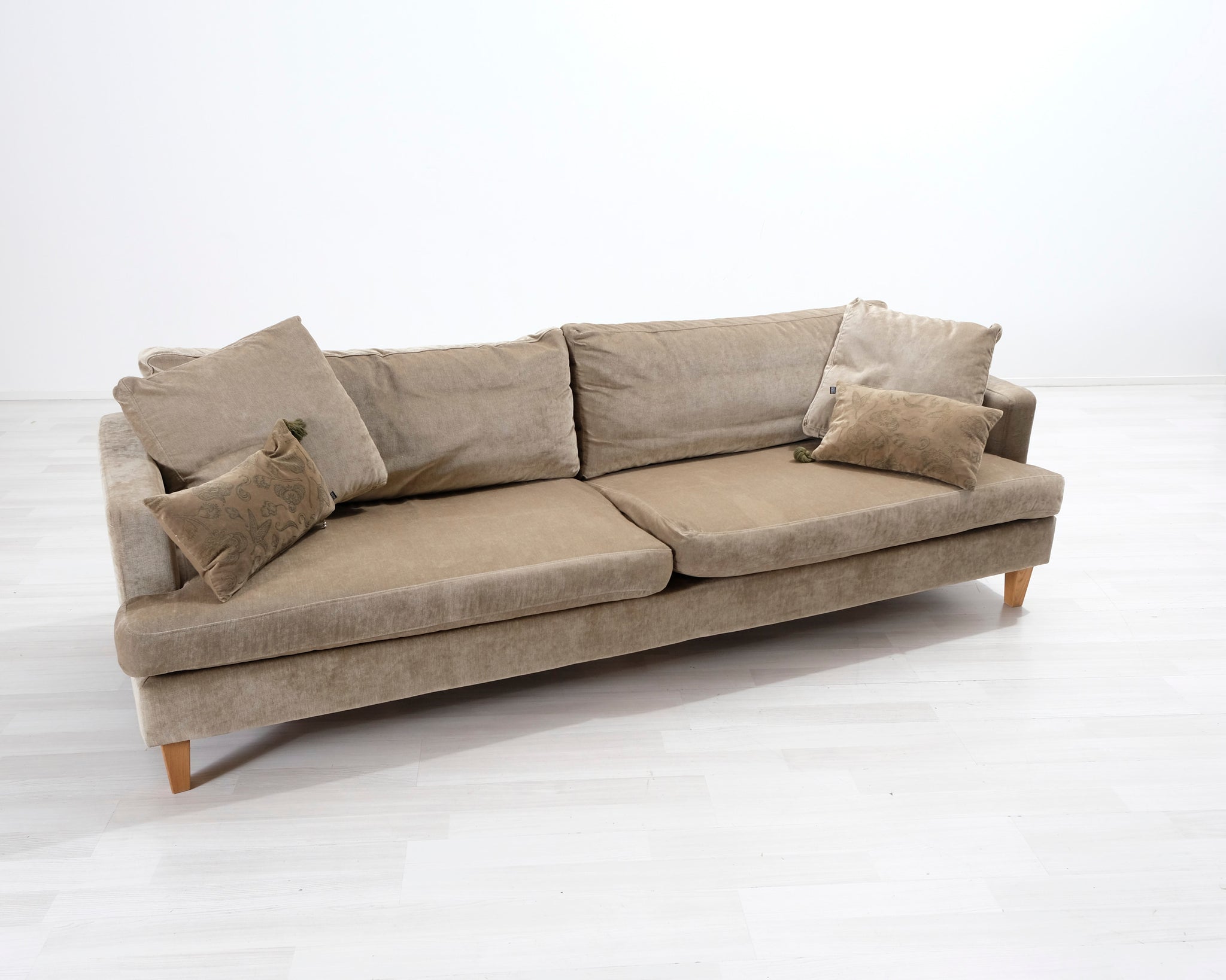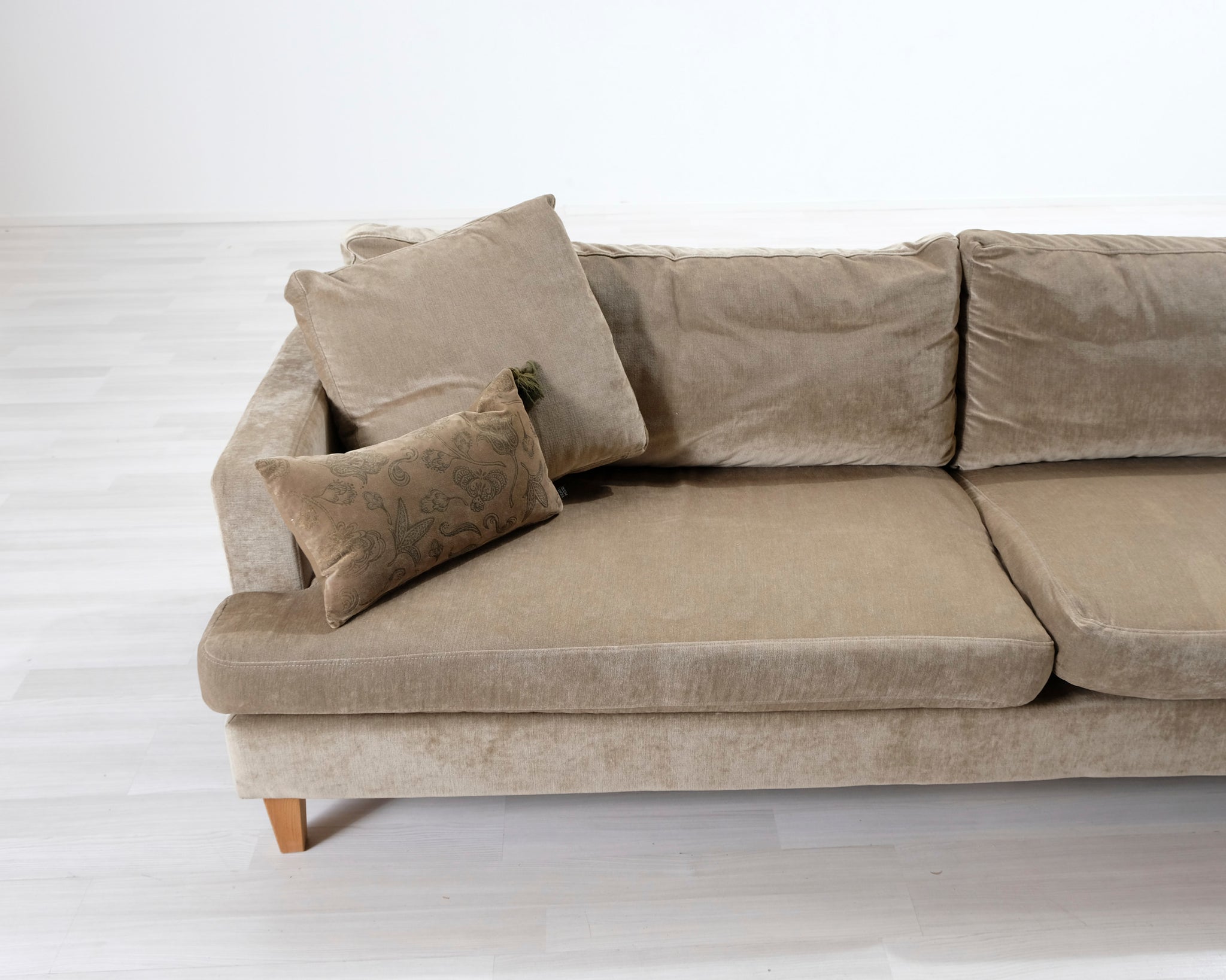 Neljänistuttava samettisohva leveillä istuin- ja selkätyynyillä. Lisämukavuutta sohvaan tuo kaksi pientä ja kaksi isompaa koristetyynyä.