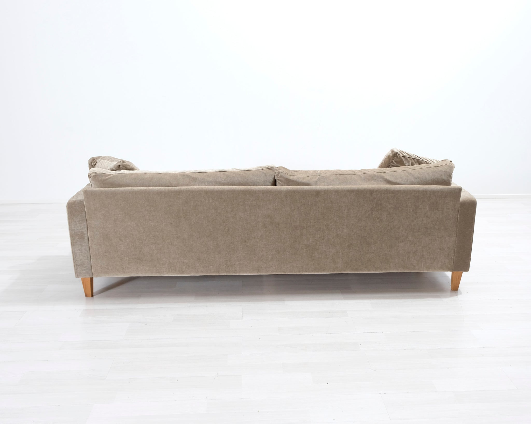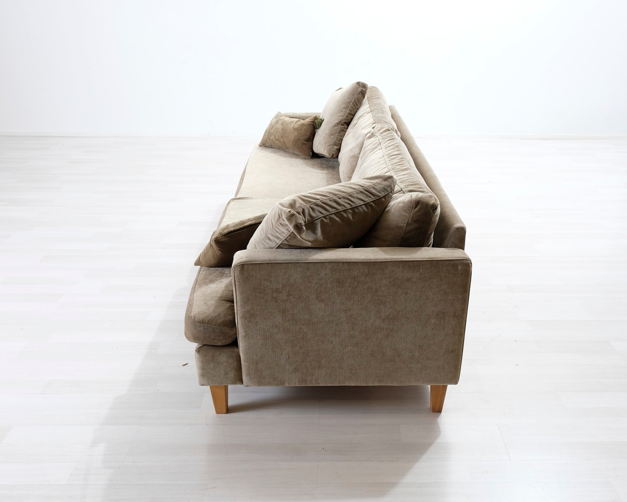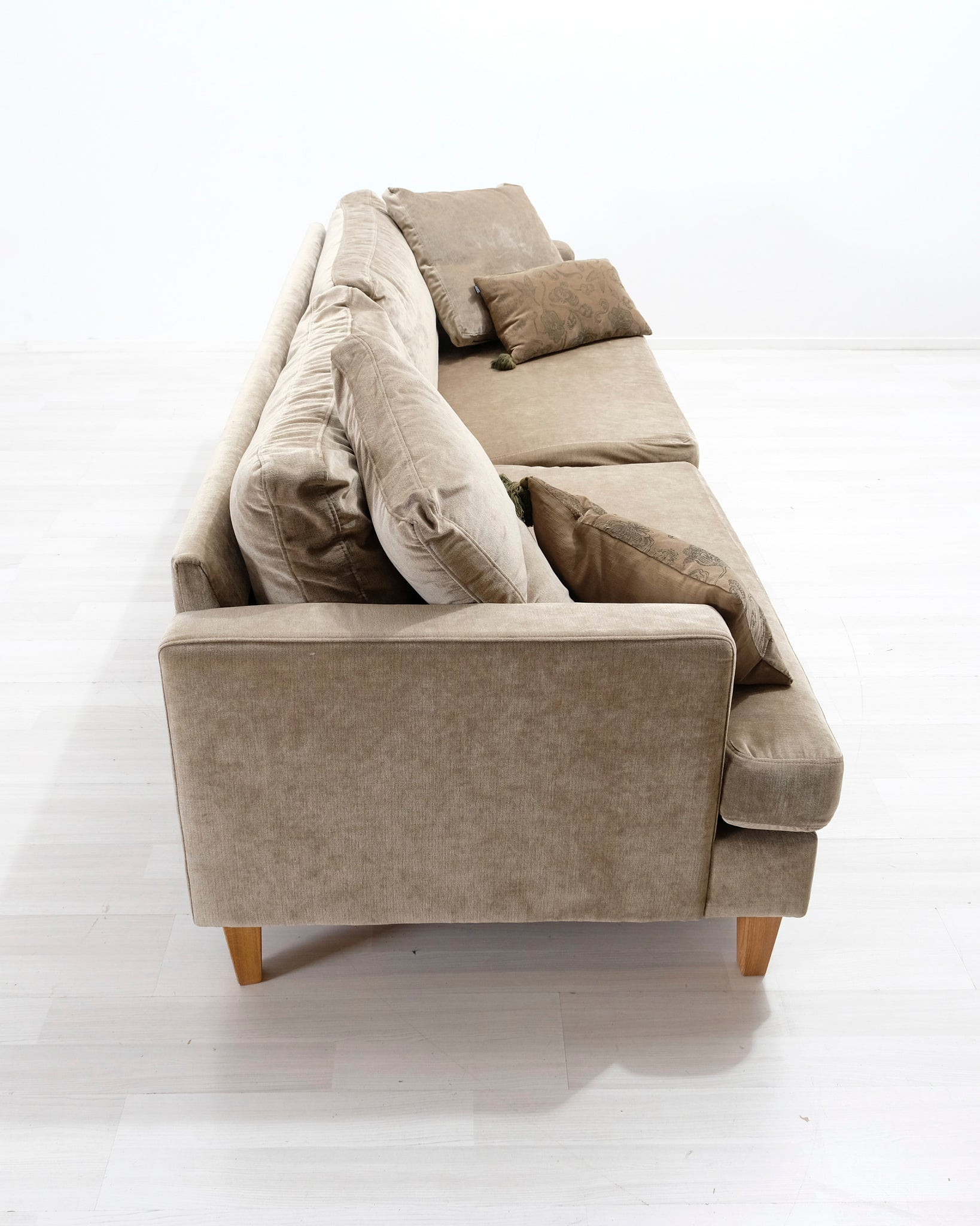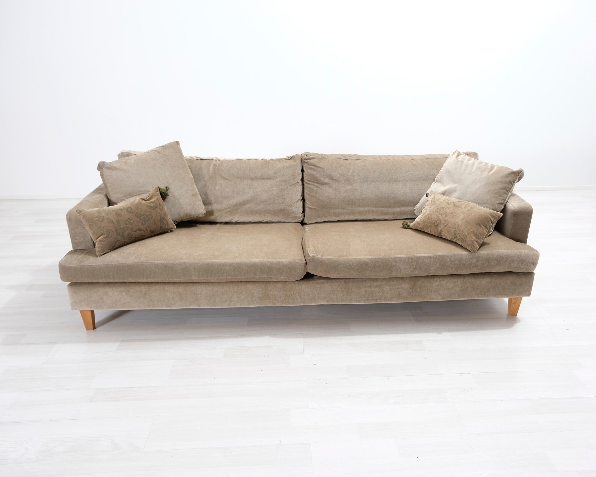 Neljänistuttava samettisohva leveillä istuin- ja selkätyynyillä. Lisämukavuutta sohvaan tuo kaksi pientä ja kaksi isompaa koristetyynyä.