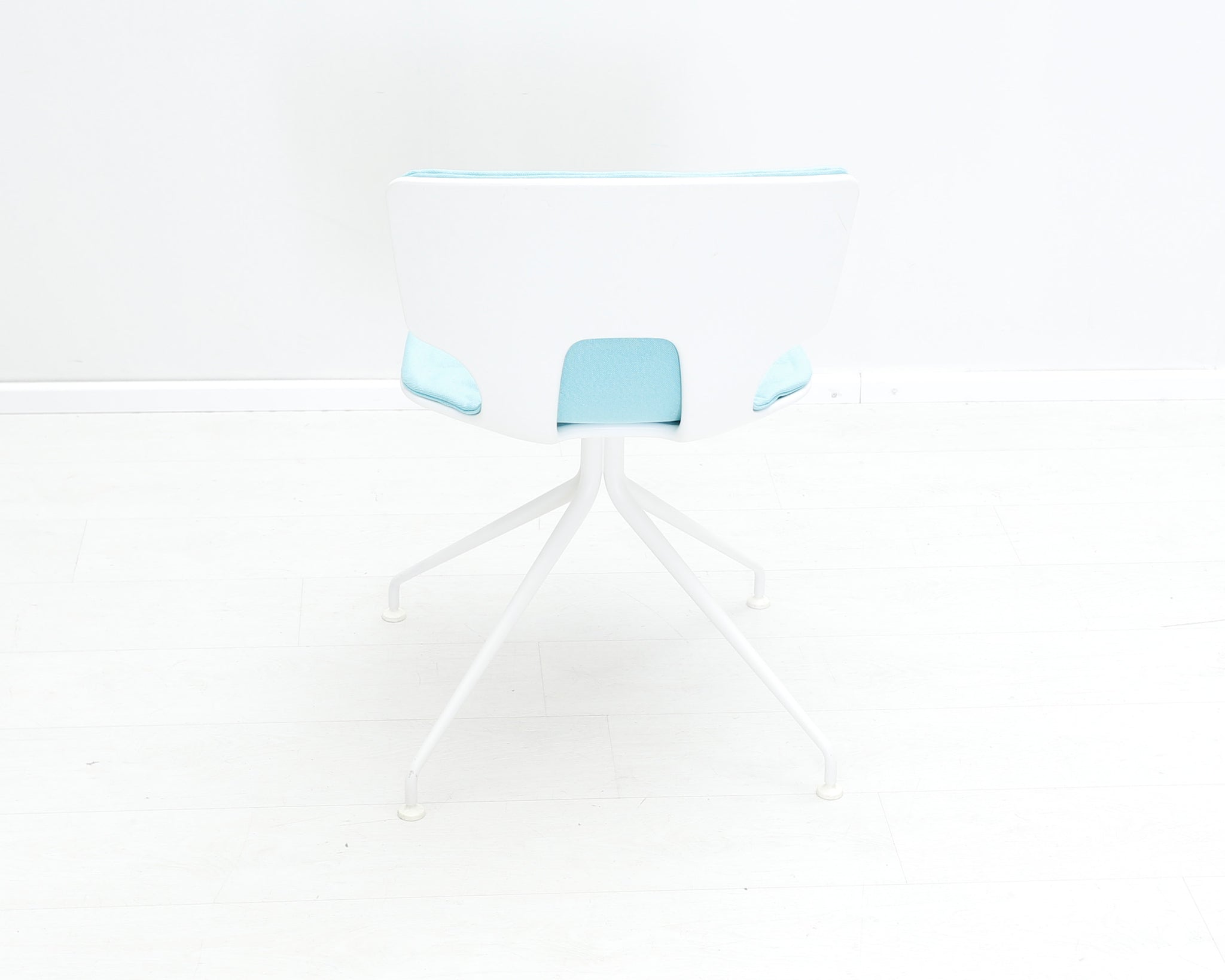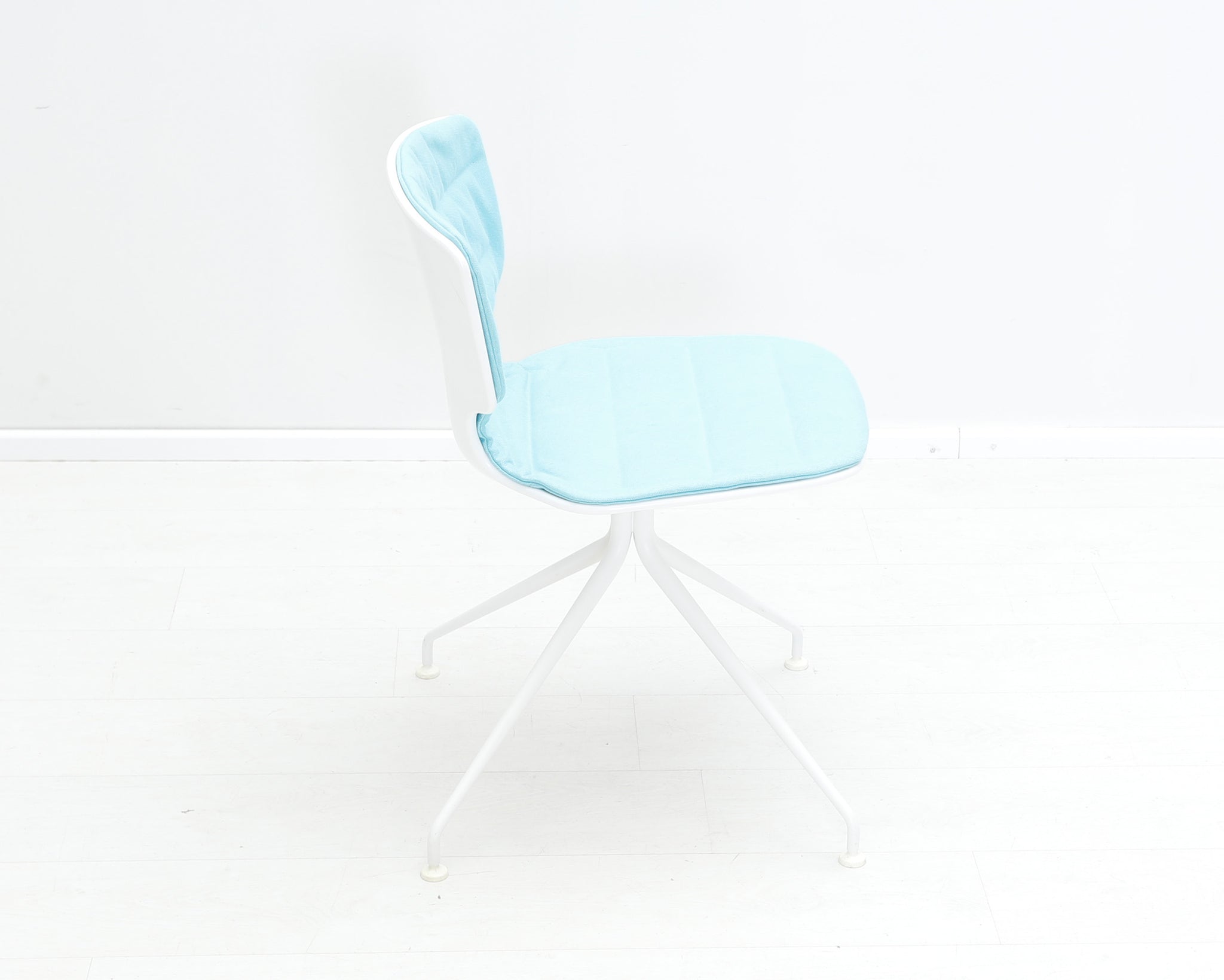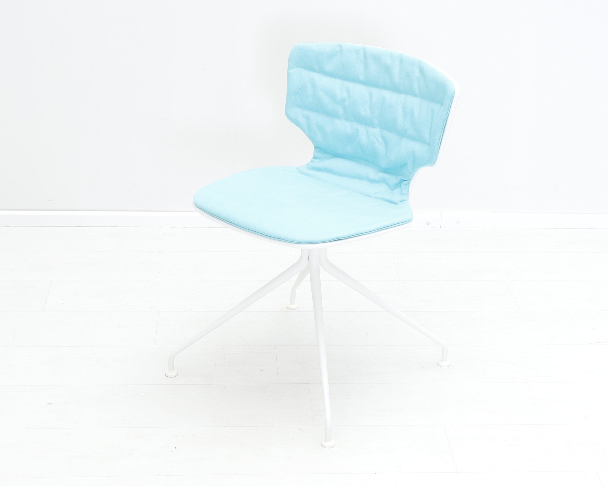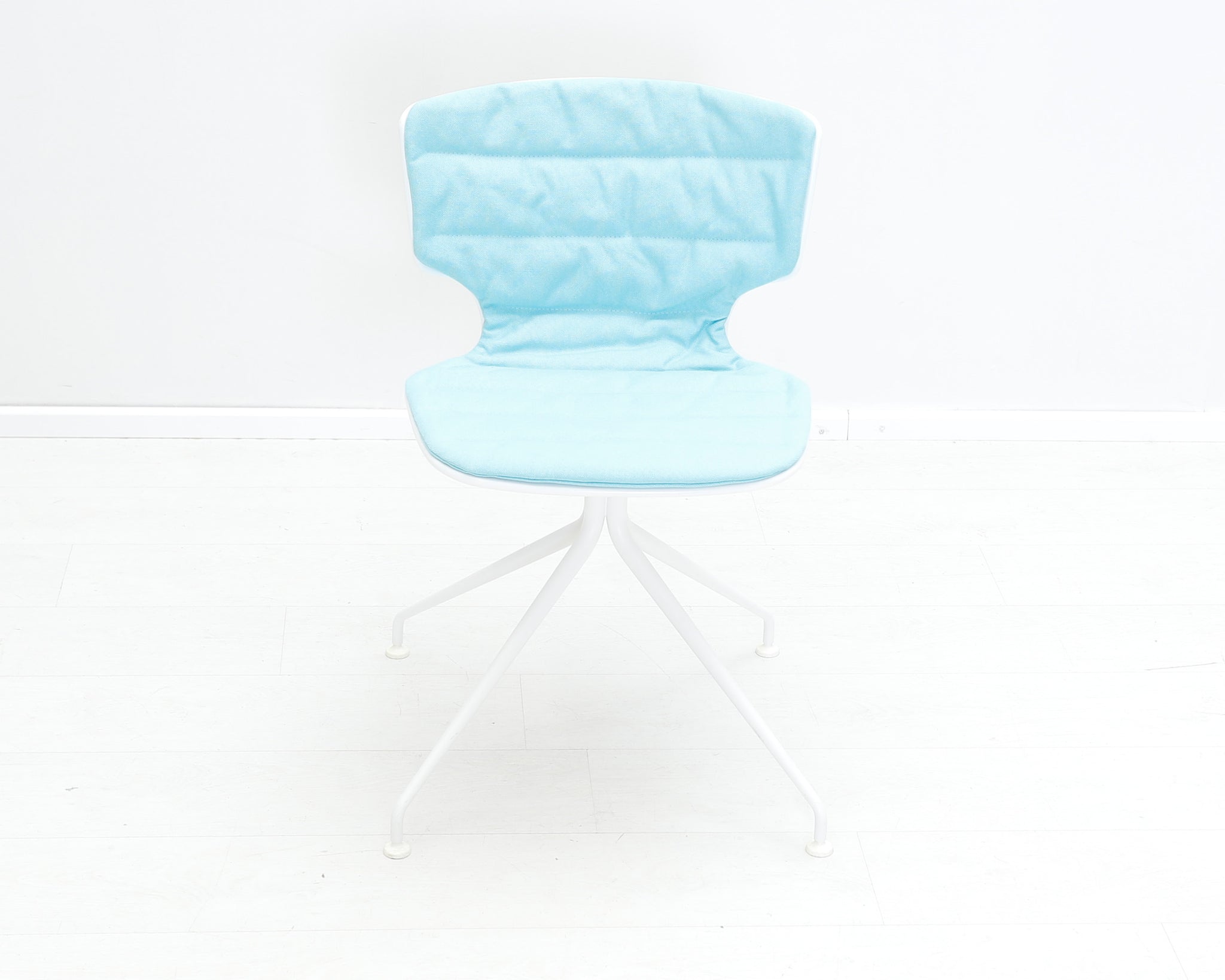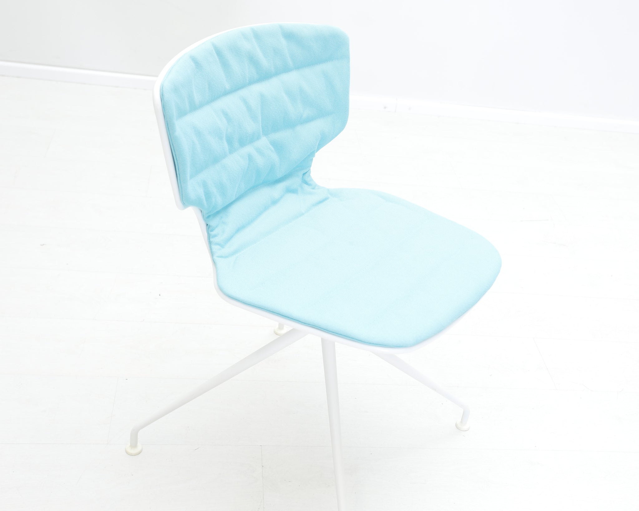 Pirteän sinisellä kankaalla verhoiltu tuoli. Alfredo Härbeli on argentiinalainen suunnittelija, joka on tehnyt pitkän uran Euroopassa.
