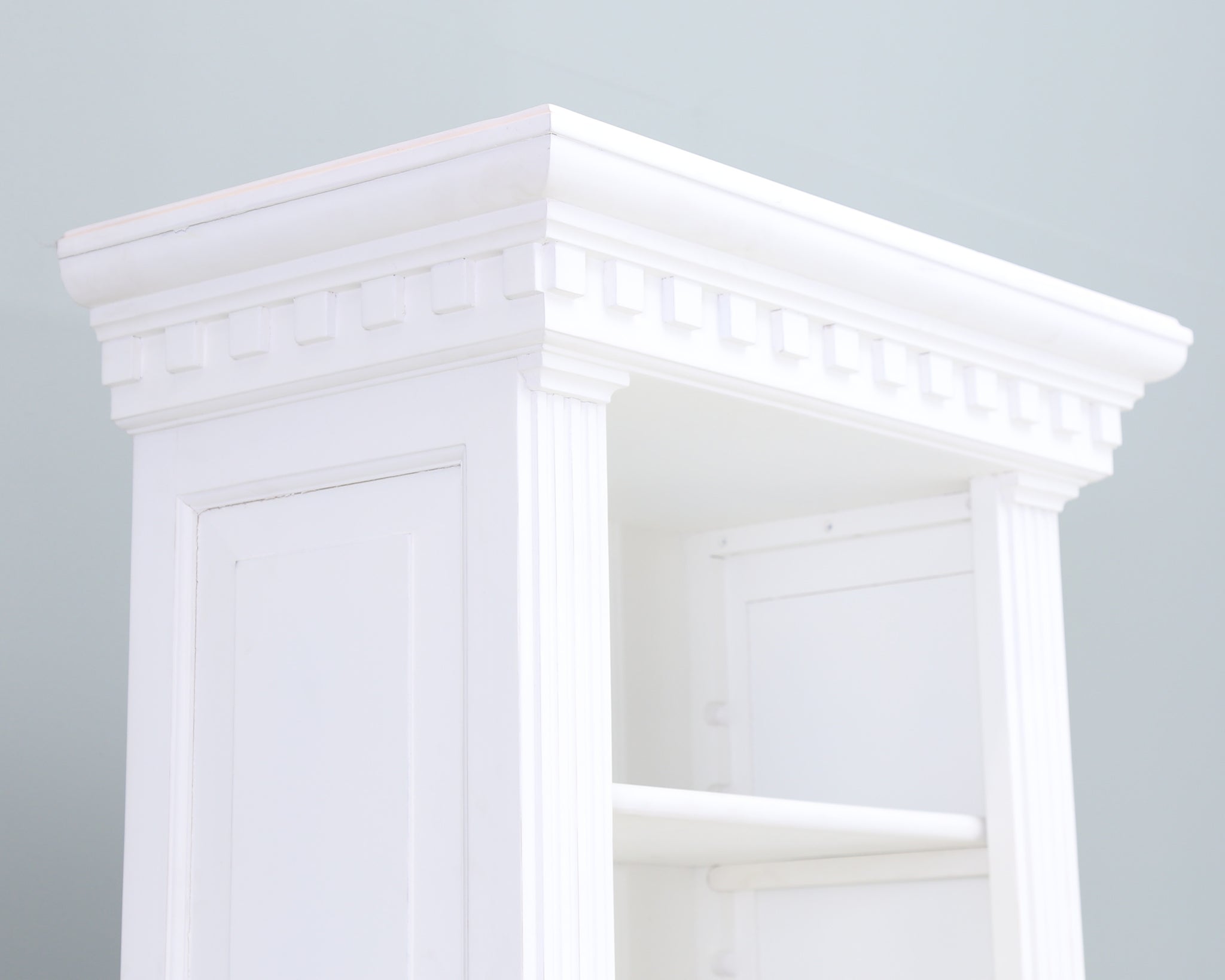 Valkoinen korkea hylly kauniilla yksityiskohdilla.