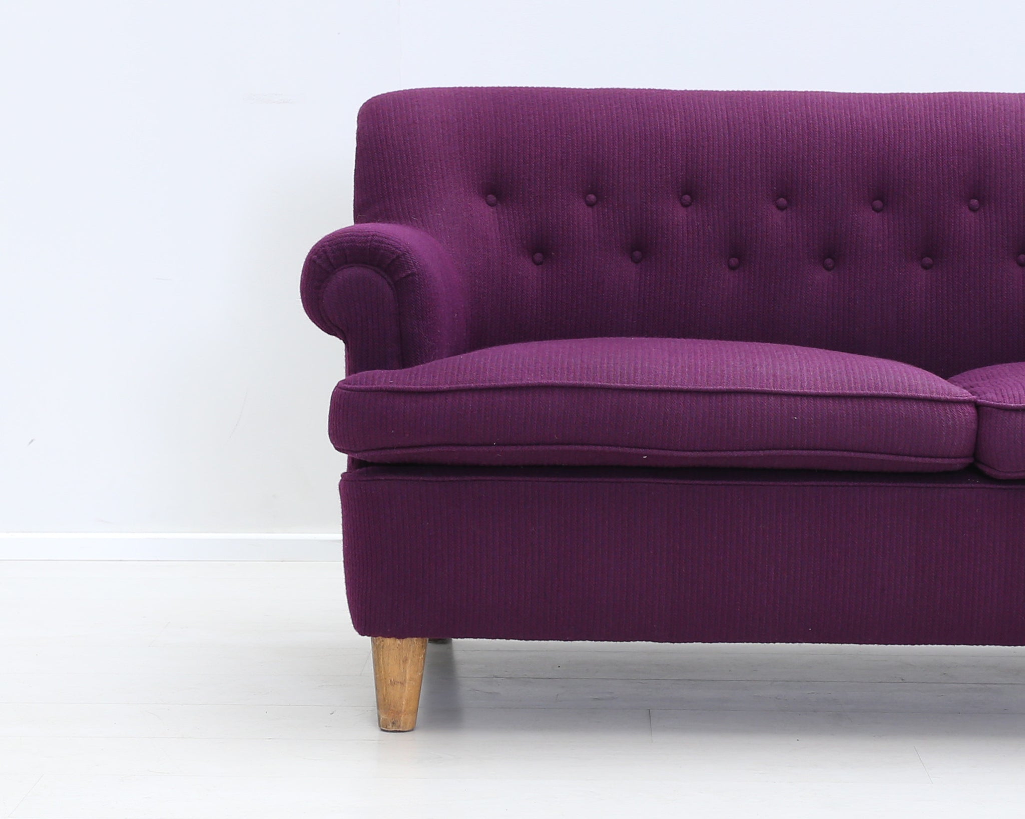 Sohva on ostettu alunperin 1960-luvulla pariskunnan käyttöön, joka työskenteli aikoinaan Arabian posliini- ja keramiikkatehtaalla Helsingissä. Huolellisesti pidetty vintage-sohva istuu hienosti myös nykyaikaiseen kotiin. Kaunis violetti verhoilu.