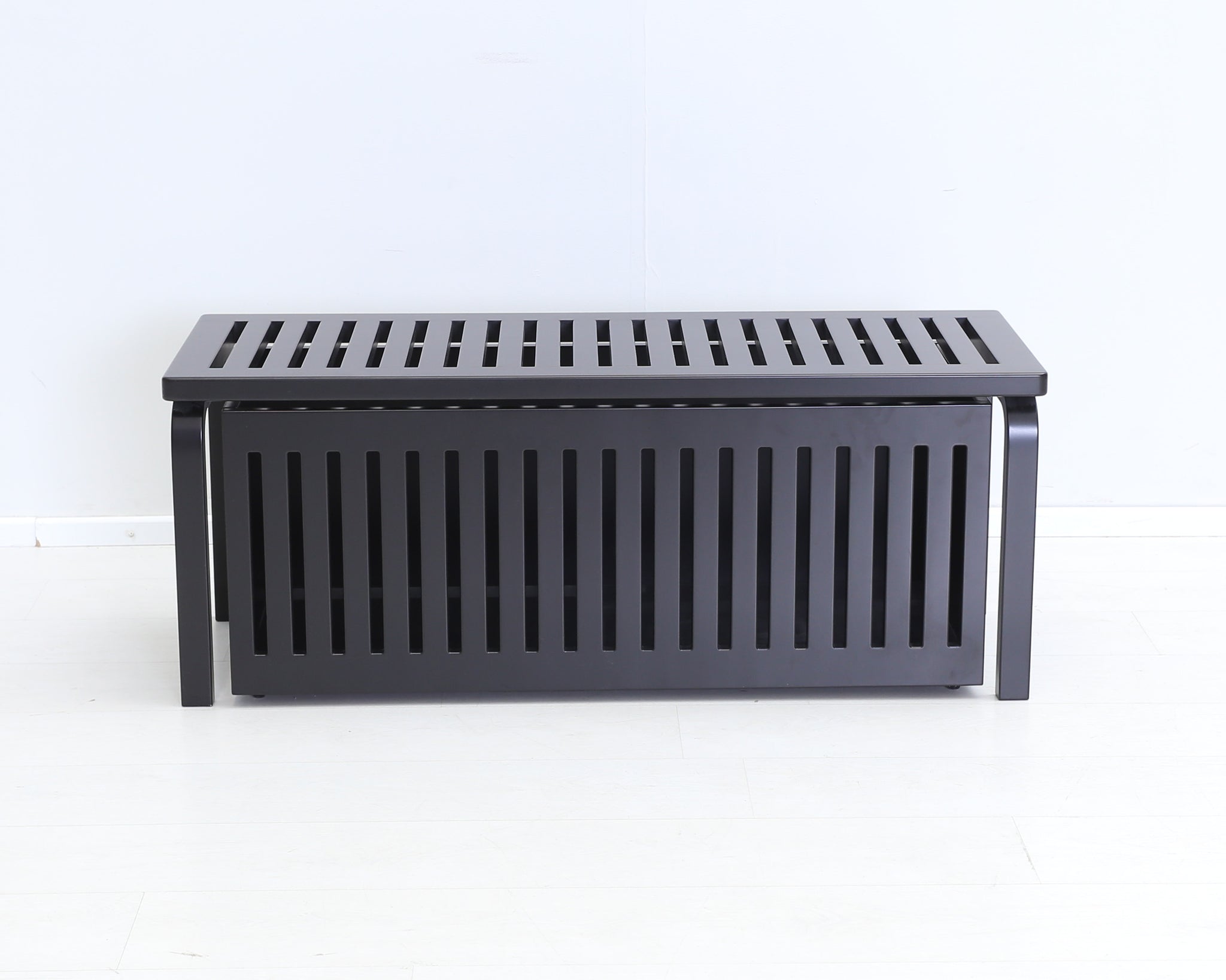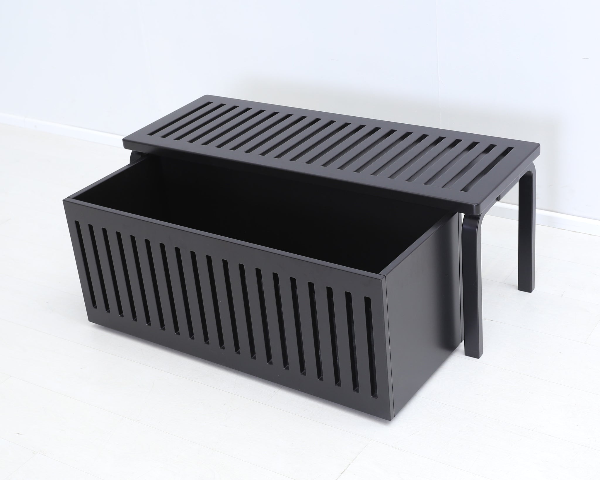 Tähän Artekin klassikkoon on teetetty myös tyyliin sopiva säilytyslaatikko. Laatikko on ruiskumaalattu mustaksi, jolloin ilme on yhtenäinen ja tyylikäs. Ritiläpenkki 153A on Alvar Aallon muotoilema klassikko vuodelta 1945. Ritiläpenkin pelkistetty muotokieli on vielä vuosikymmenten jälkeenkin raikas ja moderni.