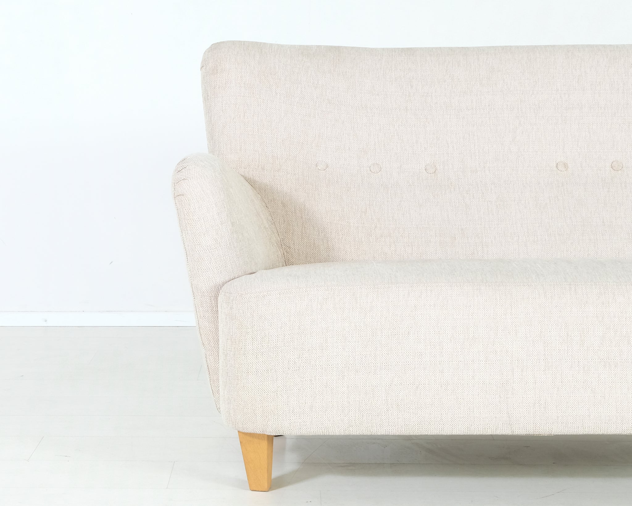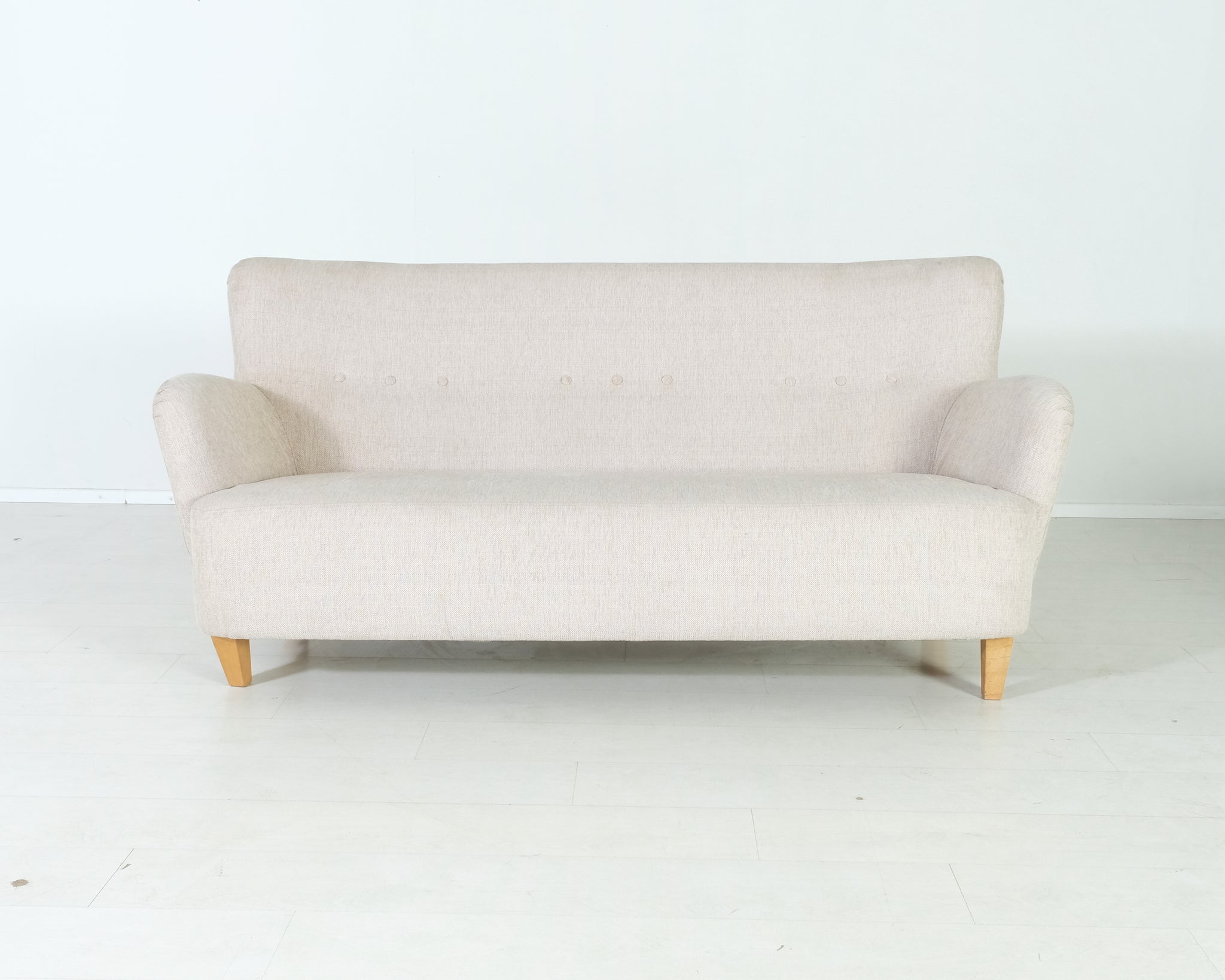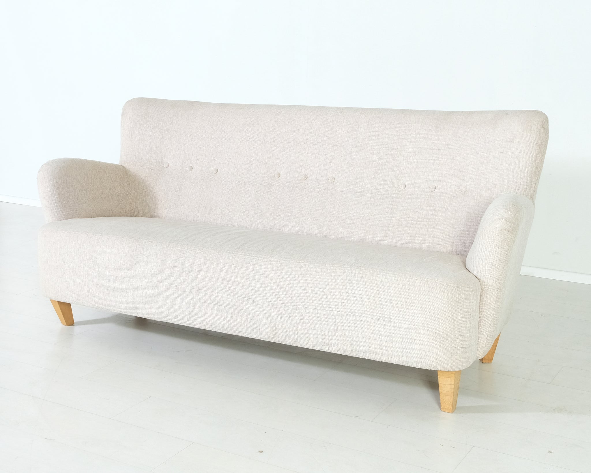 Ryhdikäs ja siro sohva, jossa tammiset jalat. Vaalea väri on helposti yhdisteltävissä kotiin kuin kotiin.