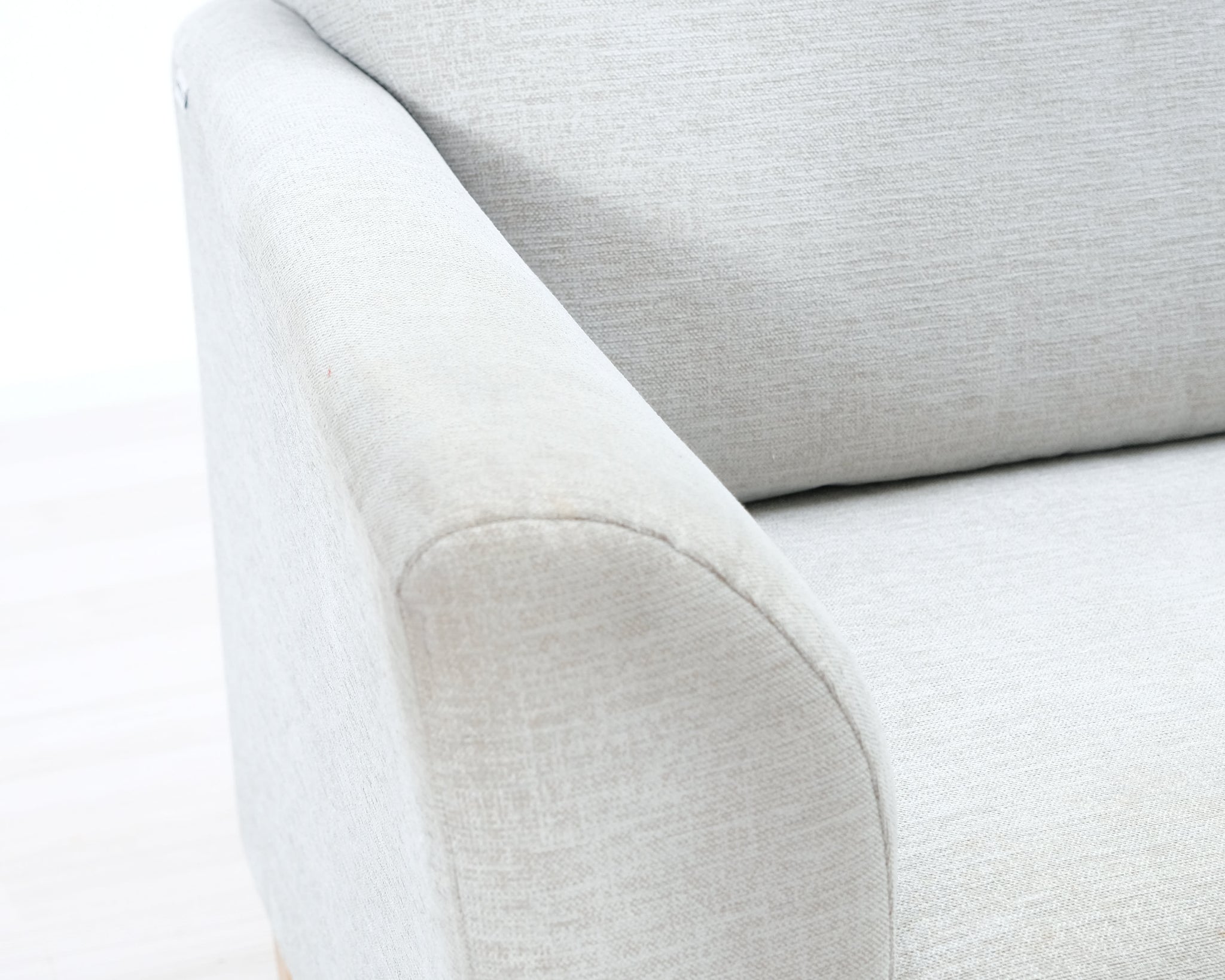 Kahden istuttava sohva. Vaaleanharmaa kangasverhoilu.