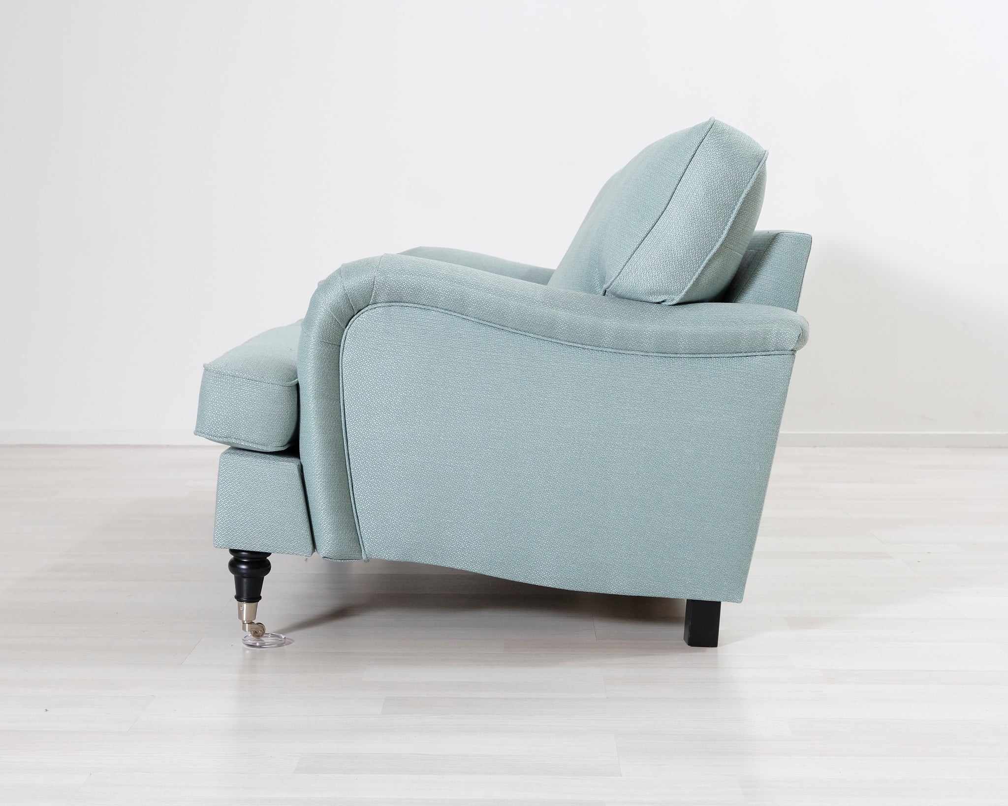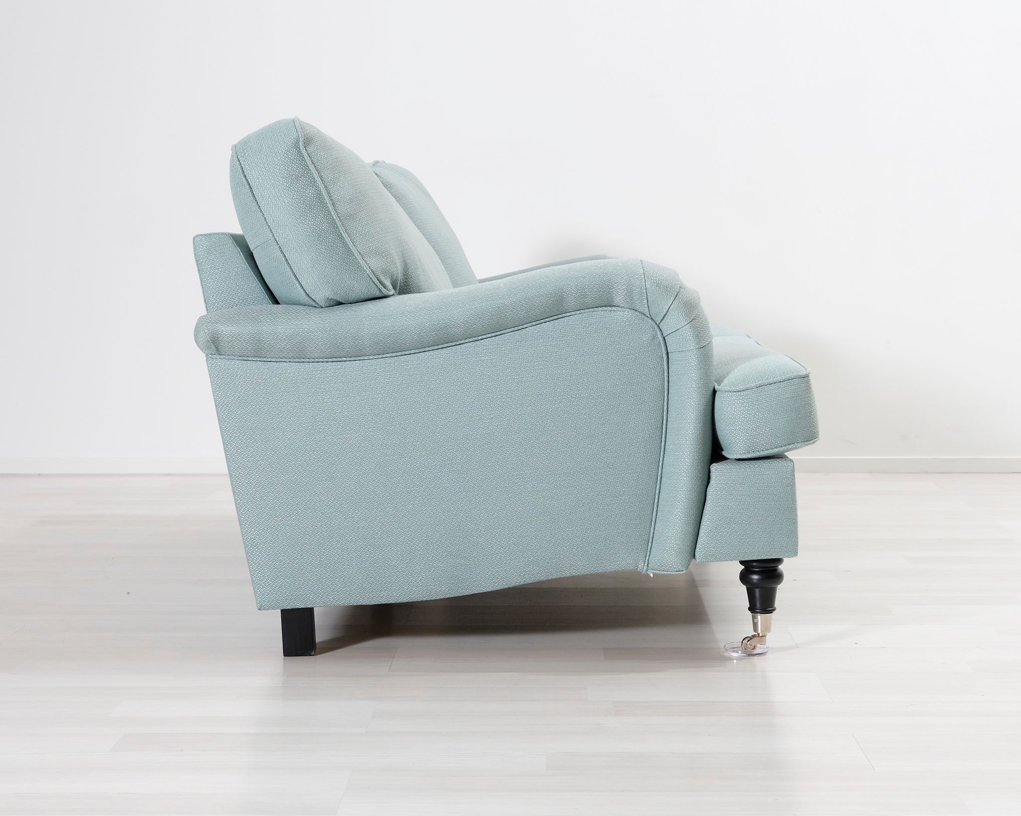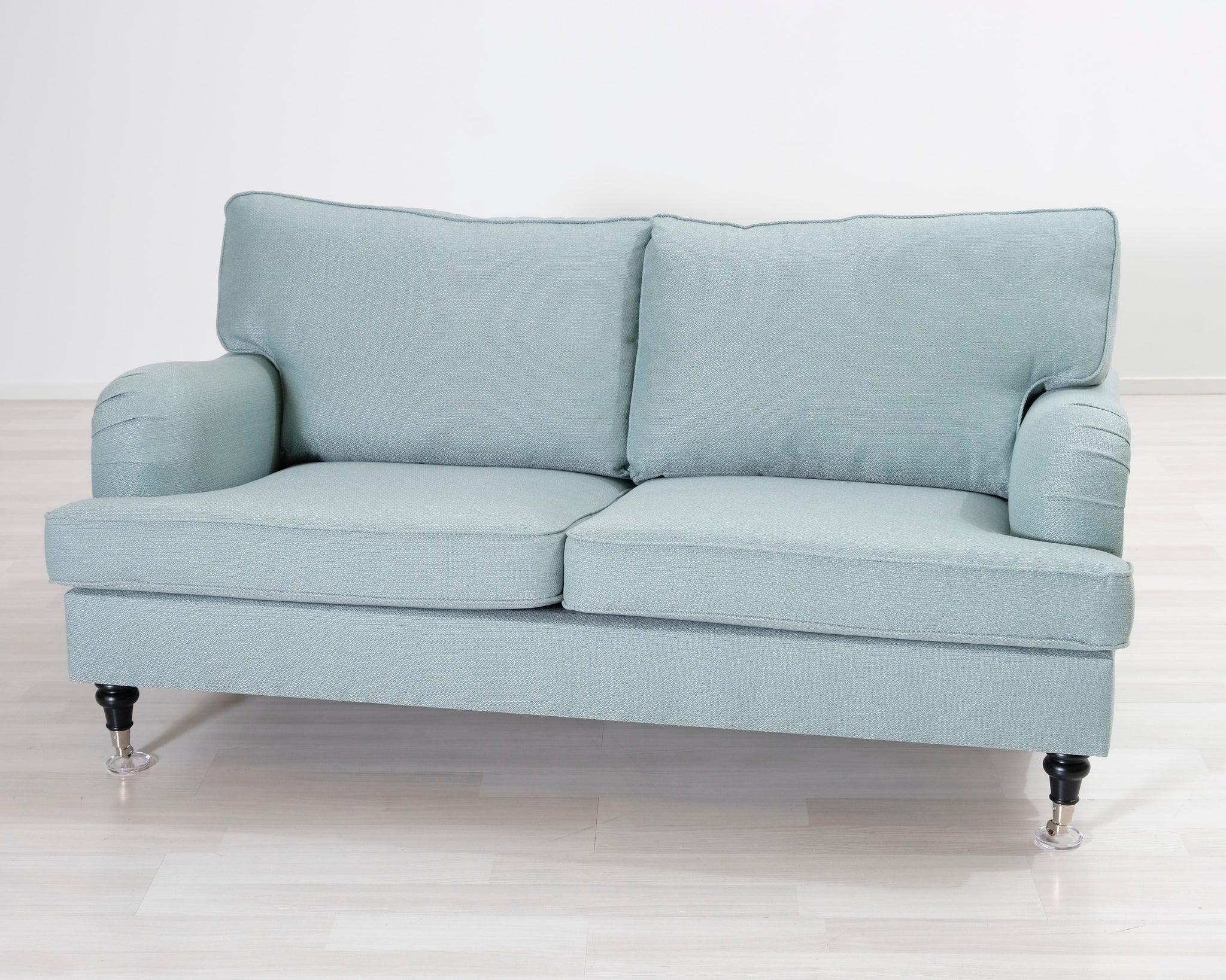 Kahden istuttava Howard-tyylinen kangassohva. Turkoosi verhoilu.