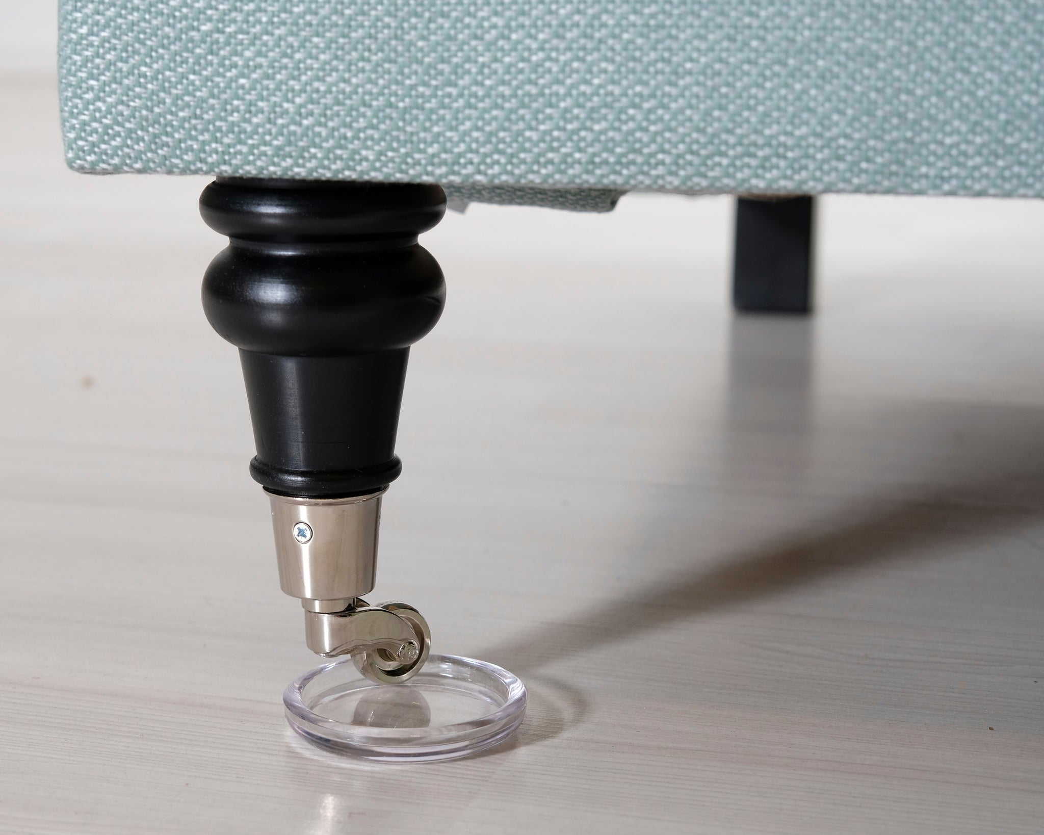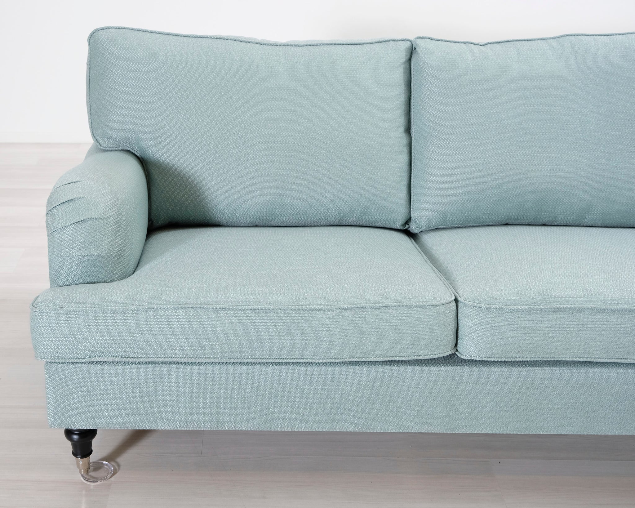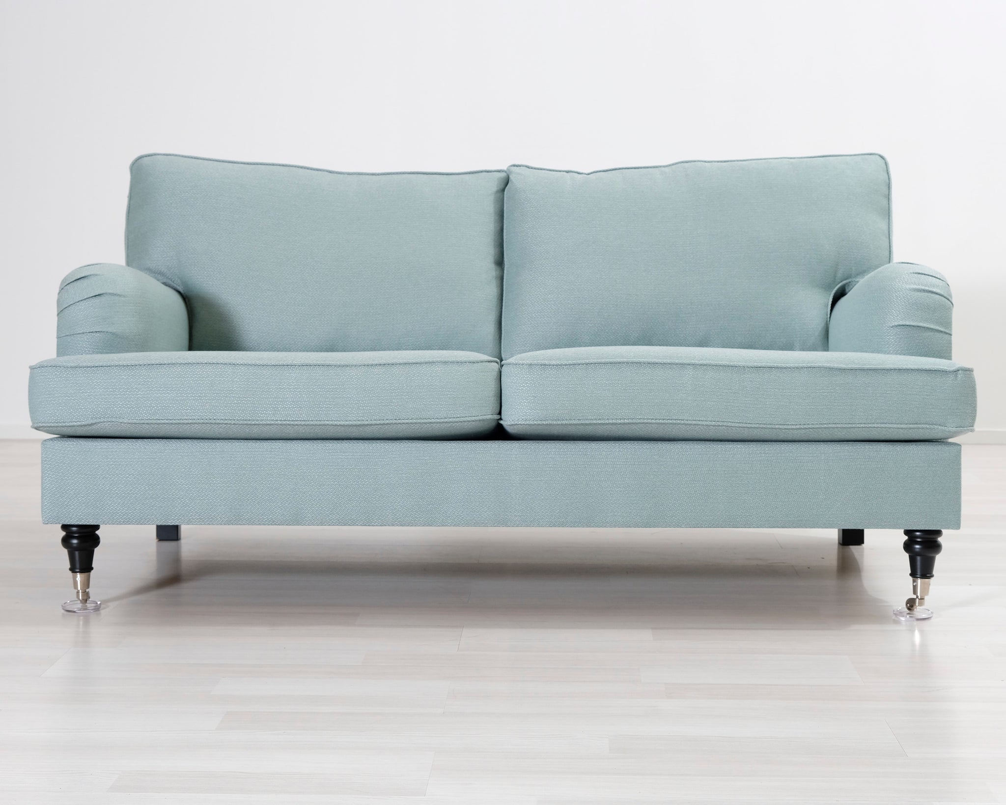 Kahden istuttava Howard-tyylinen kangassohva. Turkoosi verhoilu.