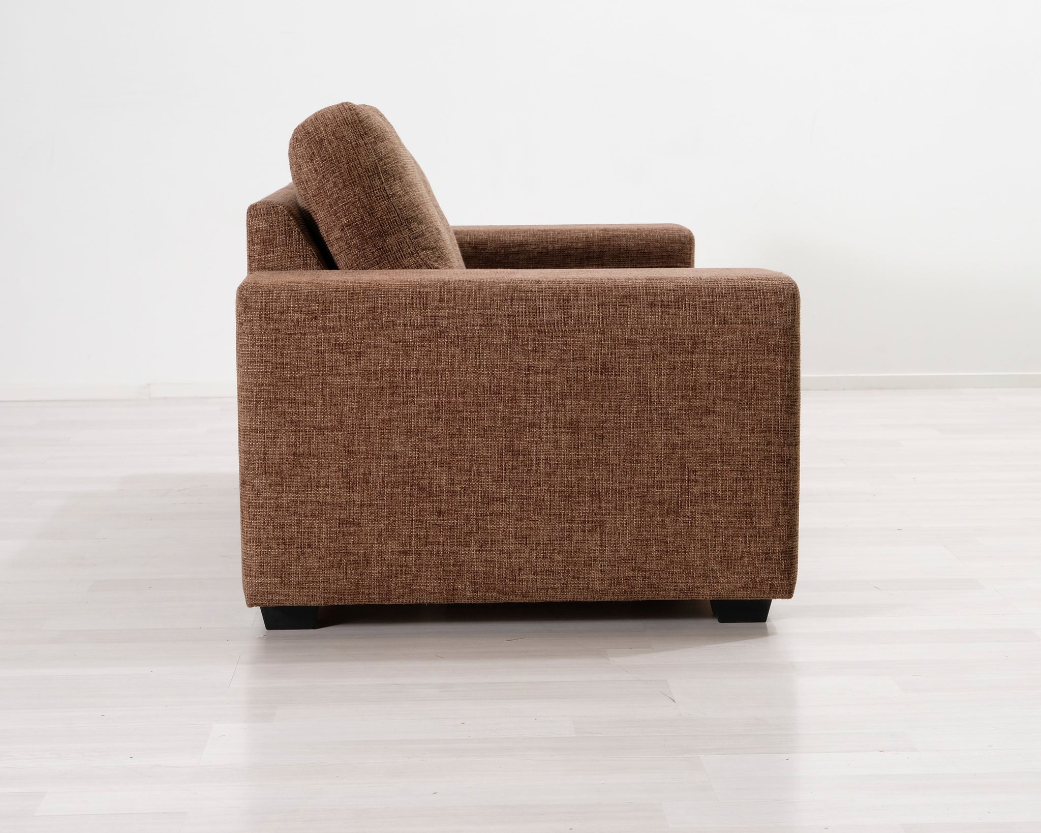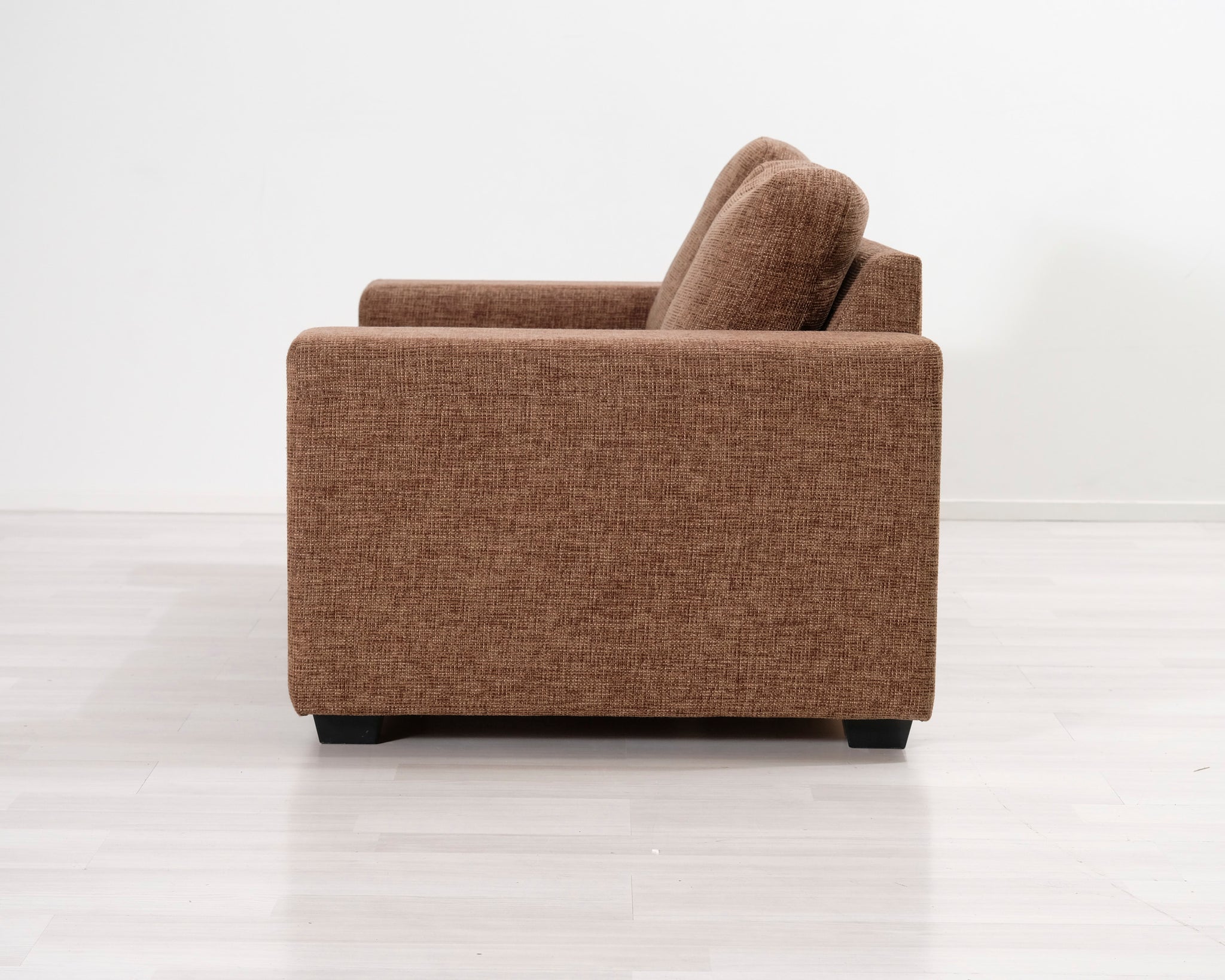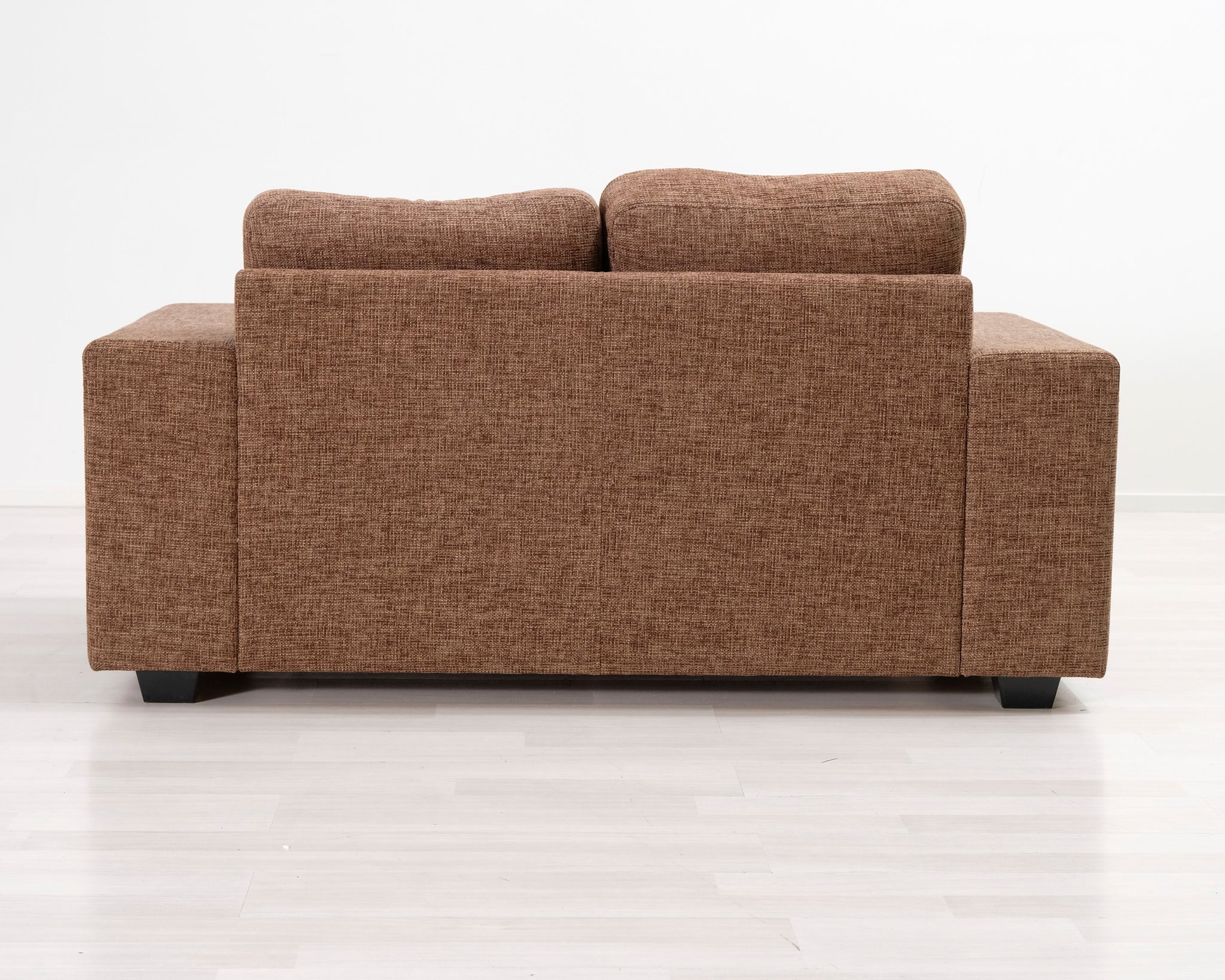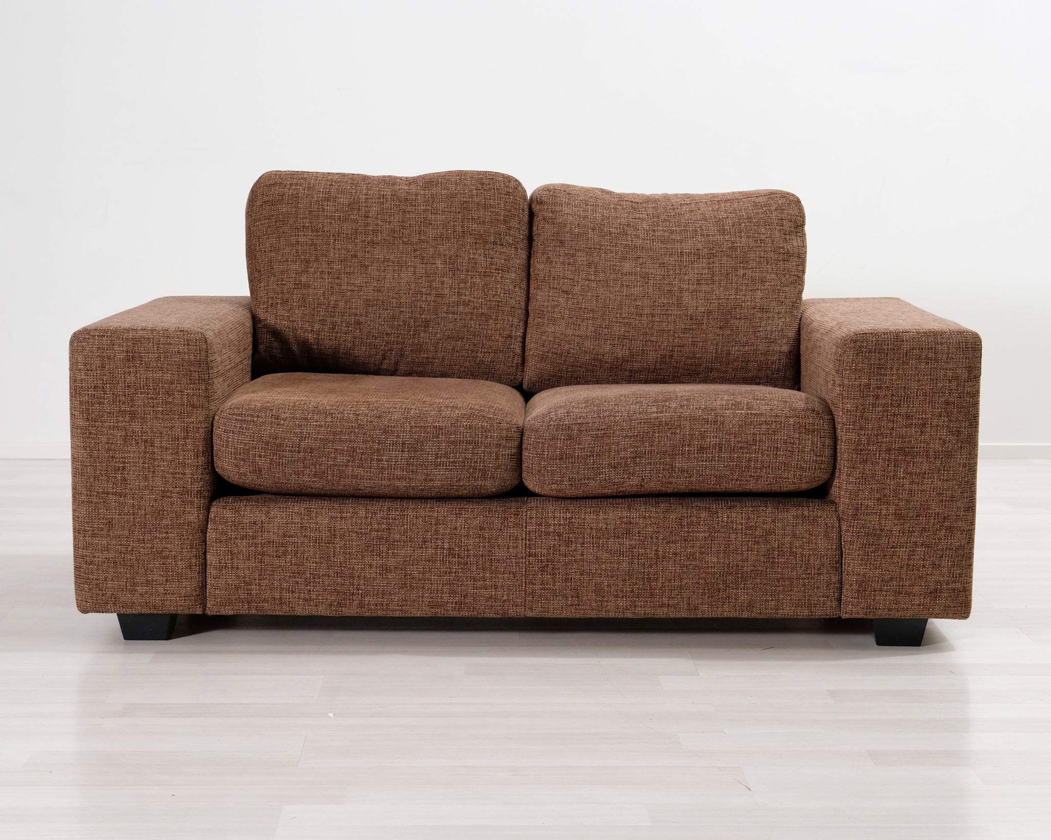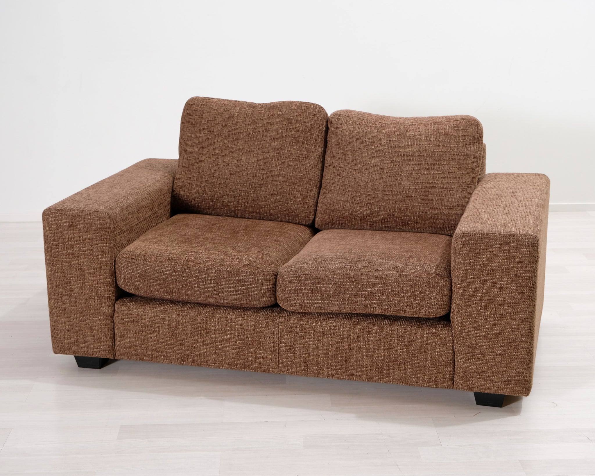 Kompakti kahden istuttava sohva. Ruskea verhoilu.