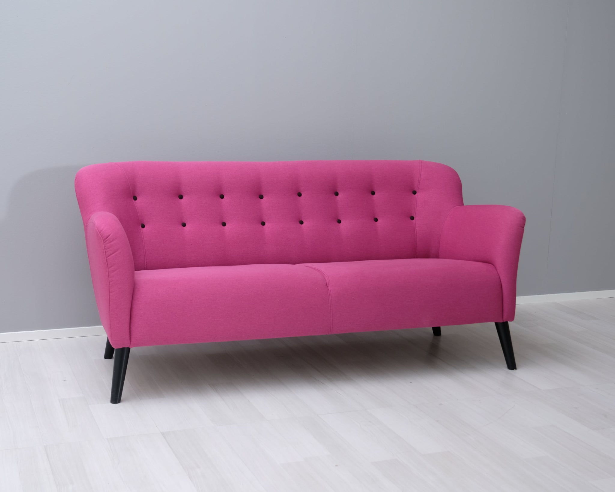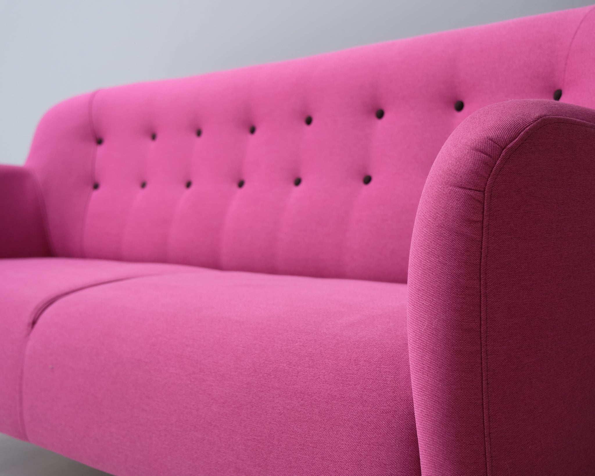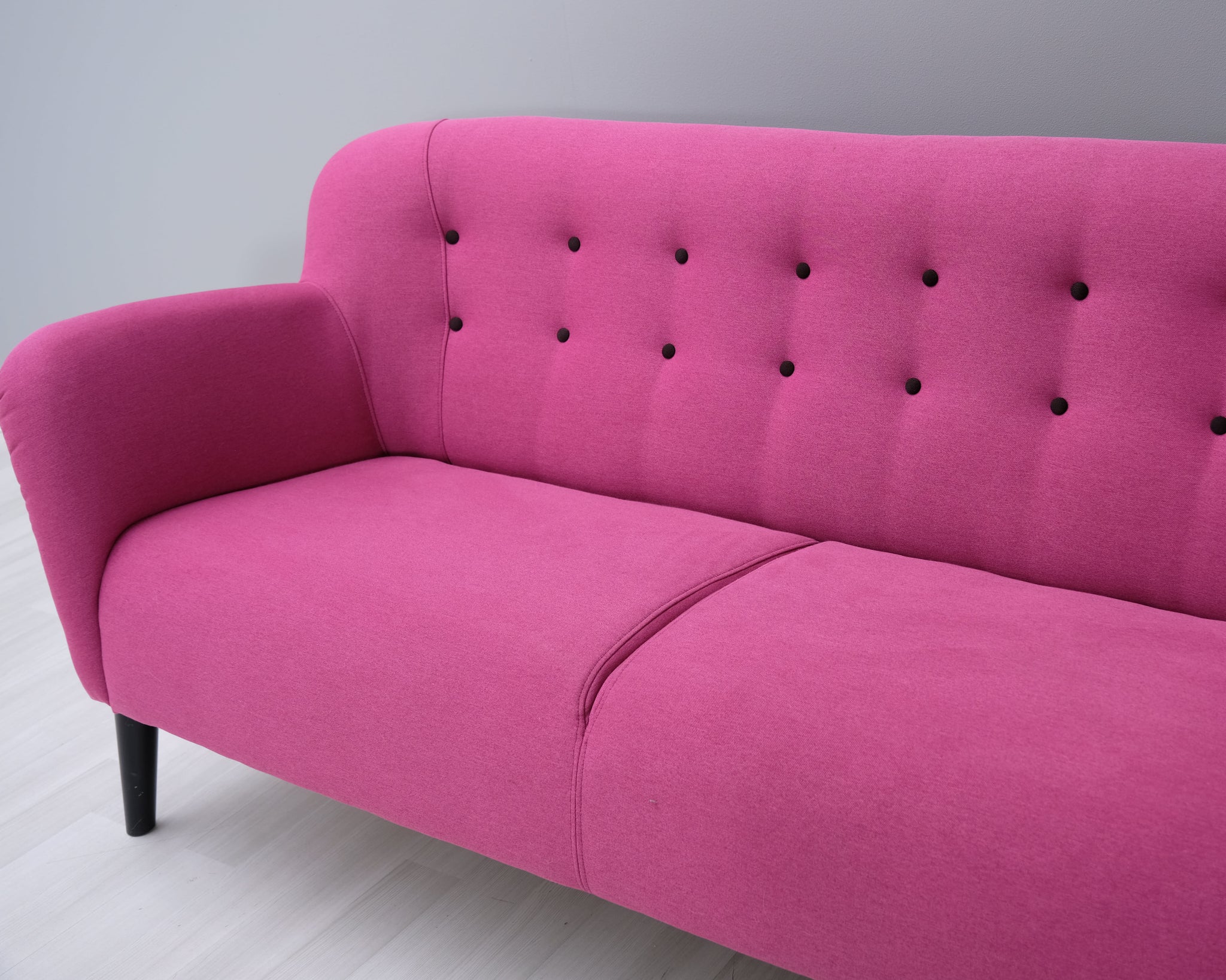 Tämä sohva on todellinen katseenvangitsija! Kahden istuttavassa sohvassa yhdistyy 60-luvun muoto ja räväkkä pinkki verhoilu.