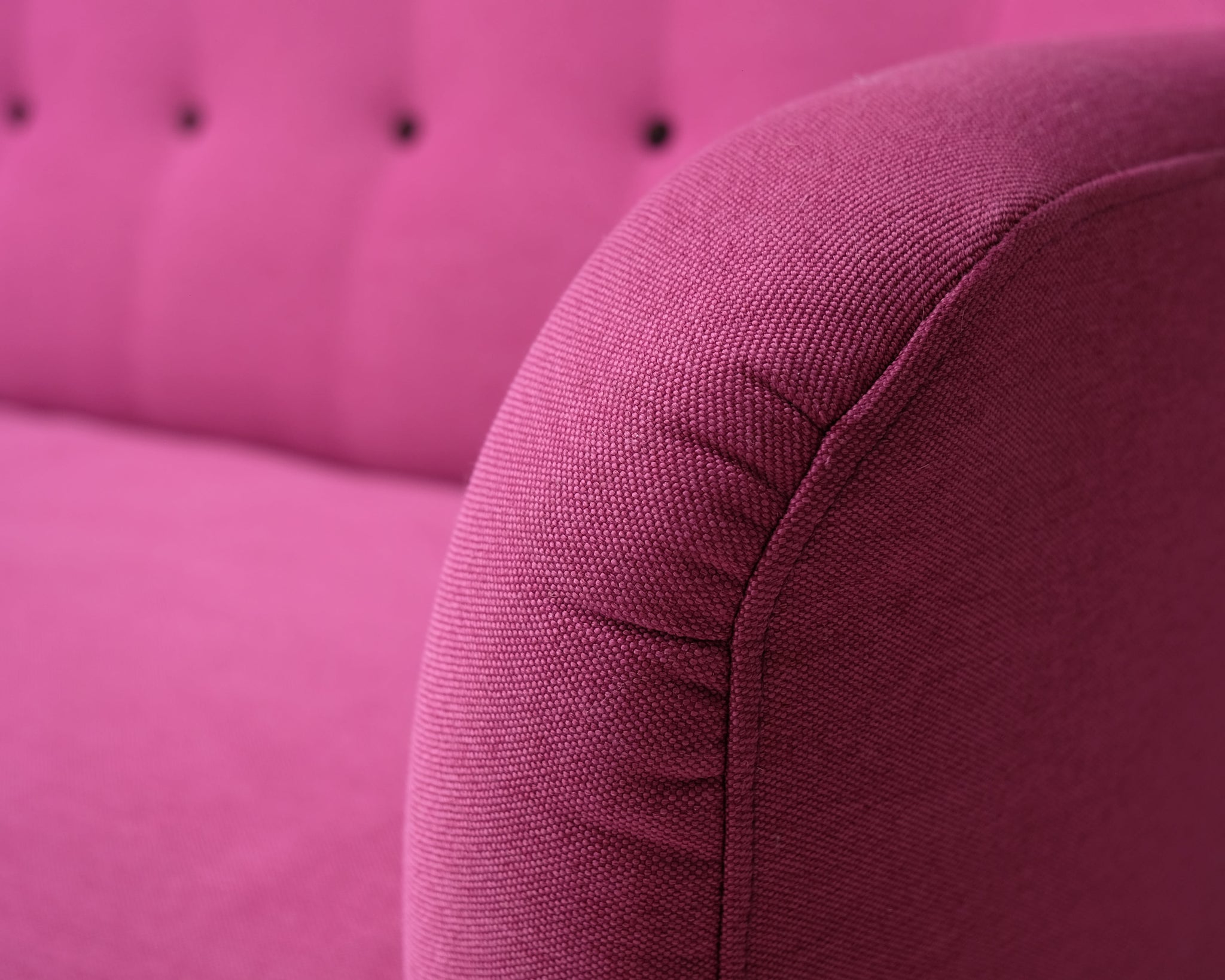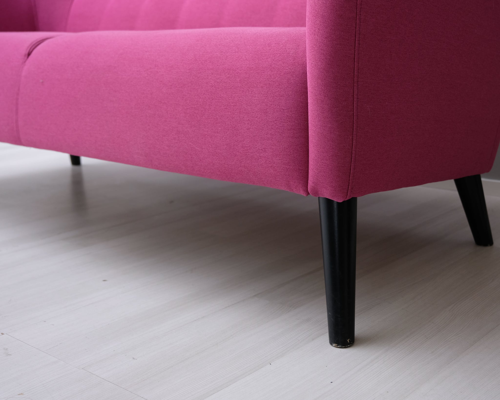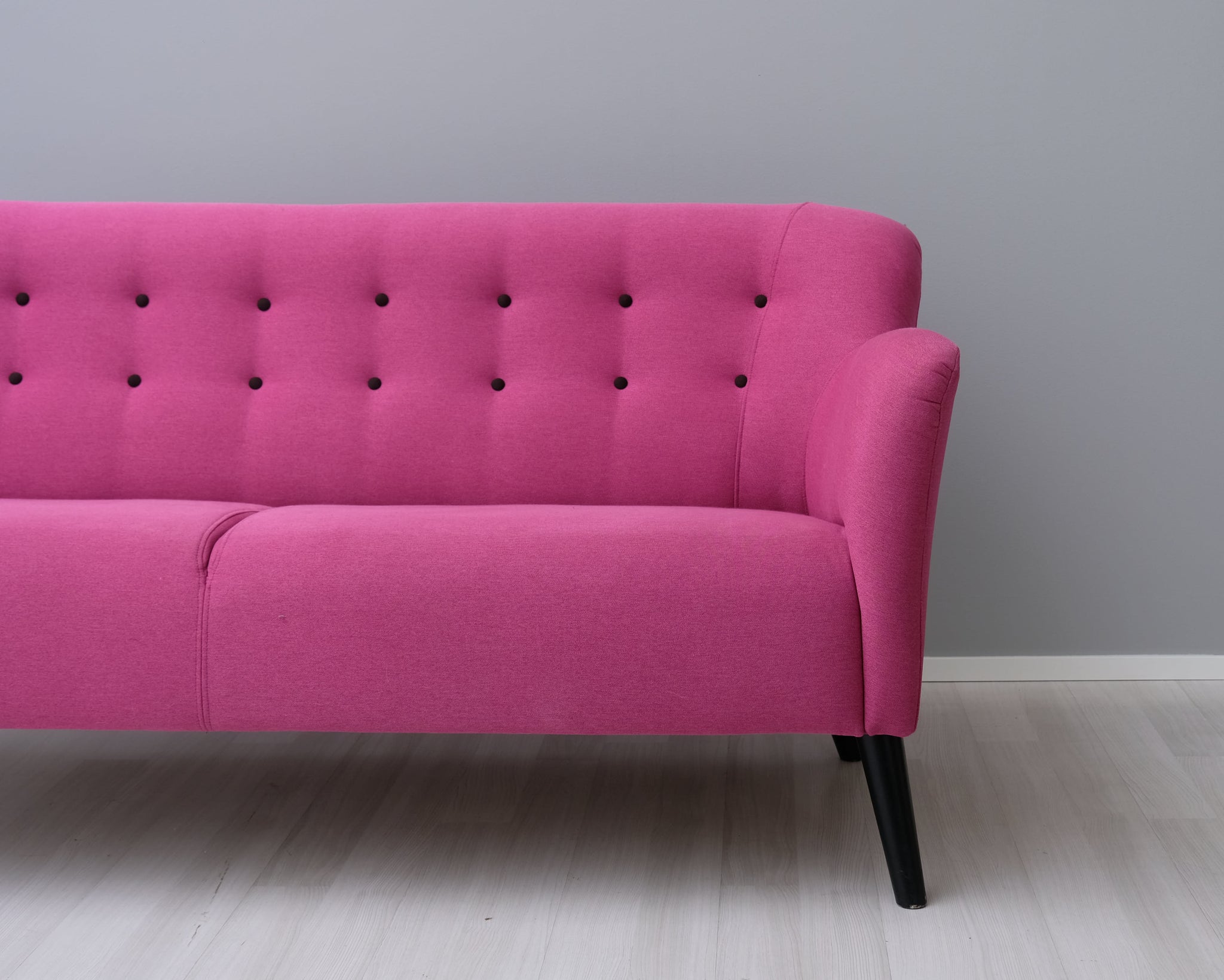 Tämä sohva on todellinen katseenvangitsija! Kahden istuttavassa sohvassa yhdistyy 60-luvun muoto ja räväkkä pinkki verhoilu.