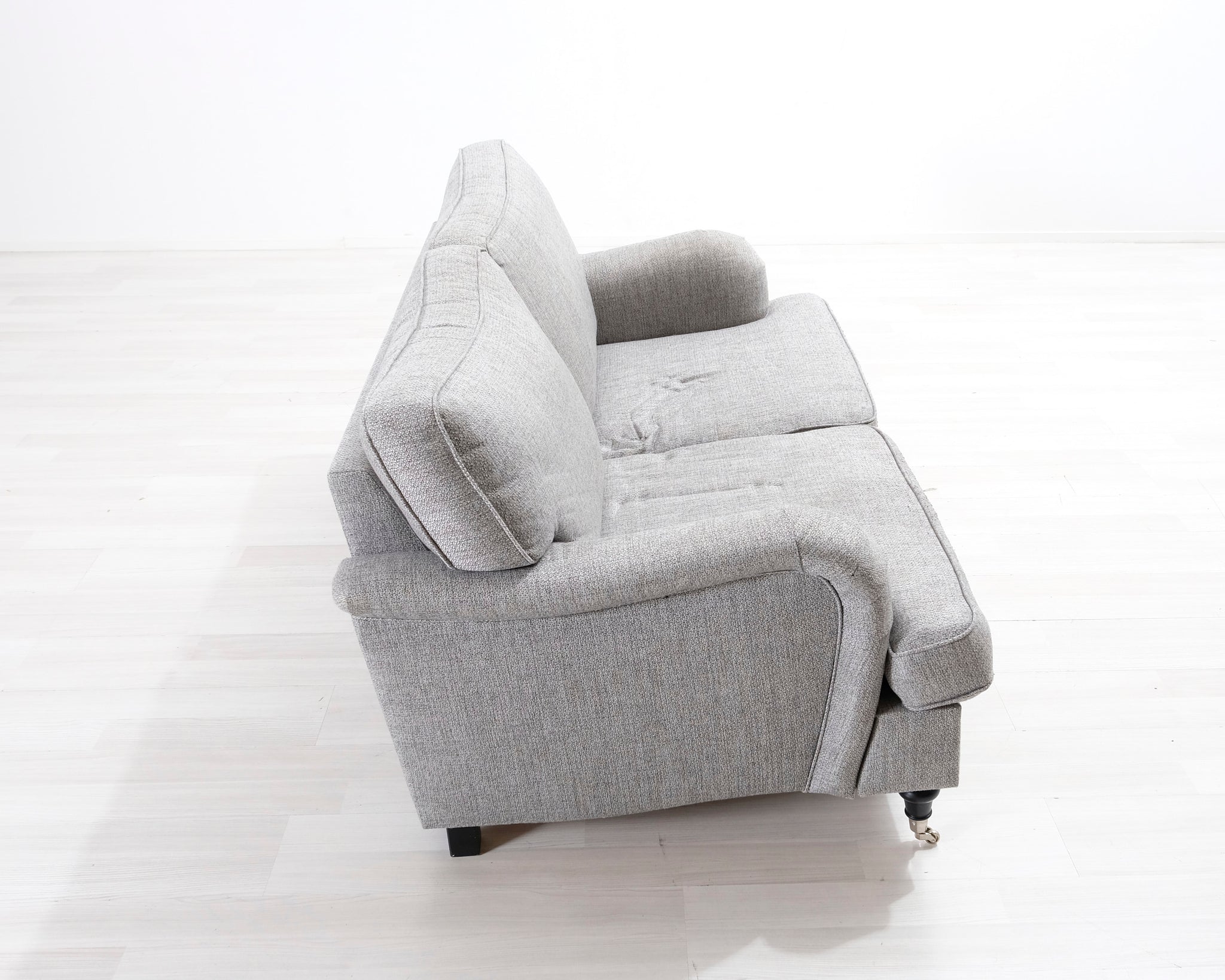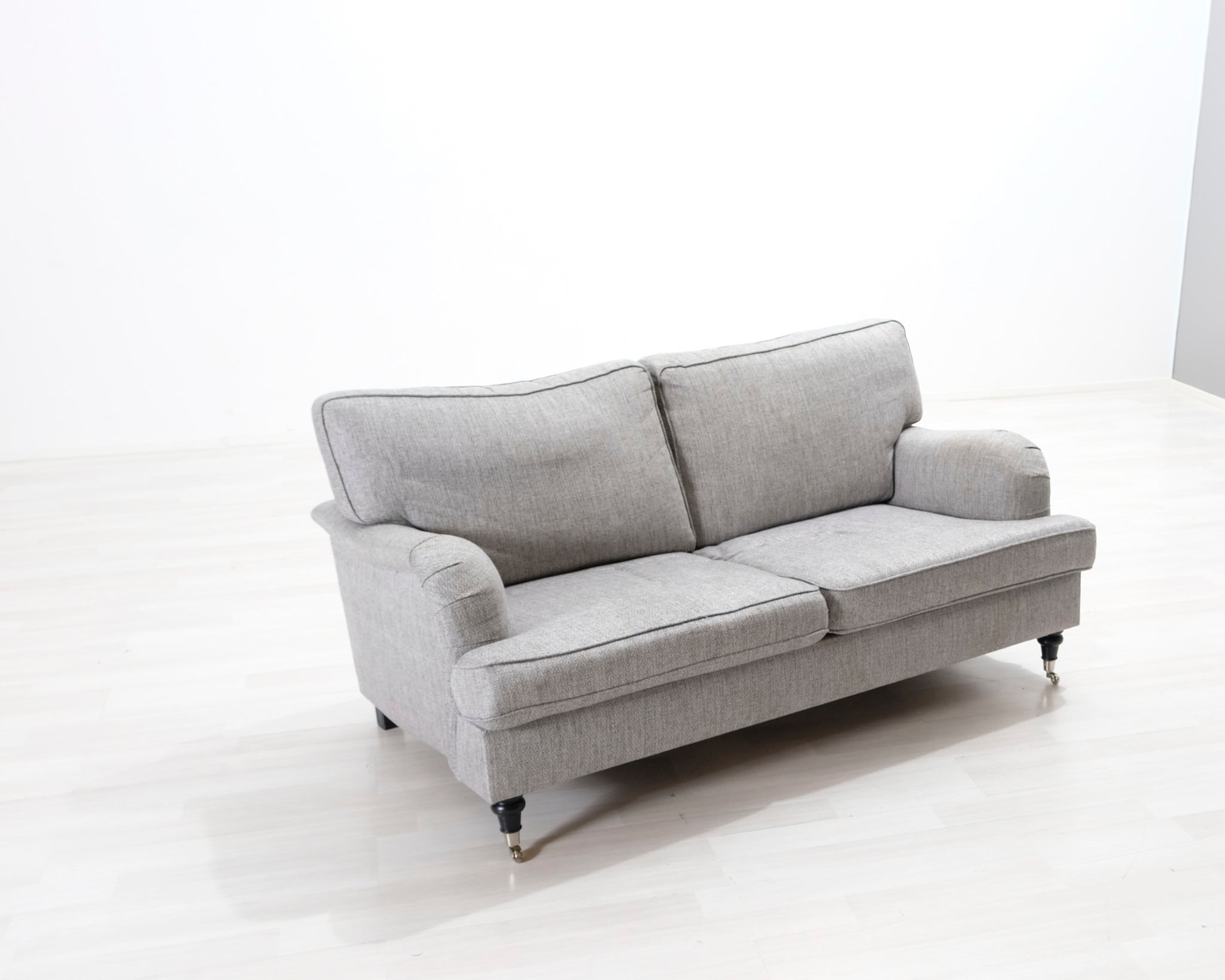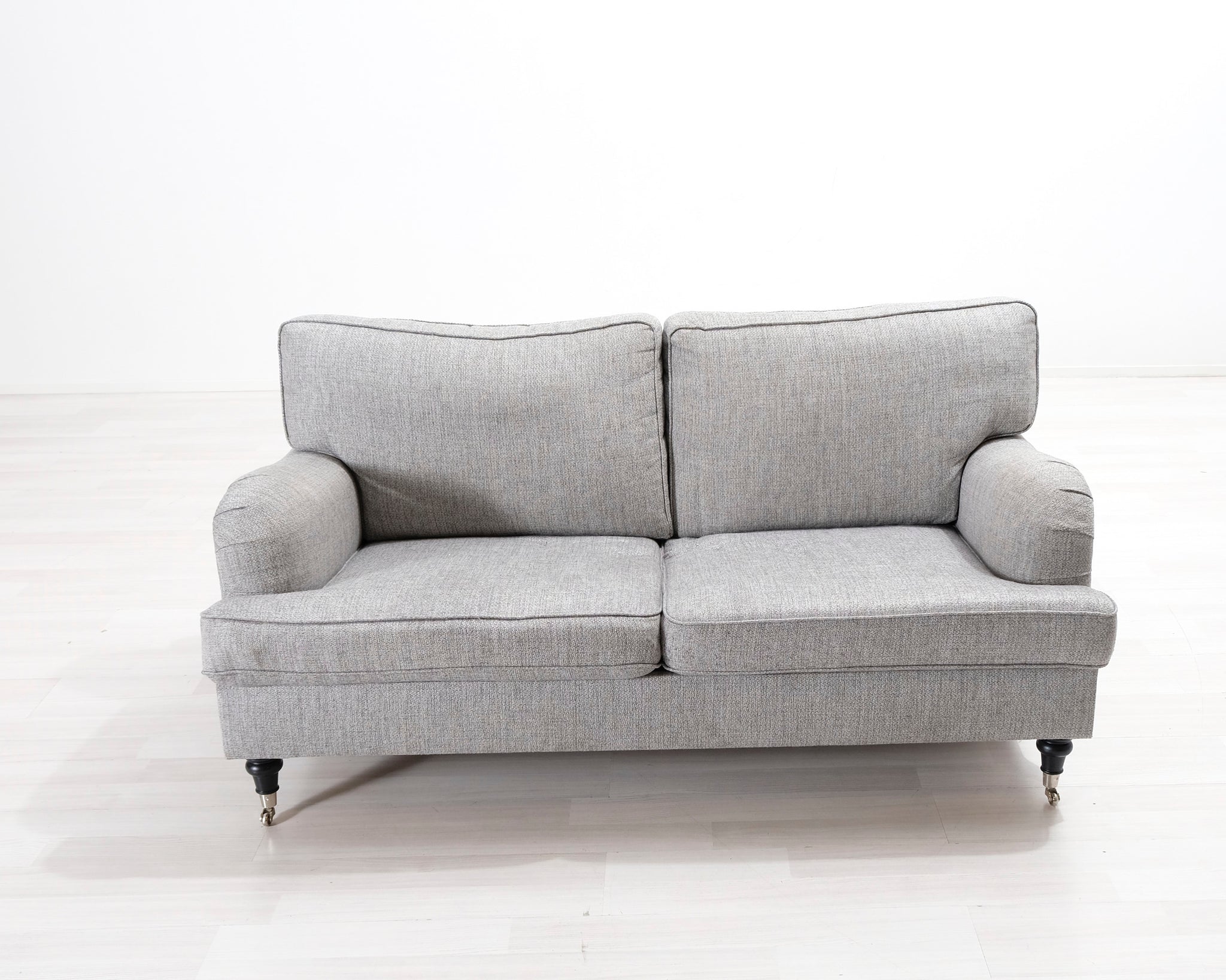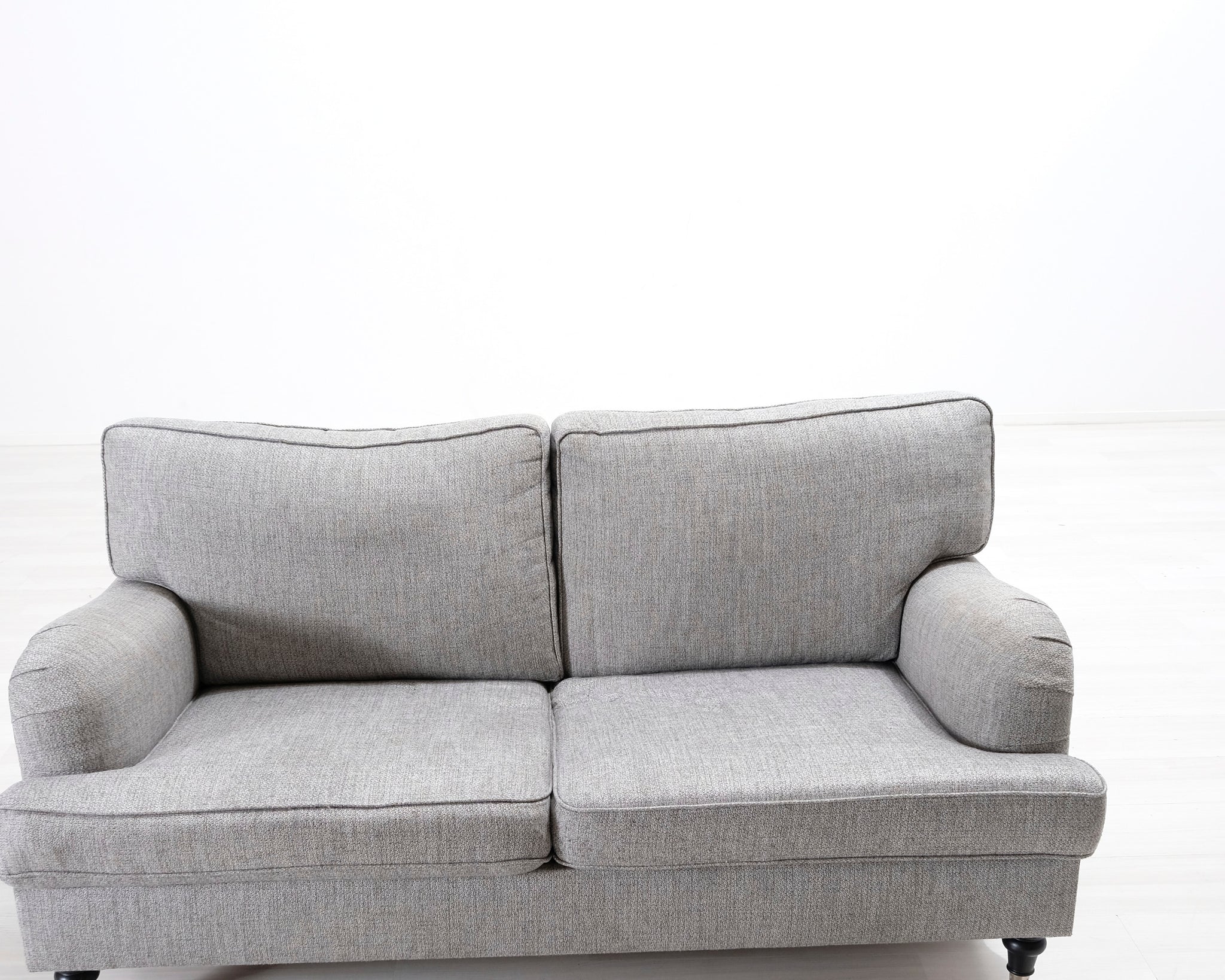 Kahdenistuttava vaaleanharmaa kangassohva. Valmistettu klassisen Howard-tyylin mukaisesti. Pianojalat.