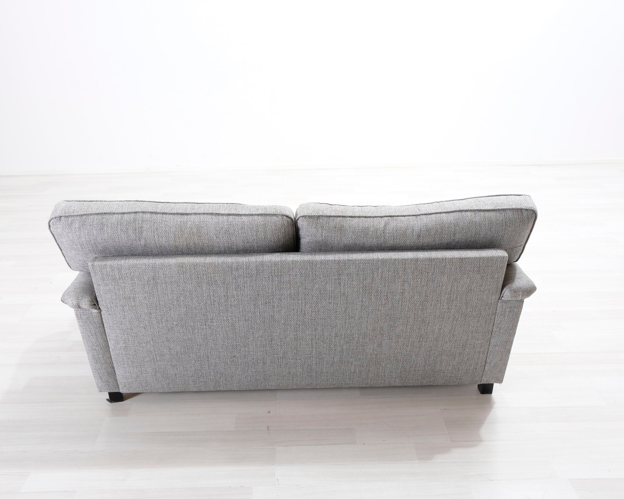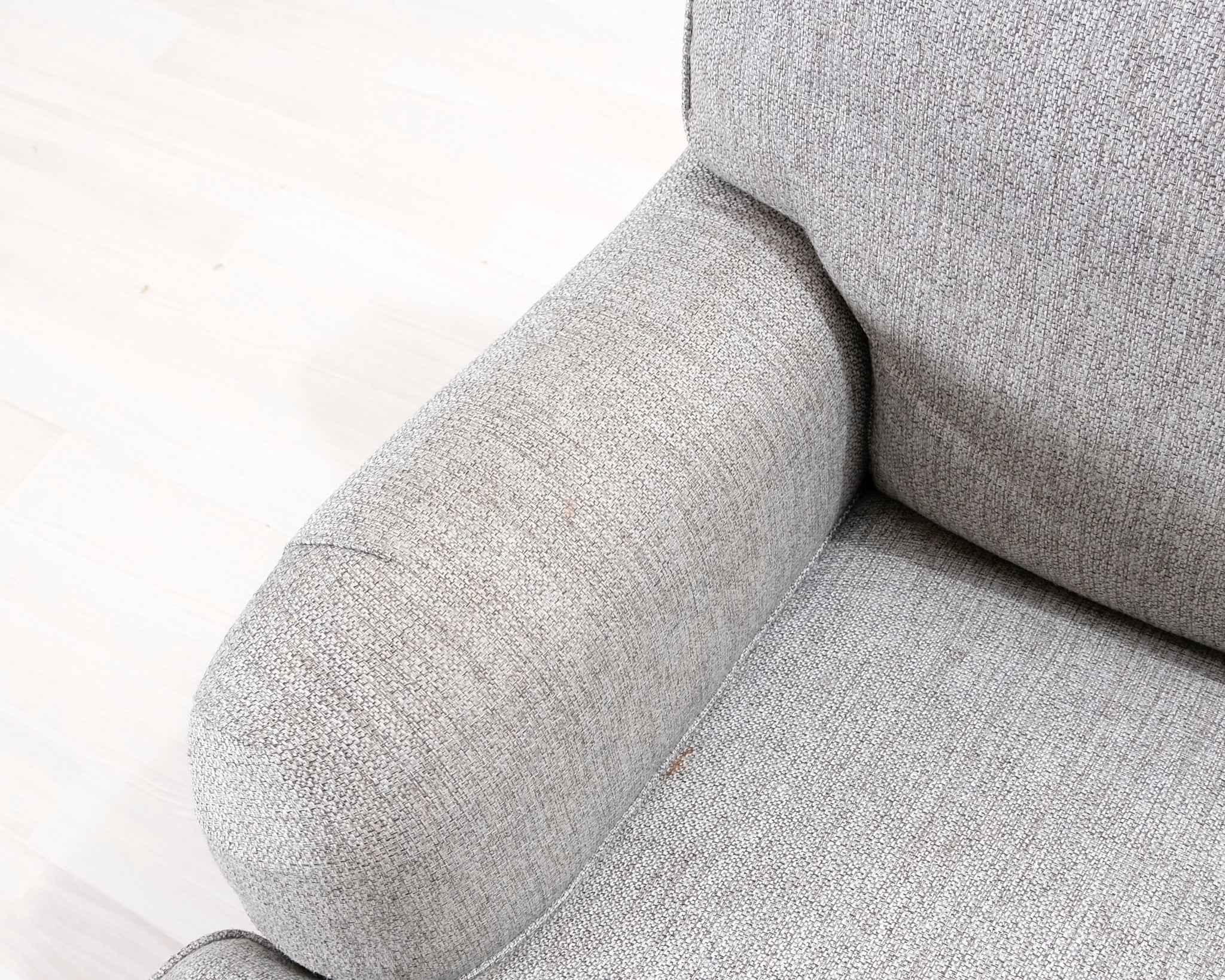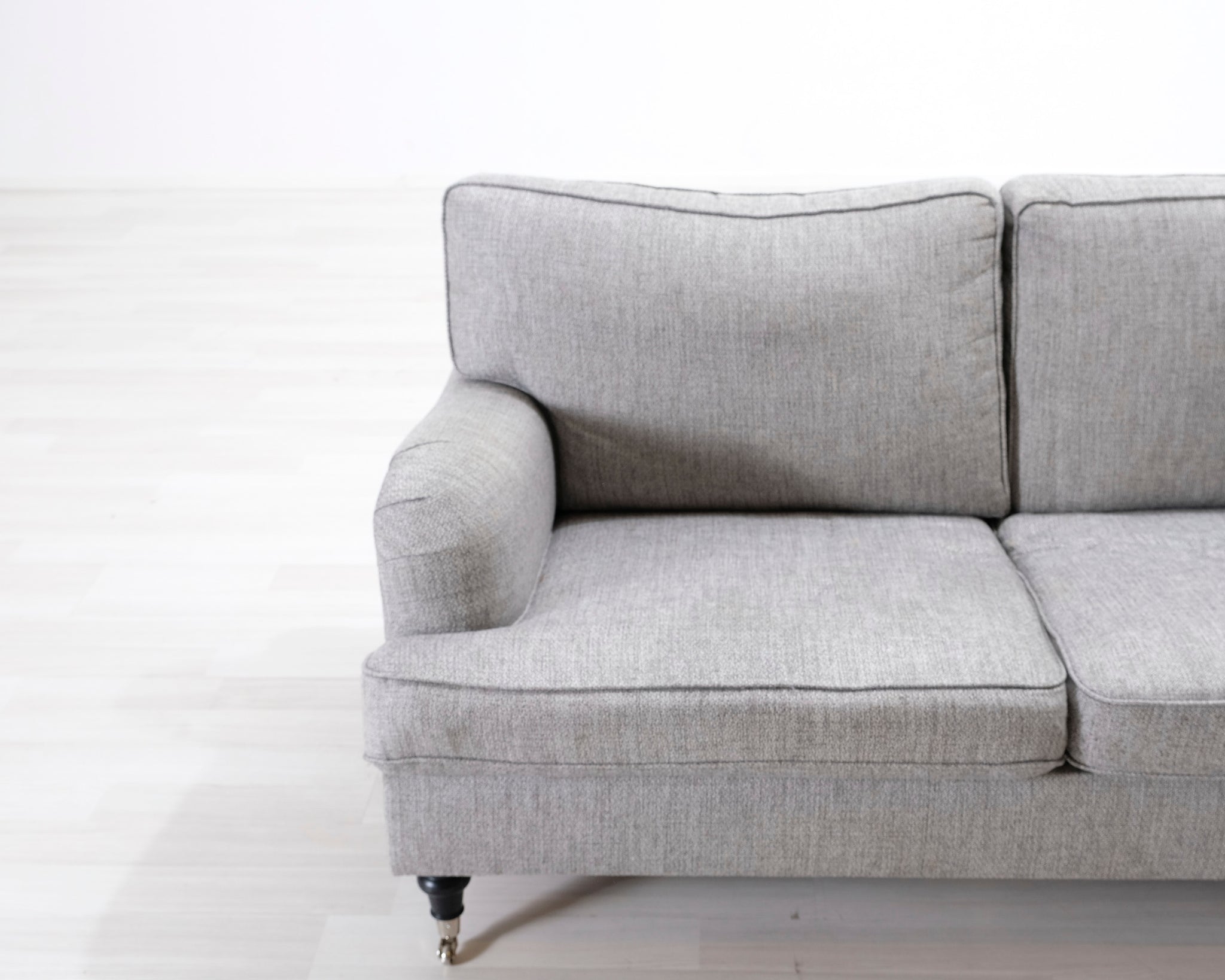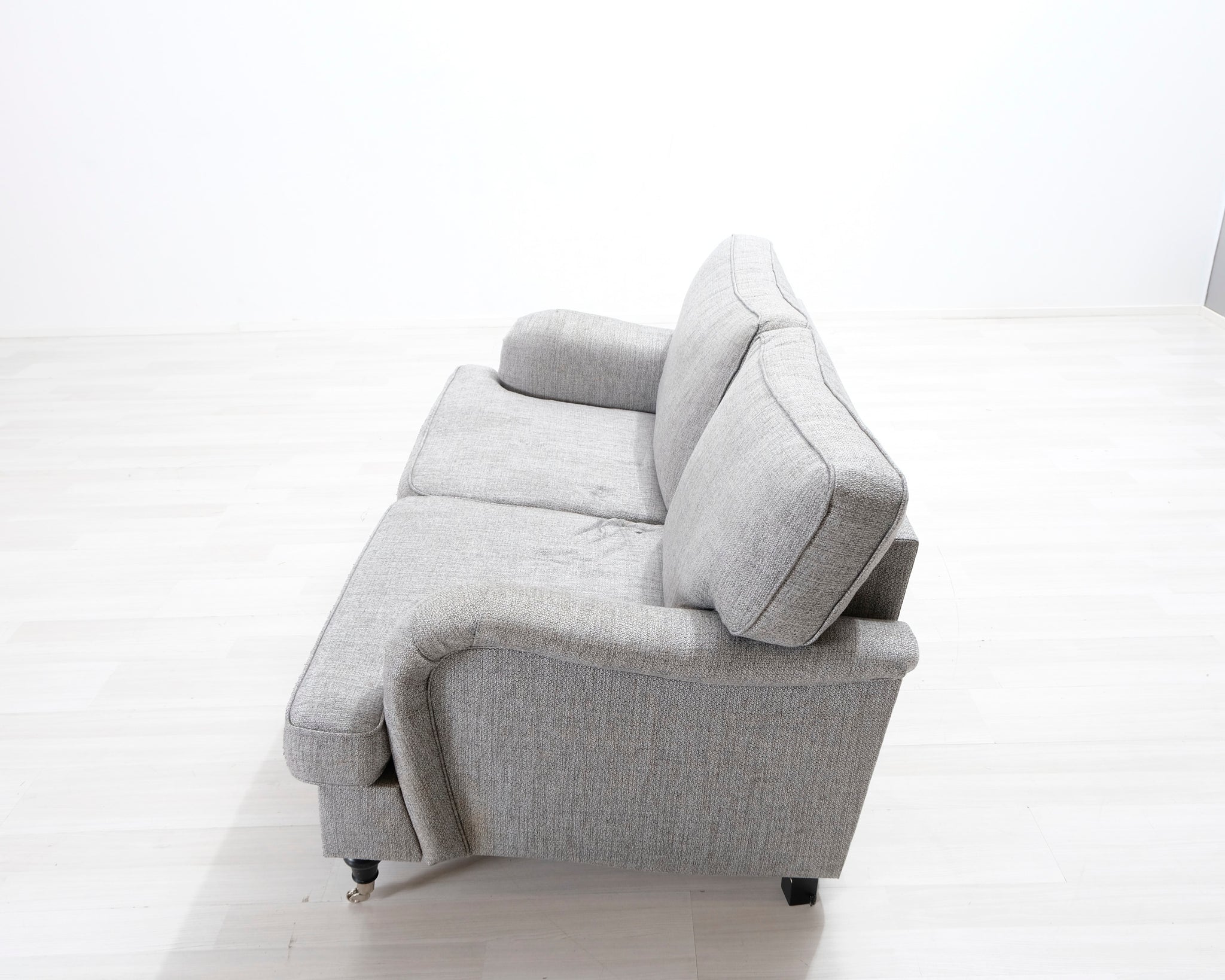 Kahdenistuttava vaaleanharmaa kangassohva. Valmistettu klassisen Howard-tyylin mukaisesti. Pianojalat.