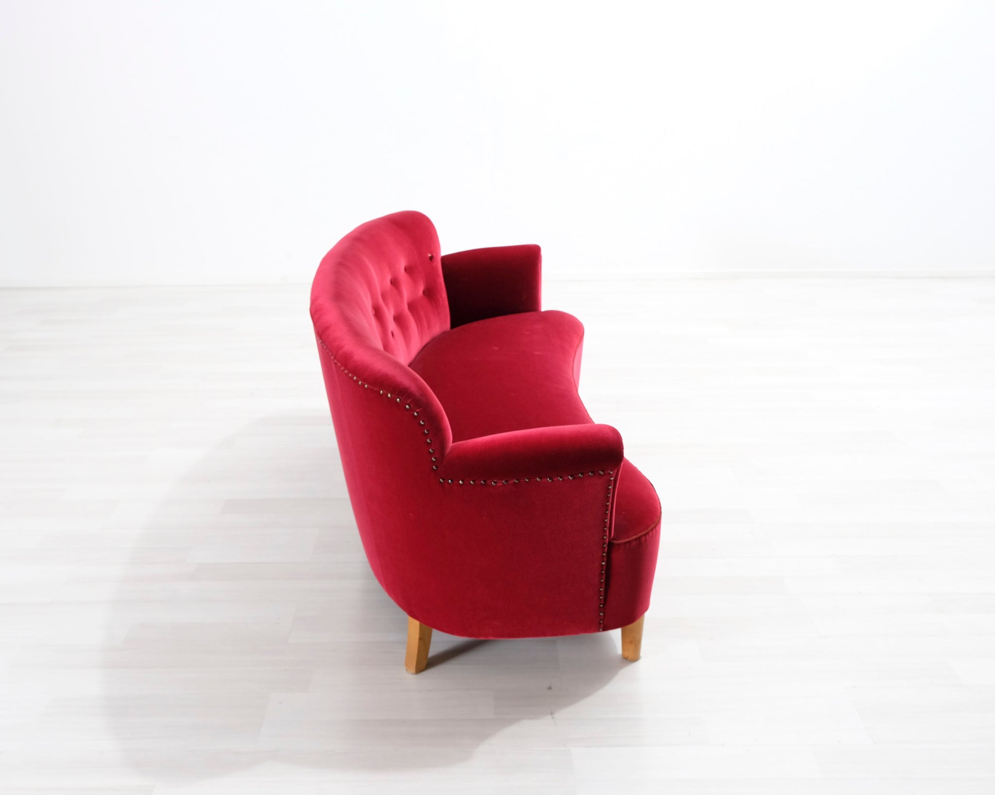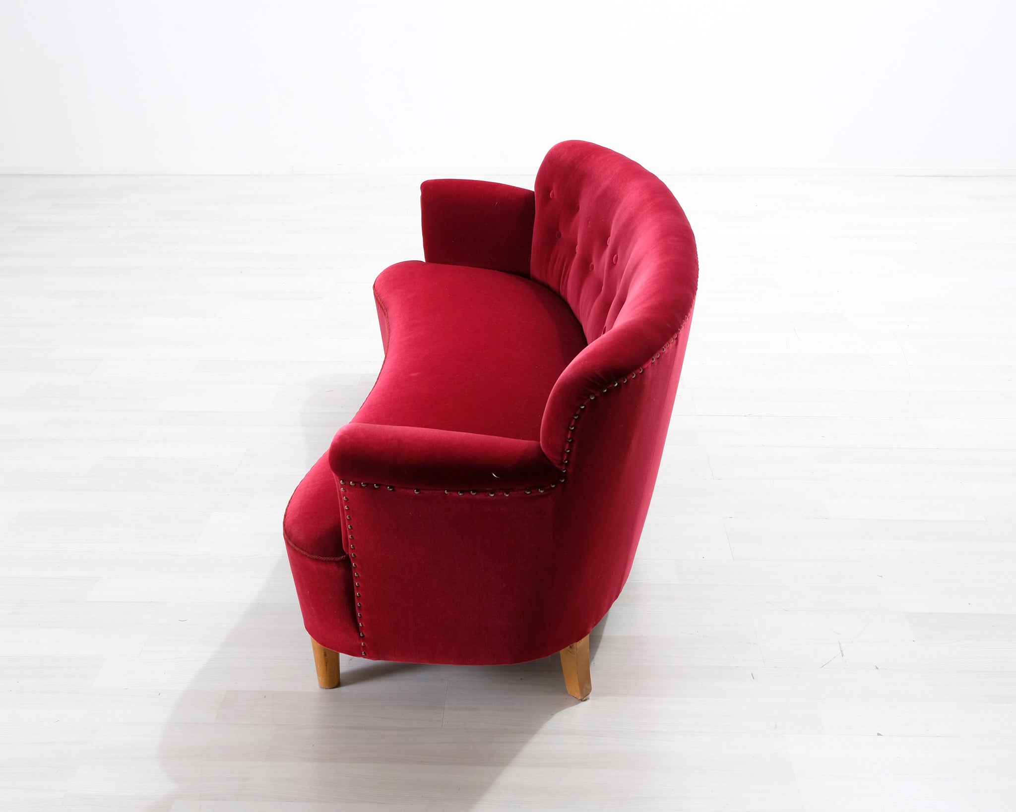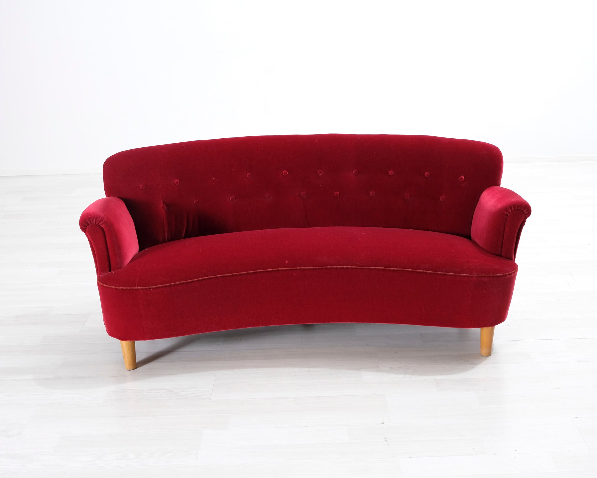 Tämä punainen samettisohva huokuu entisajan tyyliä! Sohvassa on kaareva selkänoja ja koristenapit.
