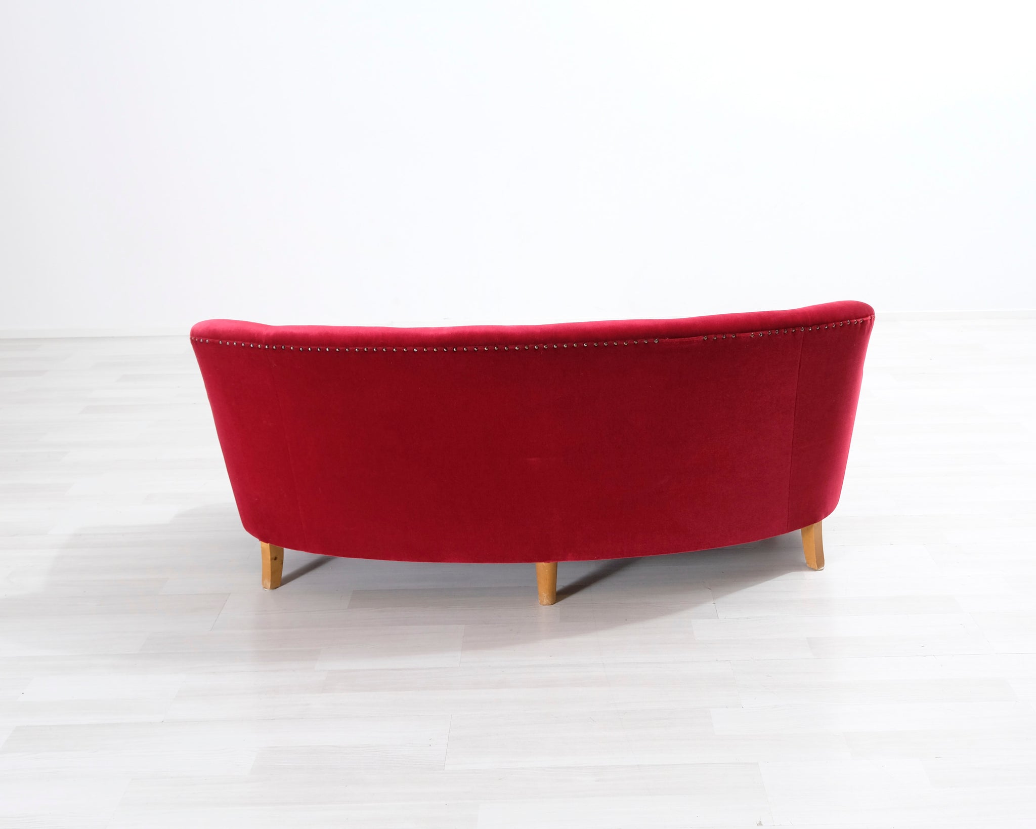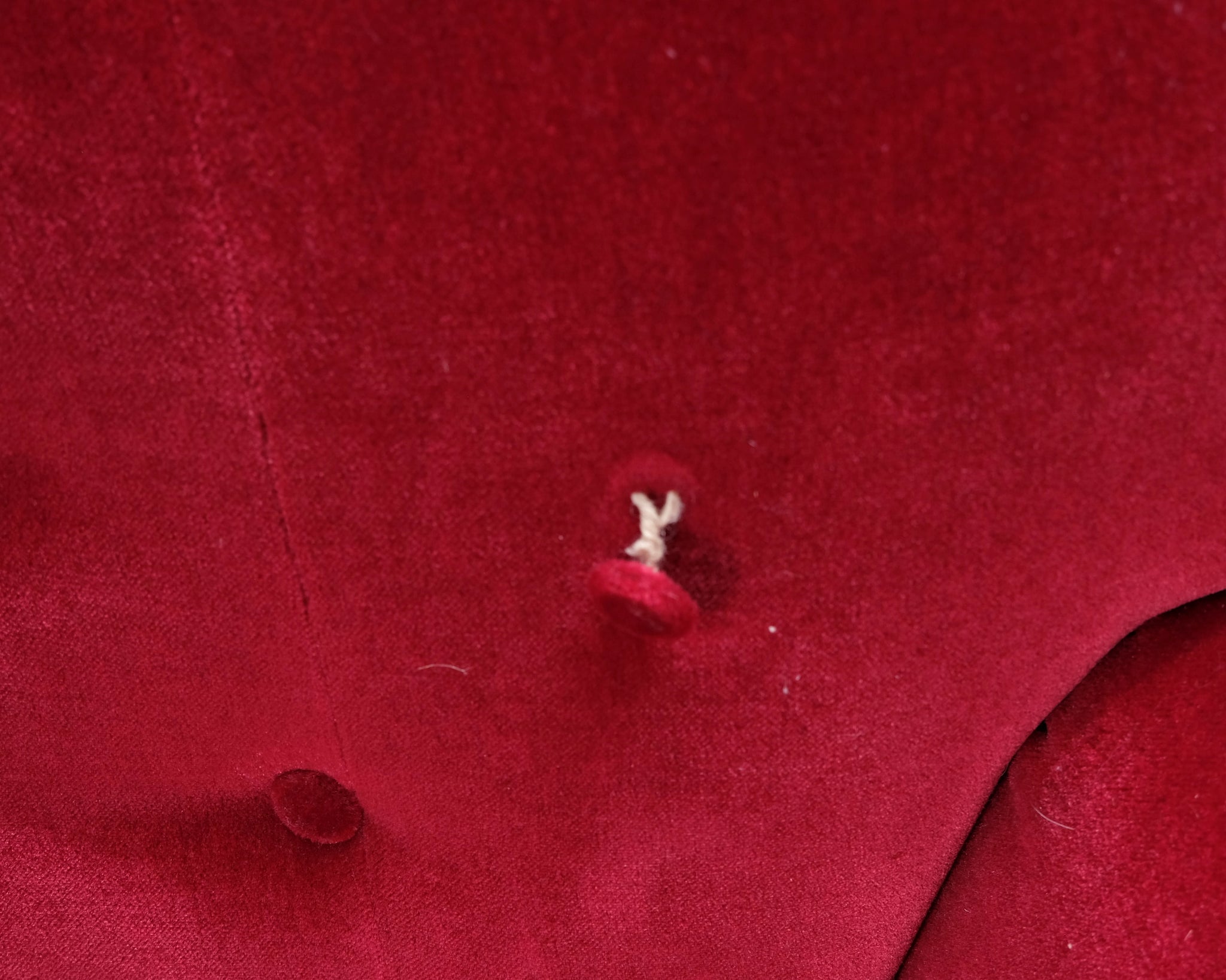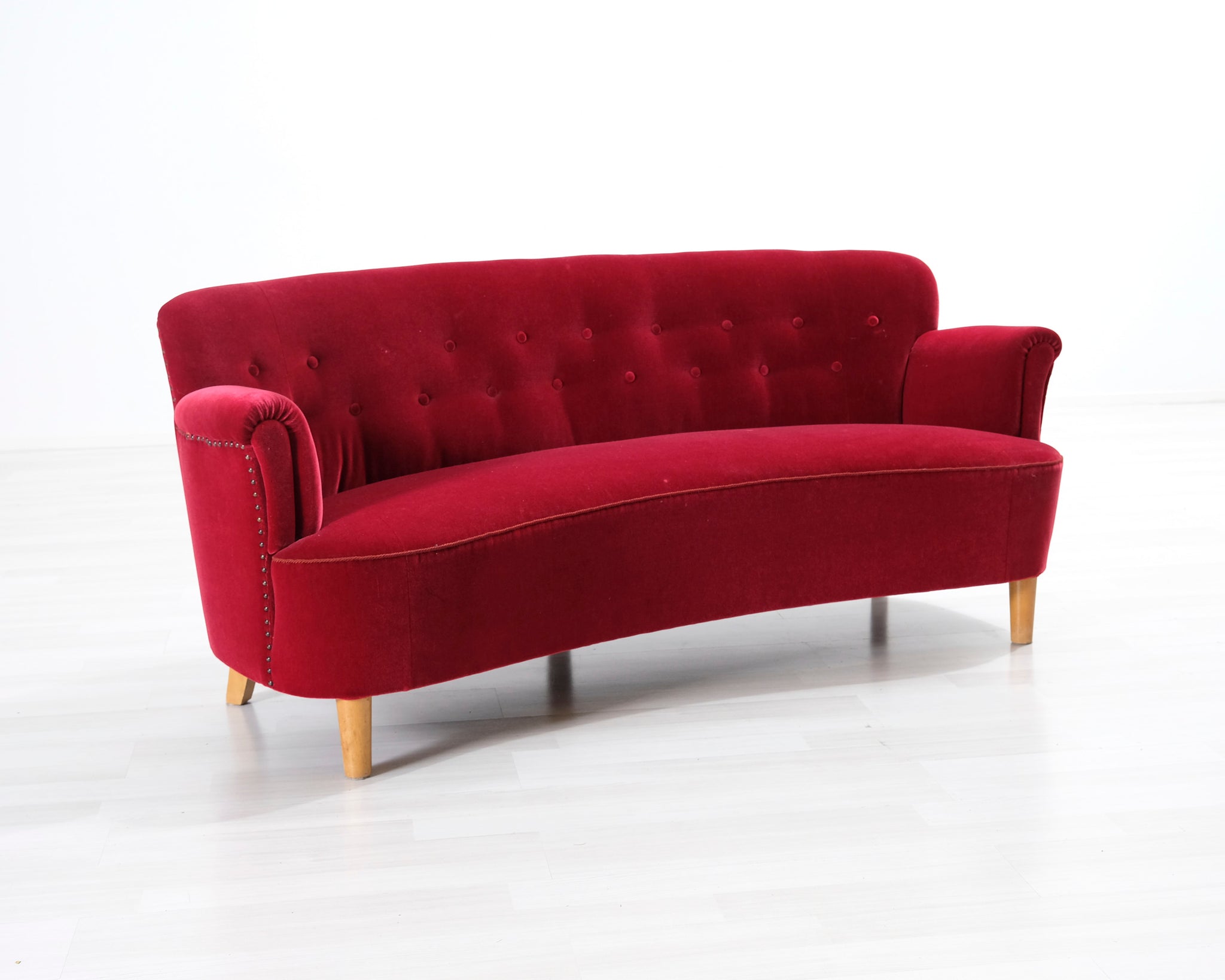 Tämä punainen samettisohva huokuu entisajan tyyliä! Sohvassa on kaareva selkänoja ja koristenapit.